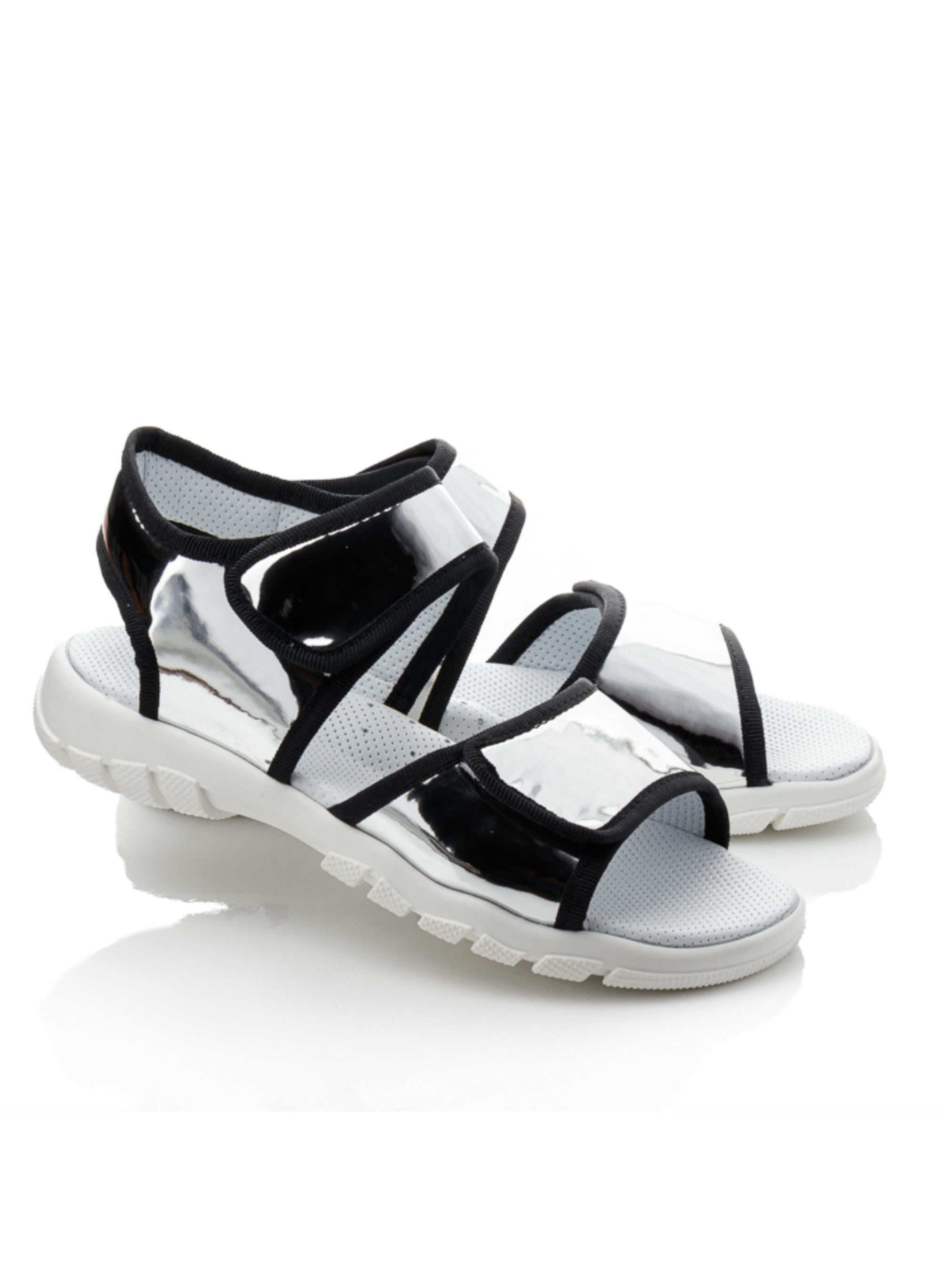 Сріблясті сандалі з чорною обробкою – стиль і комфорт в одному Ці сандалі не лише ефектно виглядають, а й забезпечують комфорт протягом усього дня. Верх виконаний із сучасного штучного матеріалу з дзеркальним сріблястим ефектом, а чорна окантовка надає дизайну виразності. Внутрішня шкіряна підкладка гарантує комфортну посадку та циркуляцію повітря, запобігаючи перегріву ніжок. Легка та гнучка підошва зменшує навантаження на стопу, а зручні липучки дозволяють швидко взути та зафіксувати взуття. Така модель стане стильним акцентом у гардеробі, доповнюючи як повсякденні, так і святкові образи. Чудовий вибір для тих, хто любить виділятися!