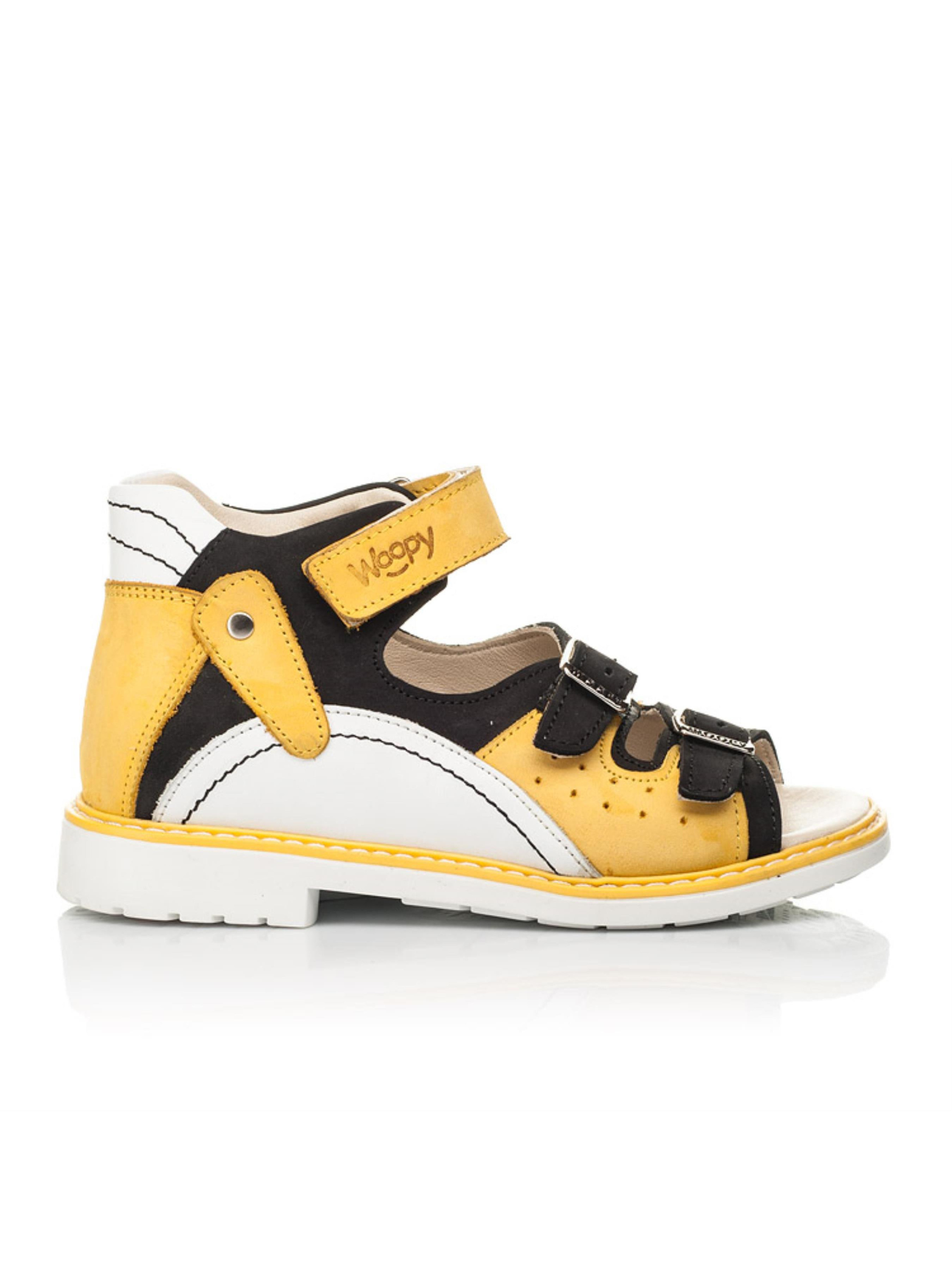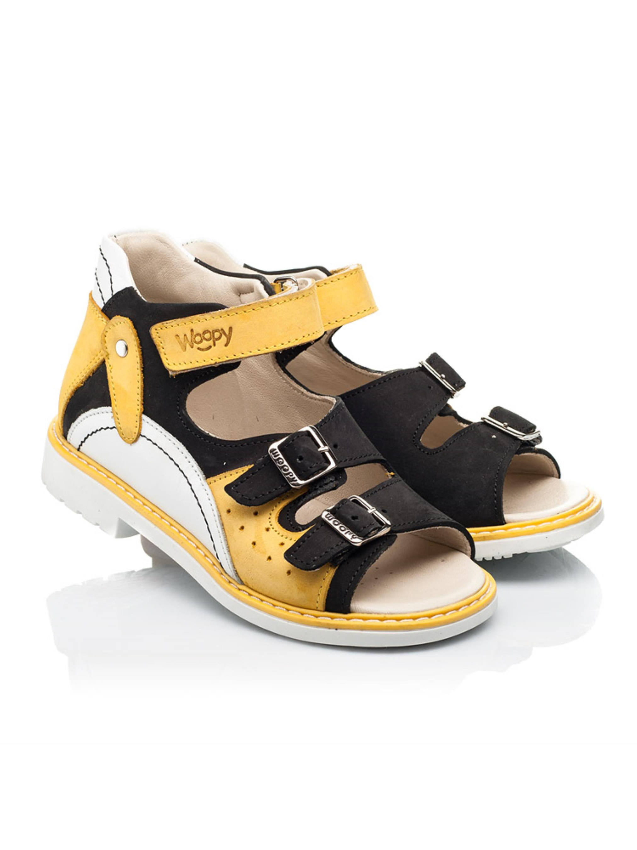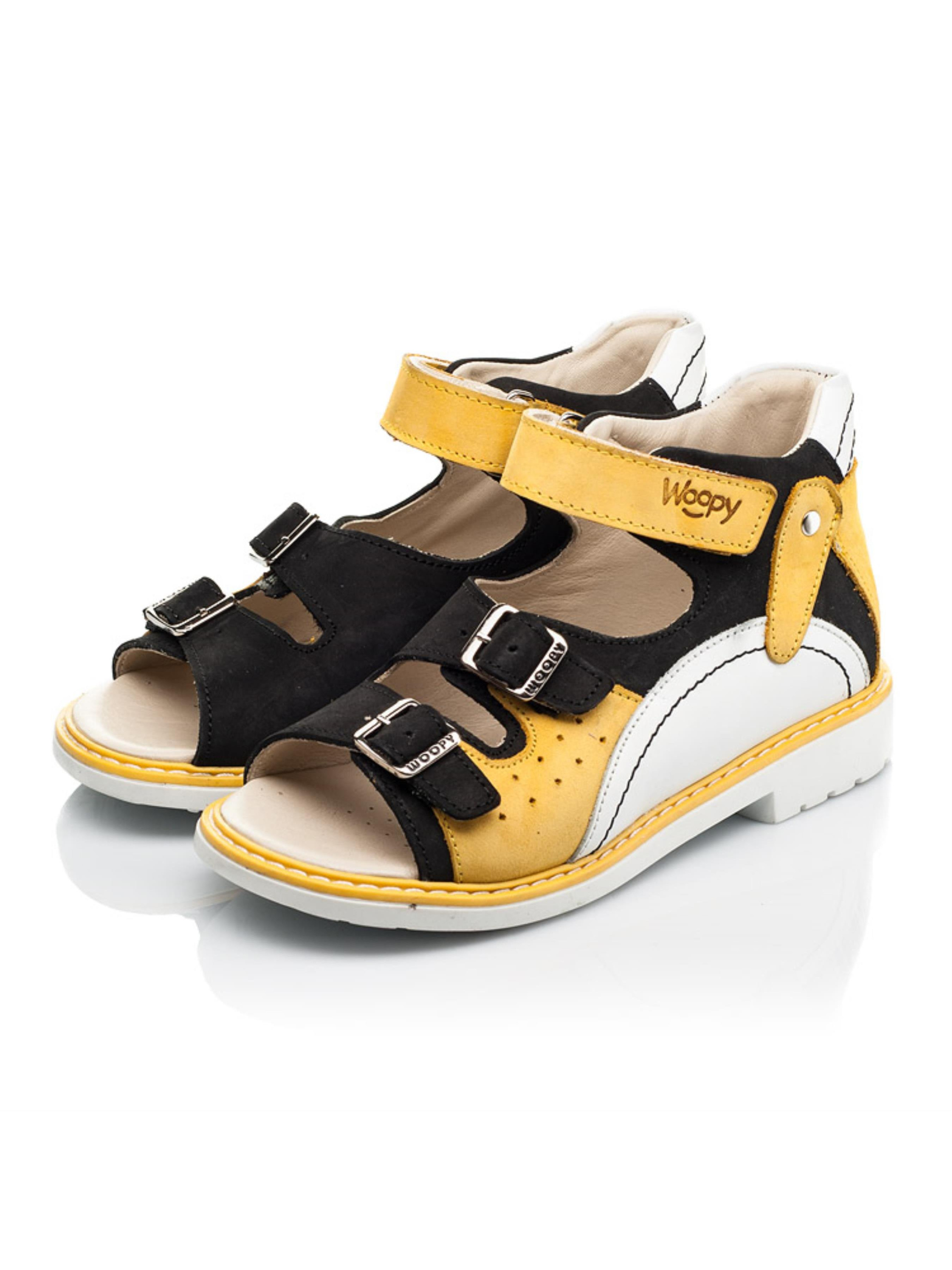Woopy Orthopedic представлений колекцією босоніжок, туфель, ортопедичних босоніжок/туфель з високим берцем, демісезонних та зимових черевик, які забезпечують профілактику та лікування плосковальгусної деформації стопи і мають важливі ортопедичні елементи дитячого взуття: каблук Томаса, жорсткий задник, супінатор та анатомічно правильну устілку.