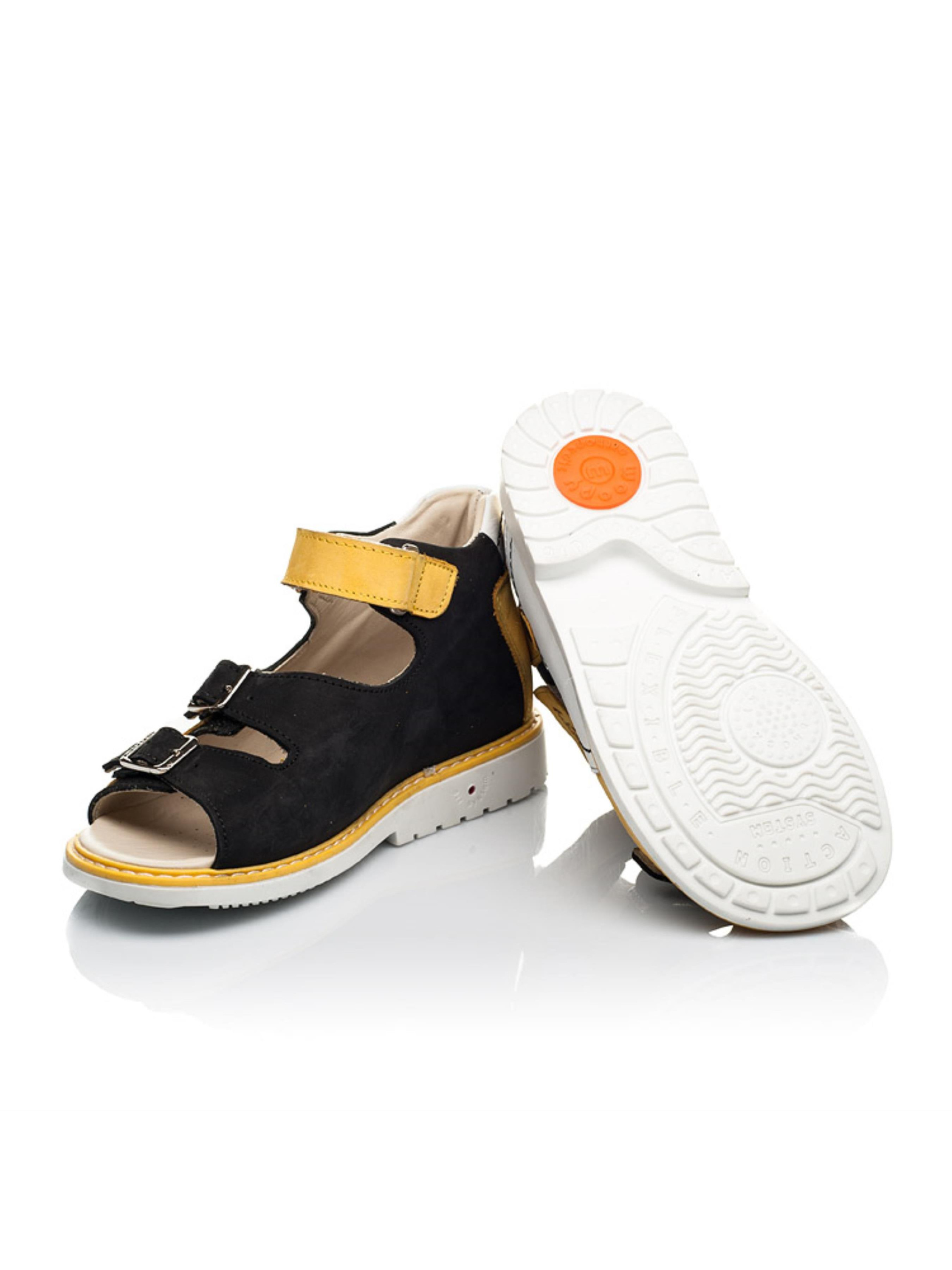 Неймовірно стильна кольорова гама вигідно виділяє цю пару дитячих босоніжок серед інших. Дитячі босоніжки для хлопчика для контрасту фактури пошиті в комбінації натурального нубука жовтого та чорного кольору, доповнені вставками з натуральної шкіри класичного білого кольору. Оригінальна модель босоніжок доповнена фігурною прошивкою та перфорацією. Дитячі босоніжки для хлопчика відповідають усім вимогам дитячого взуття: каблук Томаса, жорсткий задник, супінатор та анатомічно правильна устілка. Матеріал підкладки та устілки - натуральна шкіра. В якості застібки в цій моделі босоніжок використовується надійна липучка, яка доповнена двома металевими застібками, які дозволять відрегулювати повноту ніжки.
