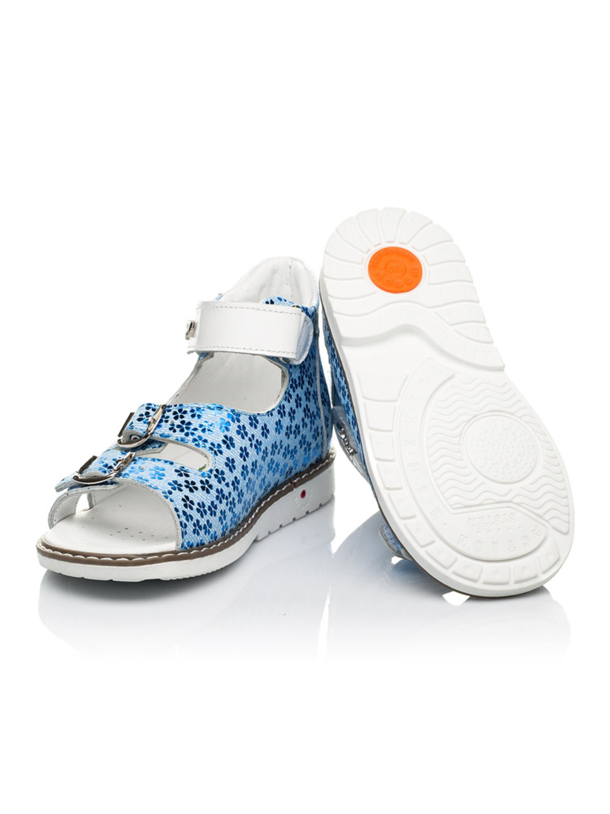 Такі босоніжки для дівчинки - 100% шедевр взуттєвого мистецтва. Завжди цікава модель босоніжок для дівчинки створена з натурального нубука неймовірного блакитного кольору. Застосування напилення дозволило створити неповторний квітковий візерунок. Дитячі босоніжки для дівчинки мають усі важливі елементи дитячого взуття: каблук Томаса, супінатор, жорсткий задник та анатомічно парвильну устілку. Всі ці елементи важливі для правильного формування та положення ніжки у взутті. Надійну фіксацію стопи забезпечать металеві застібки, а для пришвидшення процесу взування передбачена надійна застібка-липучка. Для контрасту фактури та кольору застібка-липучка створена з натуральної шкіри вишуканого білого кольору, яка гармонійно поєднана в кольоровій гамі з підошвою.
