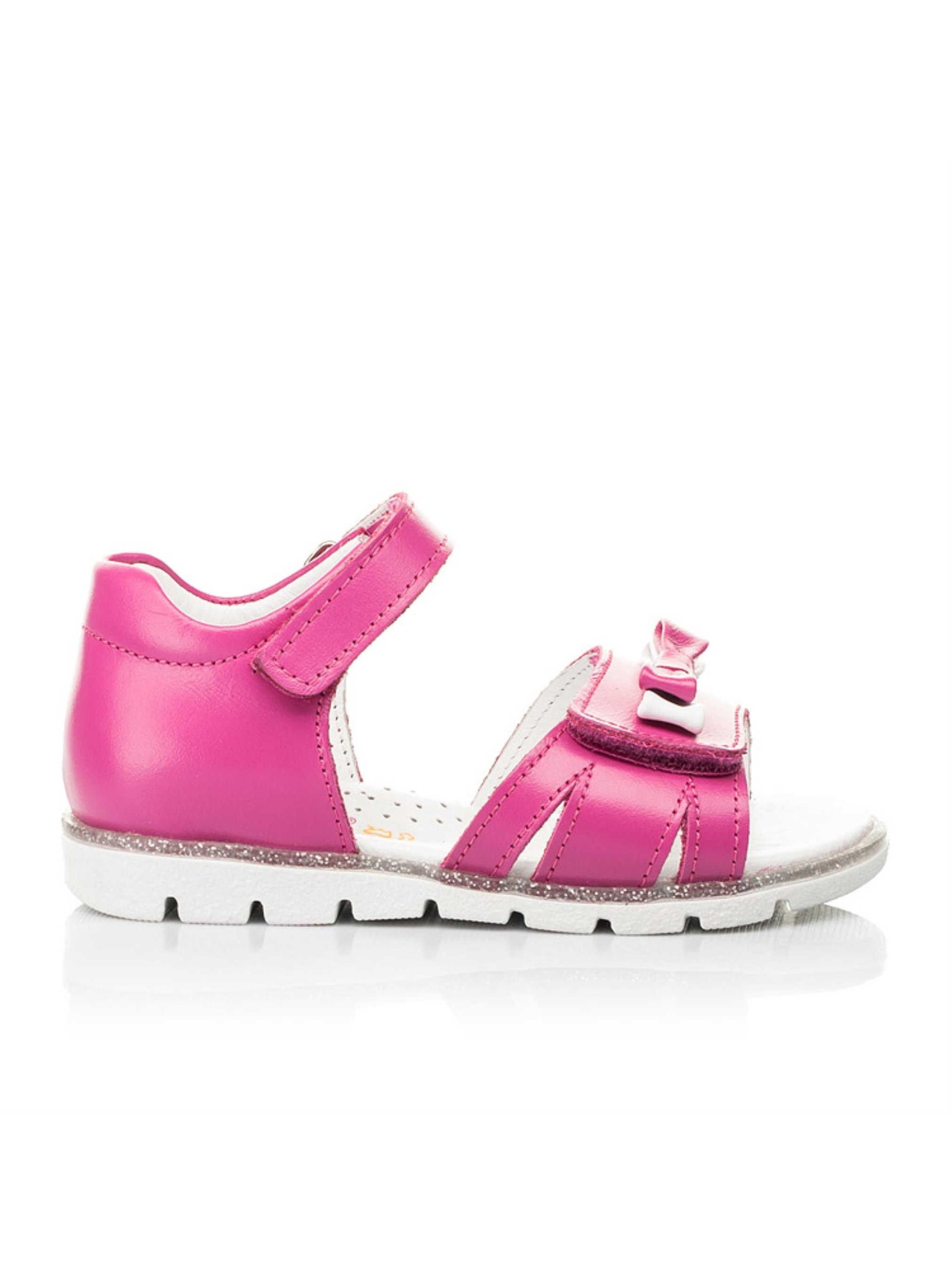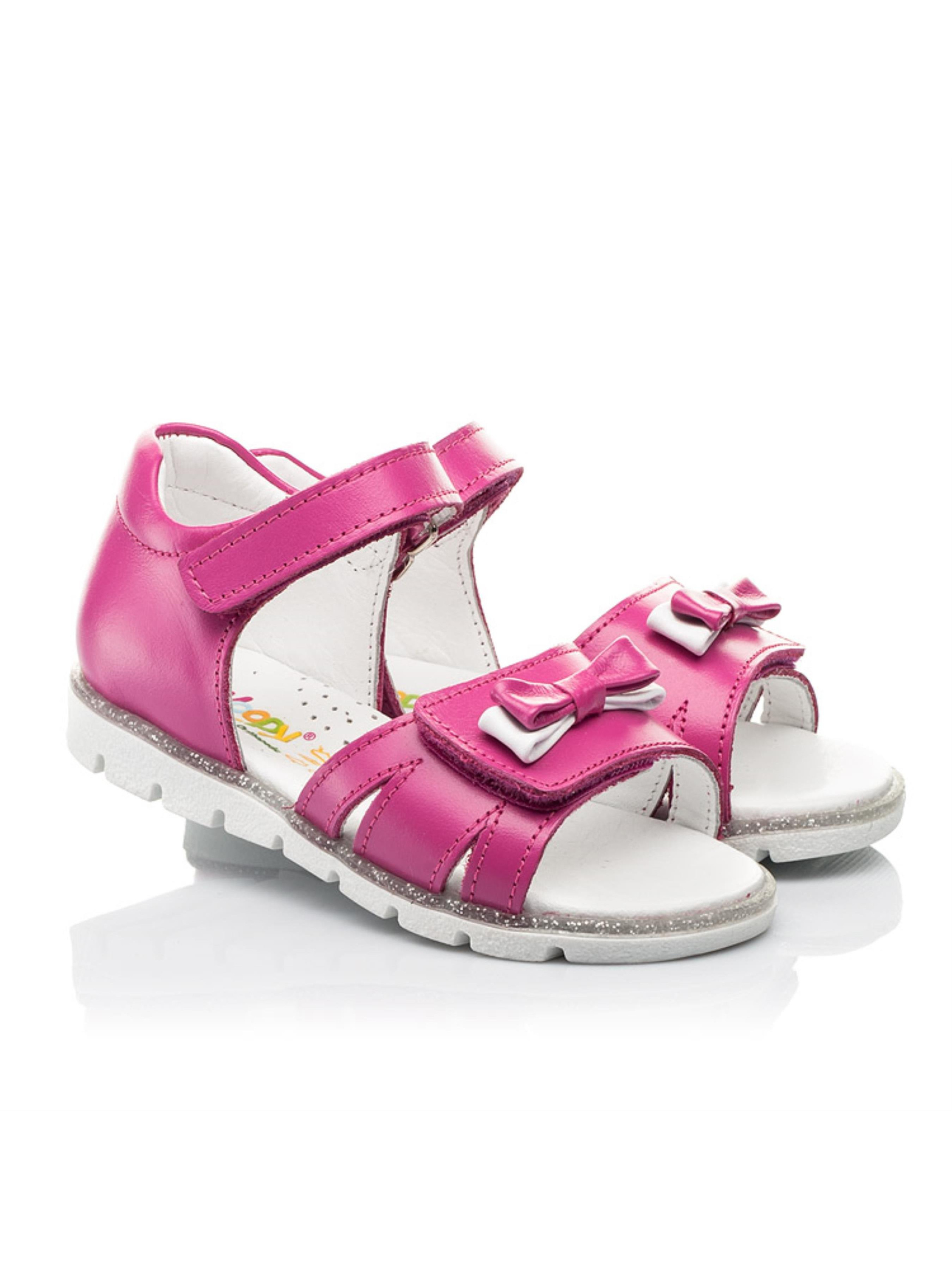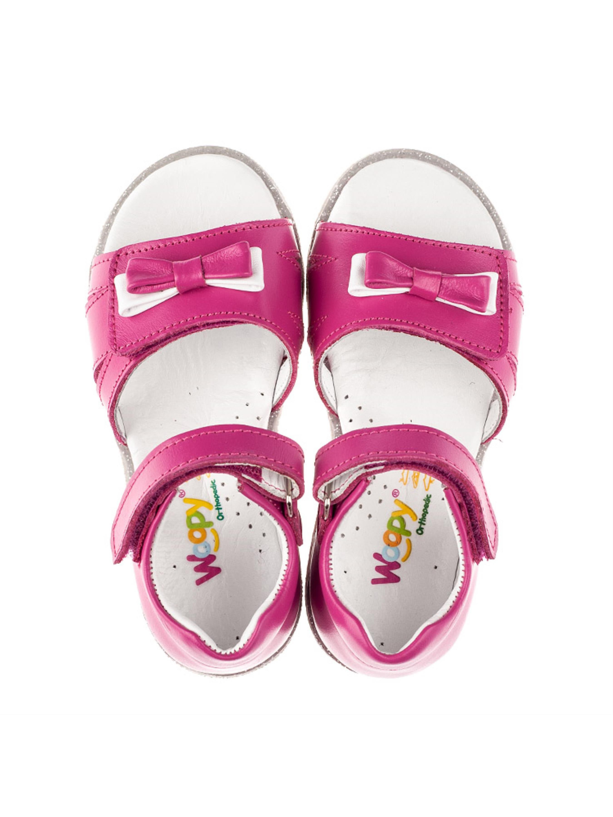 Стримані та легкі босоніжки для дівчинки від майстрів взуттєвого бренду Woopy створені для максимально комфортних прогулянок. Дитячі босоніжки для дівчинки створені з натуральної шкіри малинового кольору. Матеріал підкладки та устілки - натуральна високоякісна шкіра. Підошва в босоніжках легка та гнучка, по периметру оздоблена декоратисним кантом з срібними блискітками. Зручність взування на надійну фіксацію на ніжці забезпечать липучки. Широка застібка-липучка дозволить відрегулювати повноту ніжки. Вишуканим доповненням дизайну виступає маленький бантик біло-малинового кольору, який прикрашає широку липучку. Такі комфортні деталі як анатомічно правильна устілка з подушечкою під зведення стопи та жорсткий задник подарують легкість на насолоду від тривалих прогулянок.