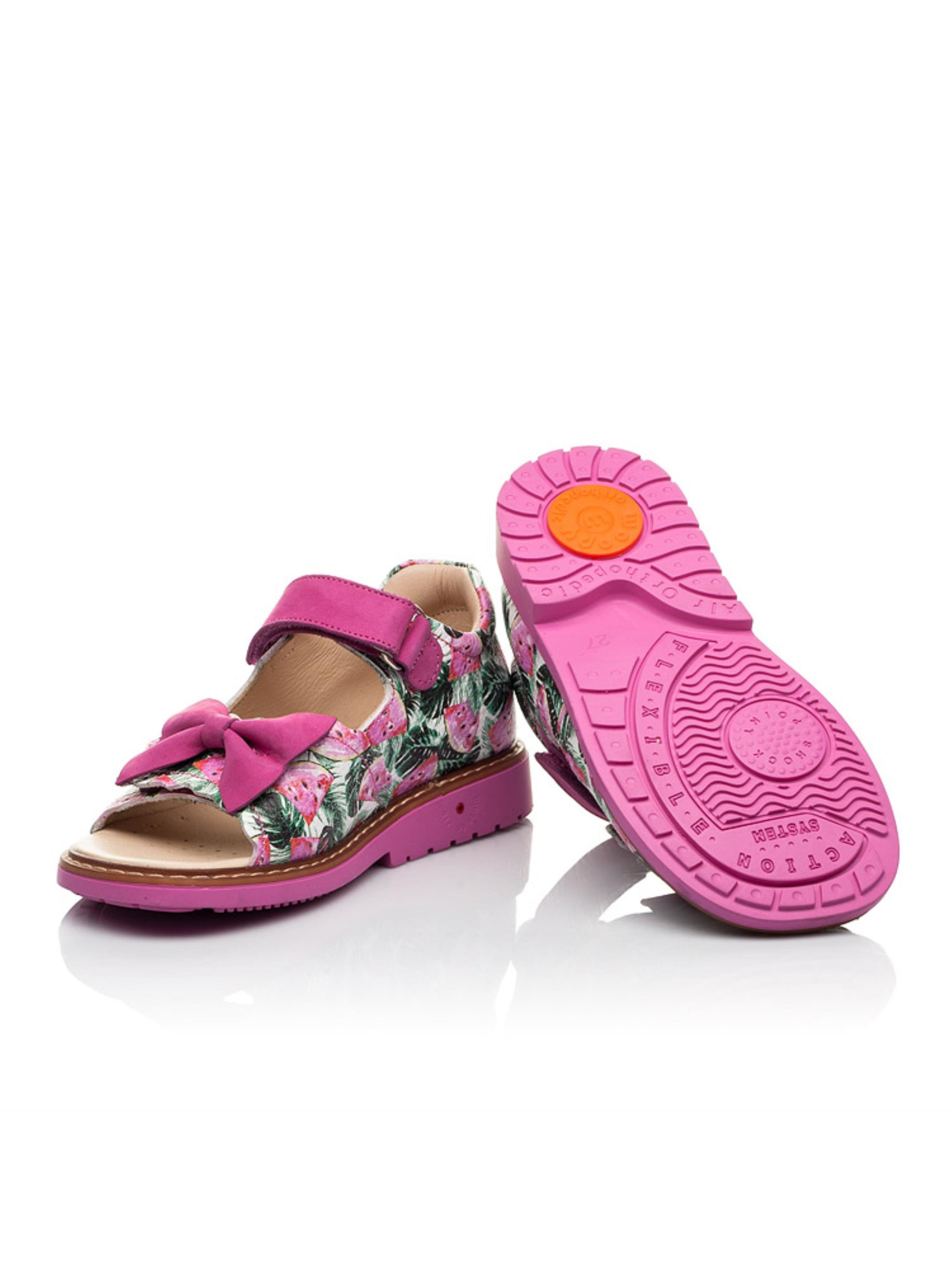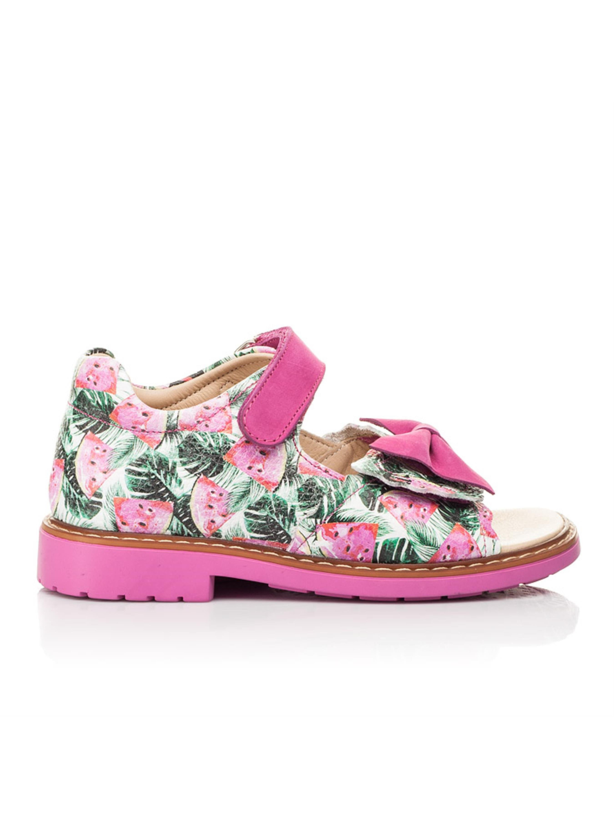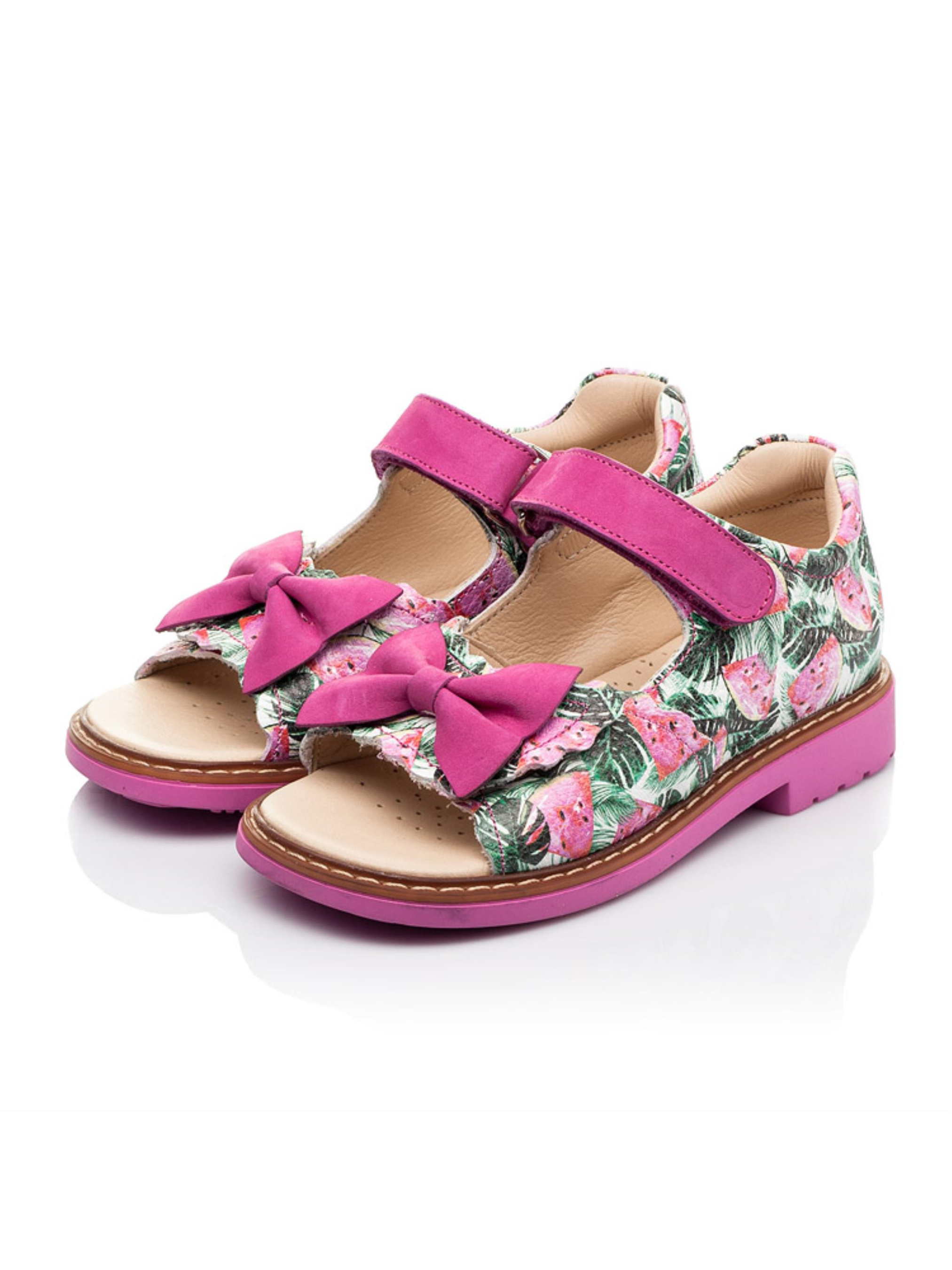 Надзвичайно стильні та соковиті дитячі босоніжки для дівчинки з неповторним кавуновим принтом створені з натуральної шкіри, матеріал підкладки та устілки - натуральна шкіра. Швидкість та зручність взування гарантують дві надійні липучки. Для контрасту кольору та фактури застібки-липучки пошиті з натурального нубука малинового кольору. Головними комфортними деталями такої пари босоніжок виступають такі елементи дитячого взуття: каблук Томаса, жорсткий задник, супінатор та анатомічно правильна устілка з подушечкою під зведення стопи. Милим доповненням моделі виступає бантик, який прикрашає широку застібку-липучку.