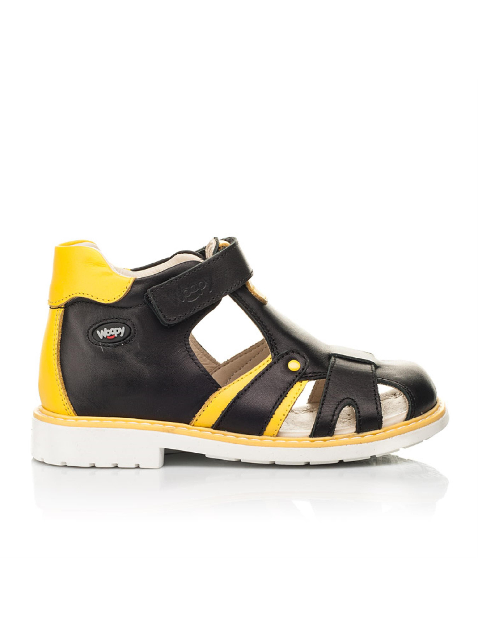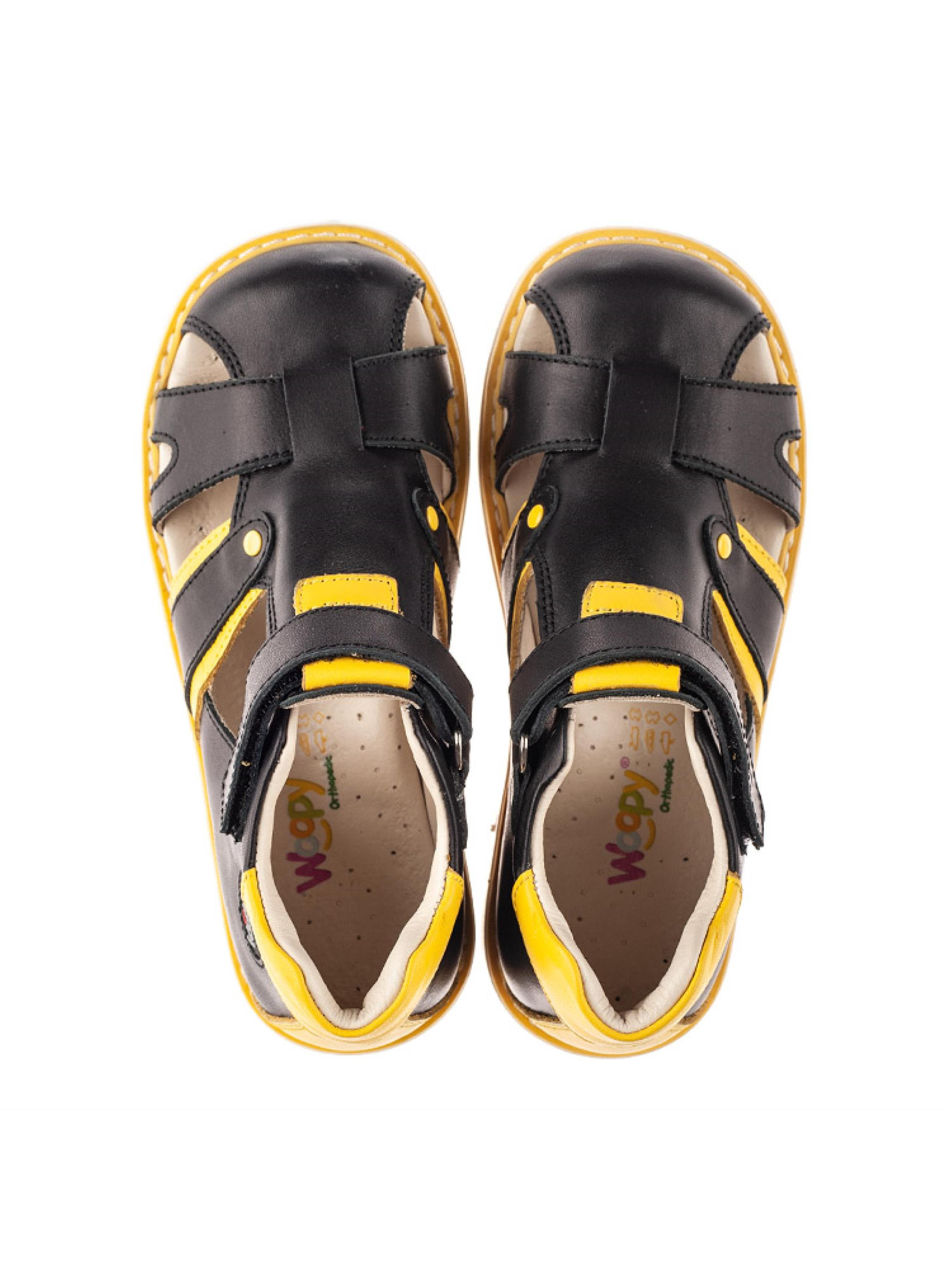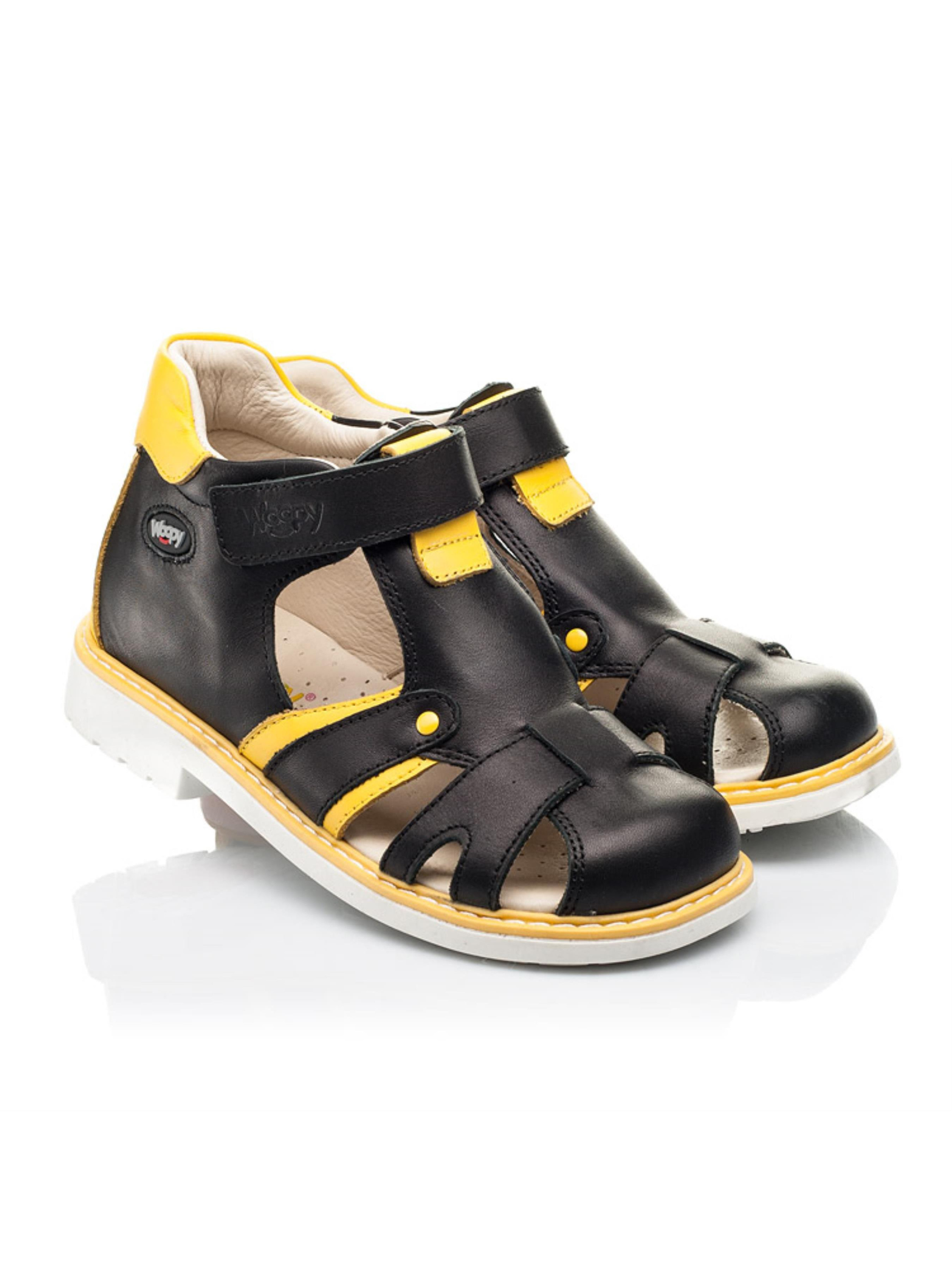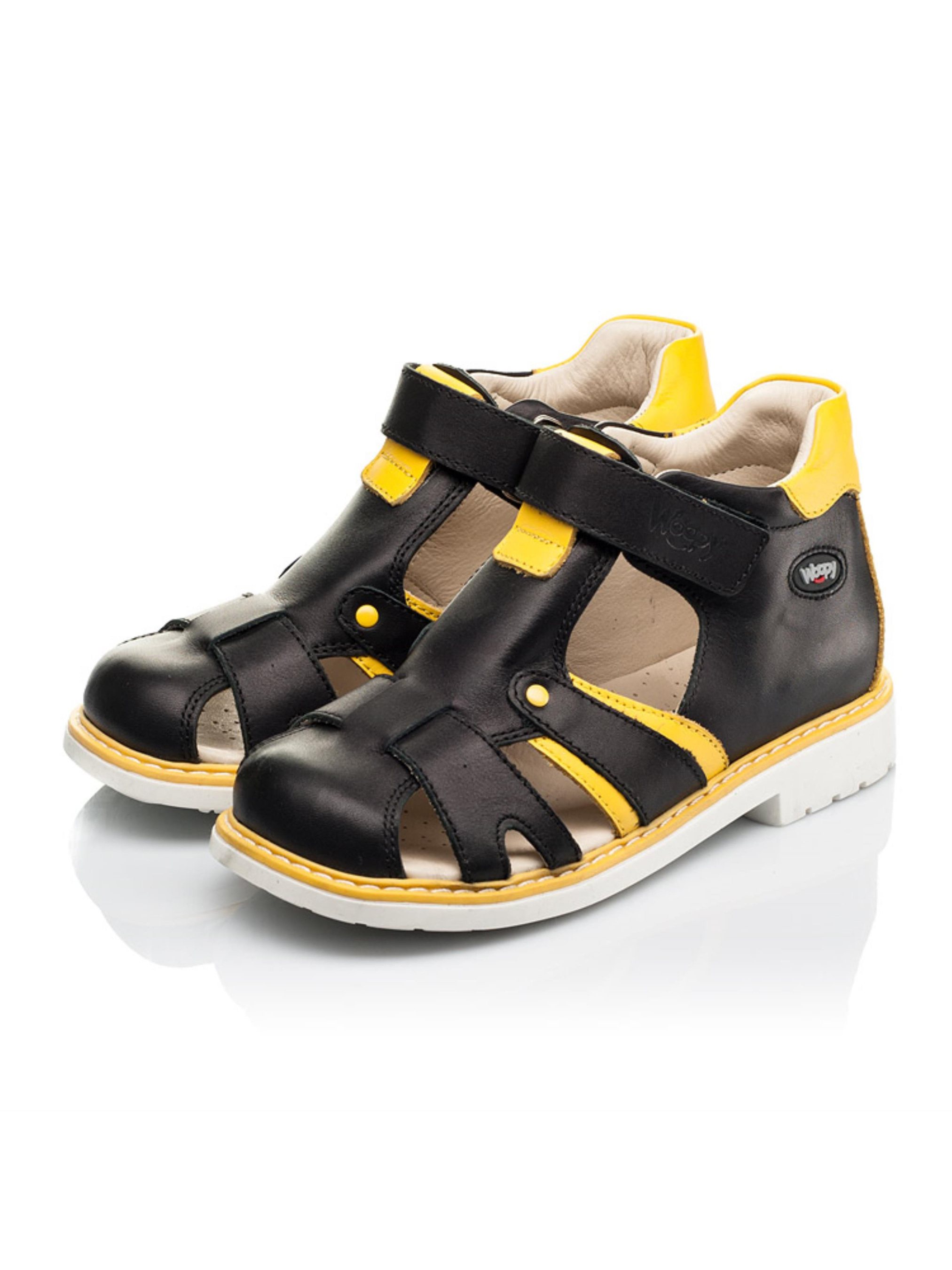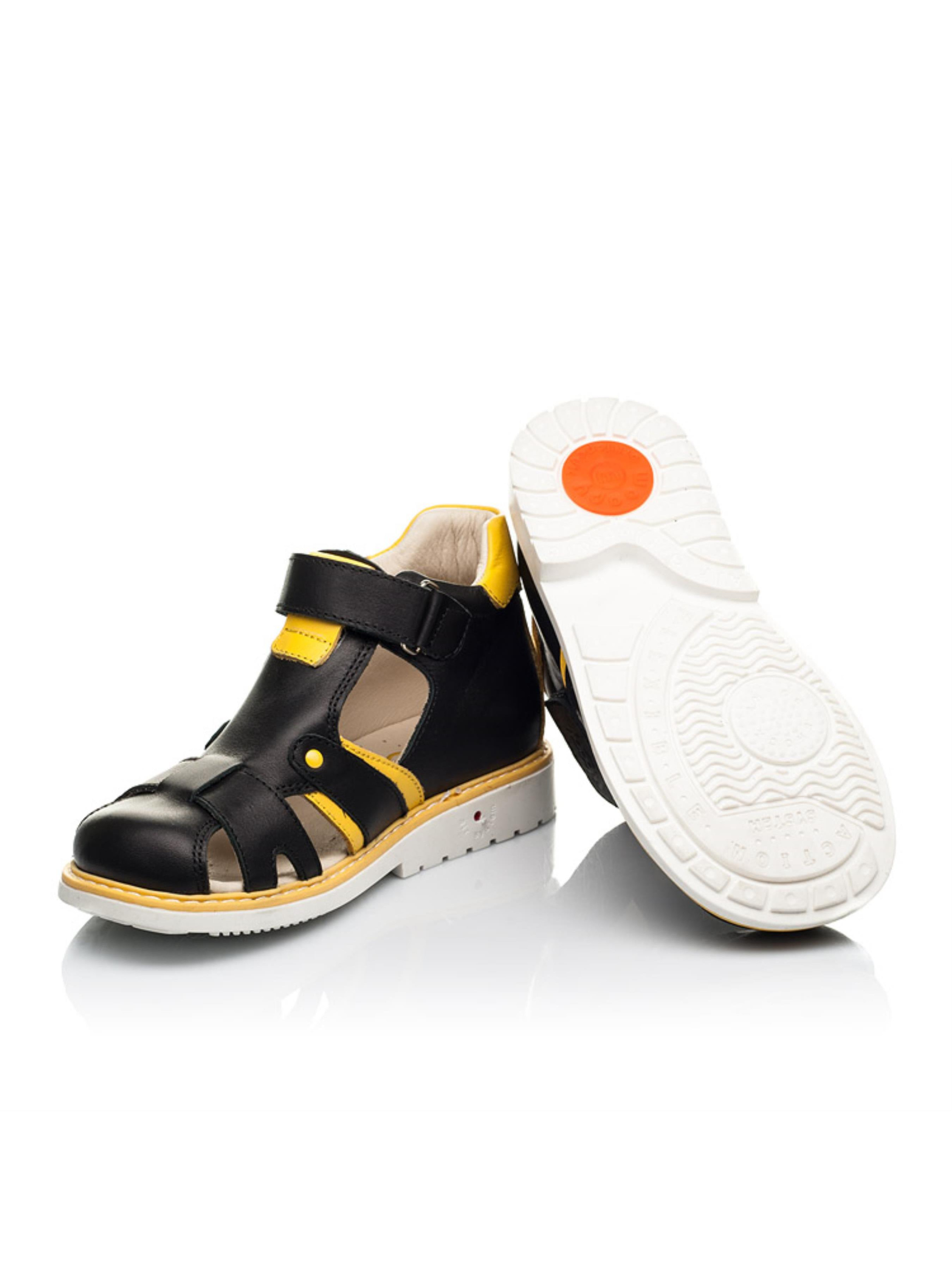 Закриті дитячі босоніжки для хлопчика без зусиль стануть улюбленою парою взуття на літо. Неординарні дитячі босоніжки для хлопчика пошиті з натуральної шкіри класичного вугільно-чорного кольору, доповнені контрастними вставками жовтого кольору. Така стильна комбінація кольорів надає цій парі вишуканості та оригінальності. Аби дитячим ніжкам було максимально комфортно в жарку пору року босоніжки мають наскрізні отвори для циркуляції повітря. В таких босоніжках гарантована здорова хода, адже босоніжки для хлопчика пошиті з врахуванням усіх ортопедичних складових дитячого взуття. Каблук Томаса, жорсткий задник,супінатор та анатомічно правильна устілка забезпечать правильне положення ніжки у взутті. Для пришвидшення процесу взування в якості застібки використовується липучка.