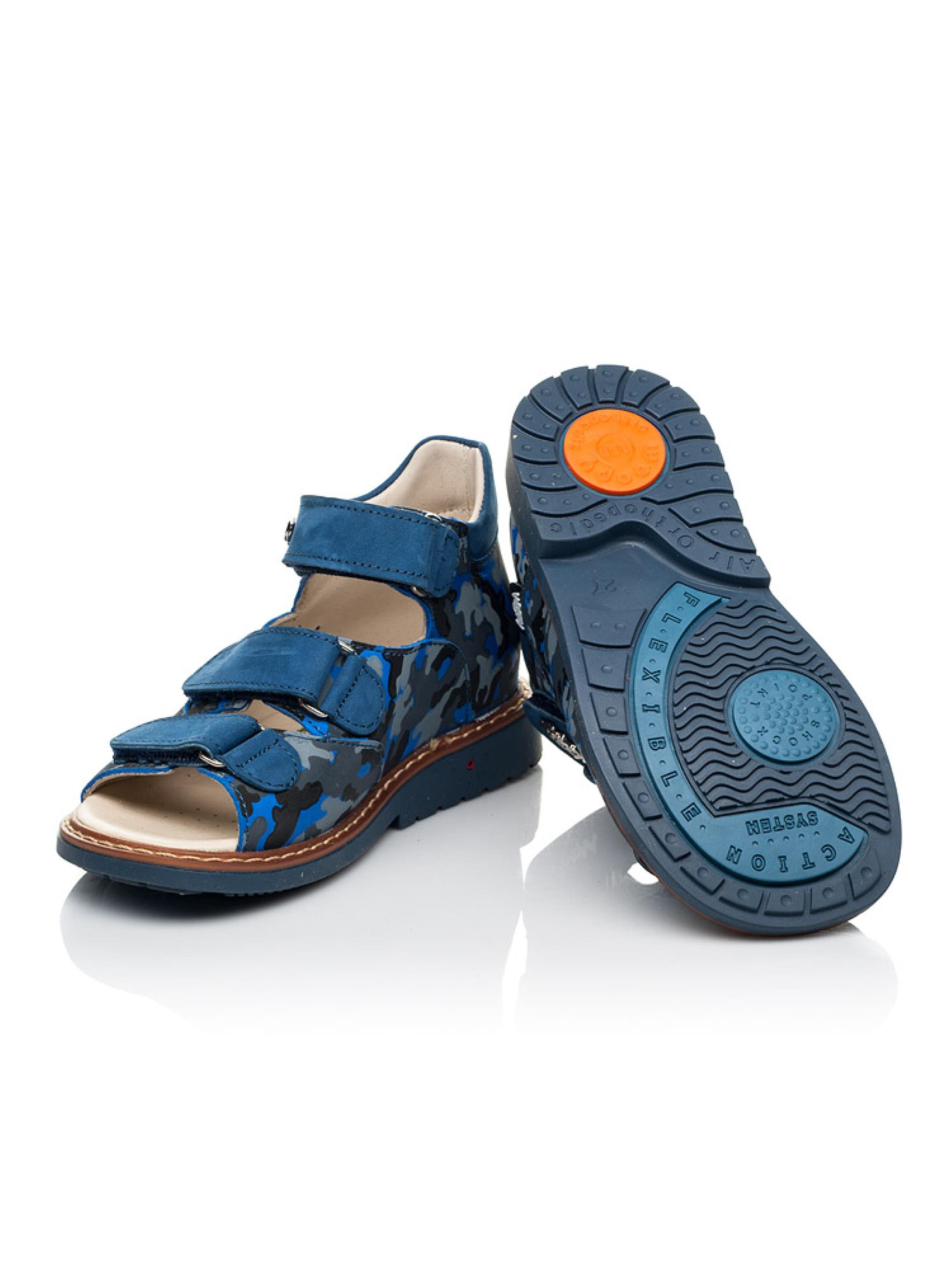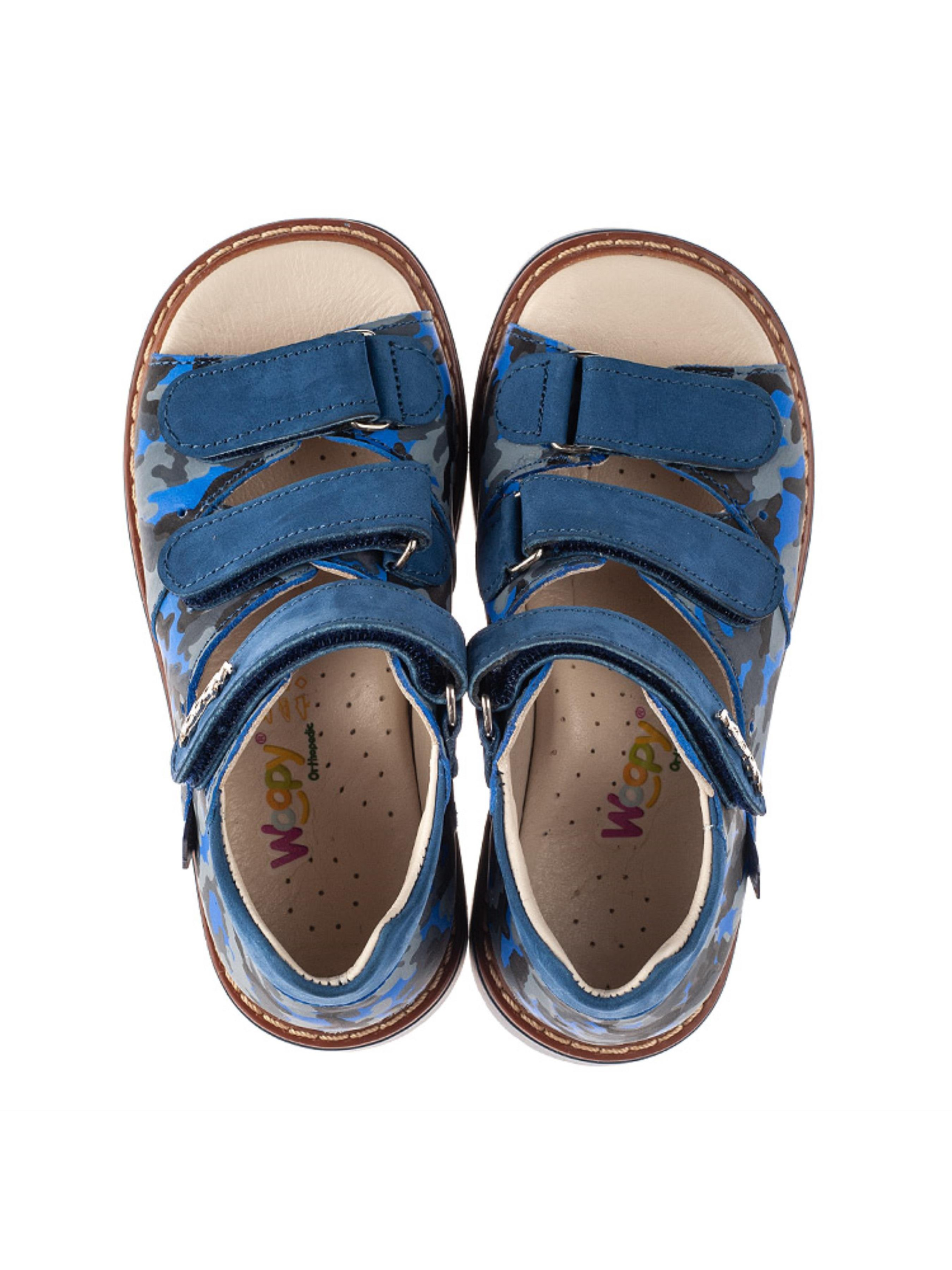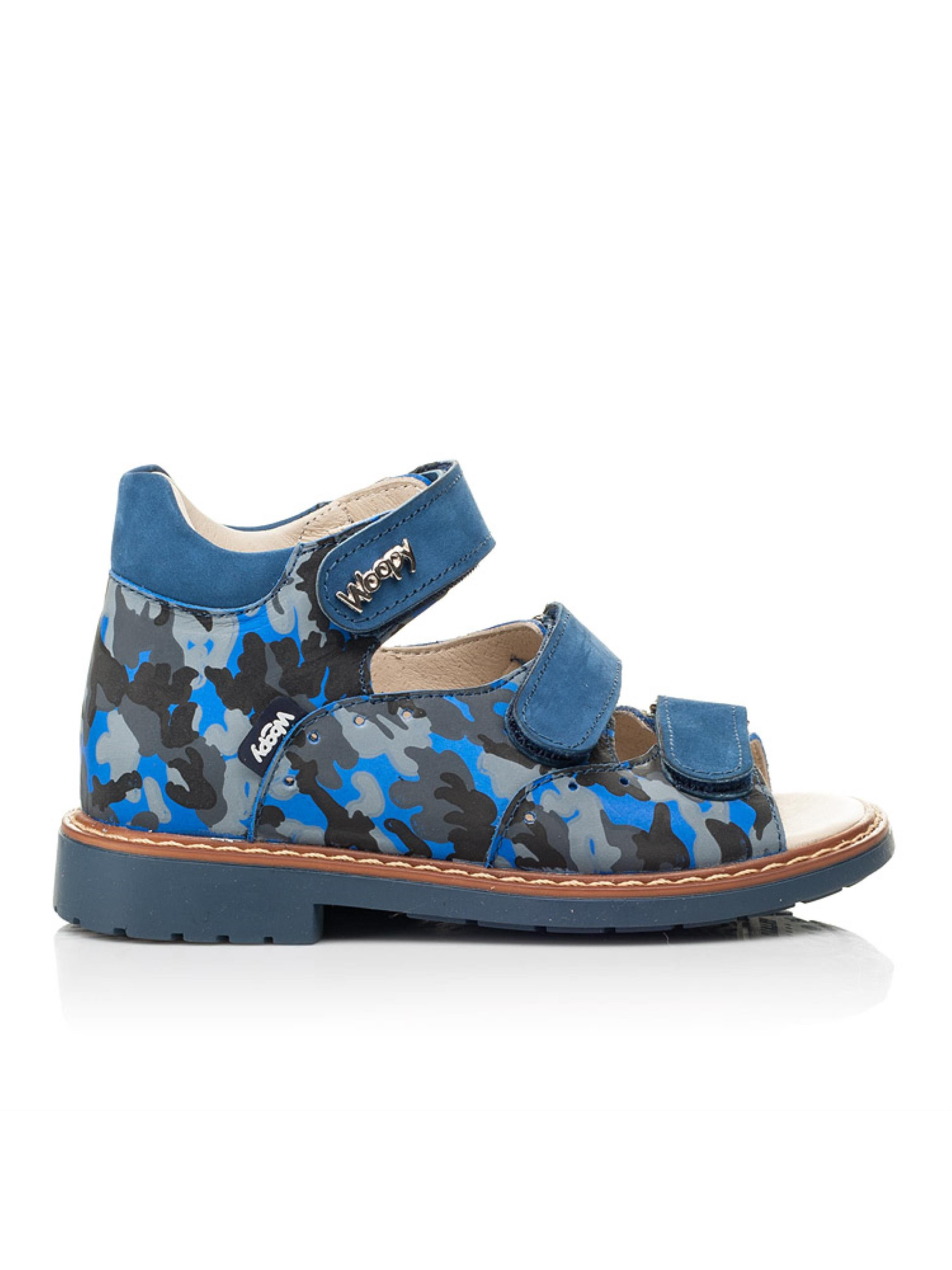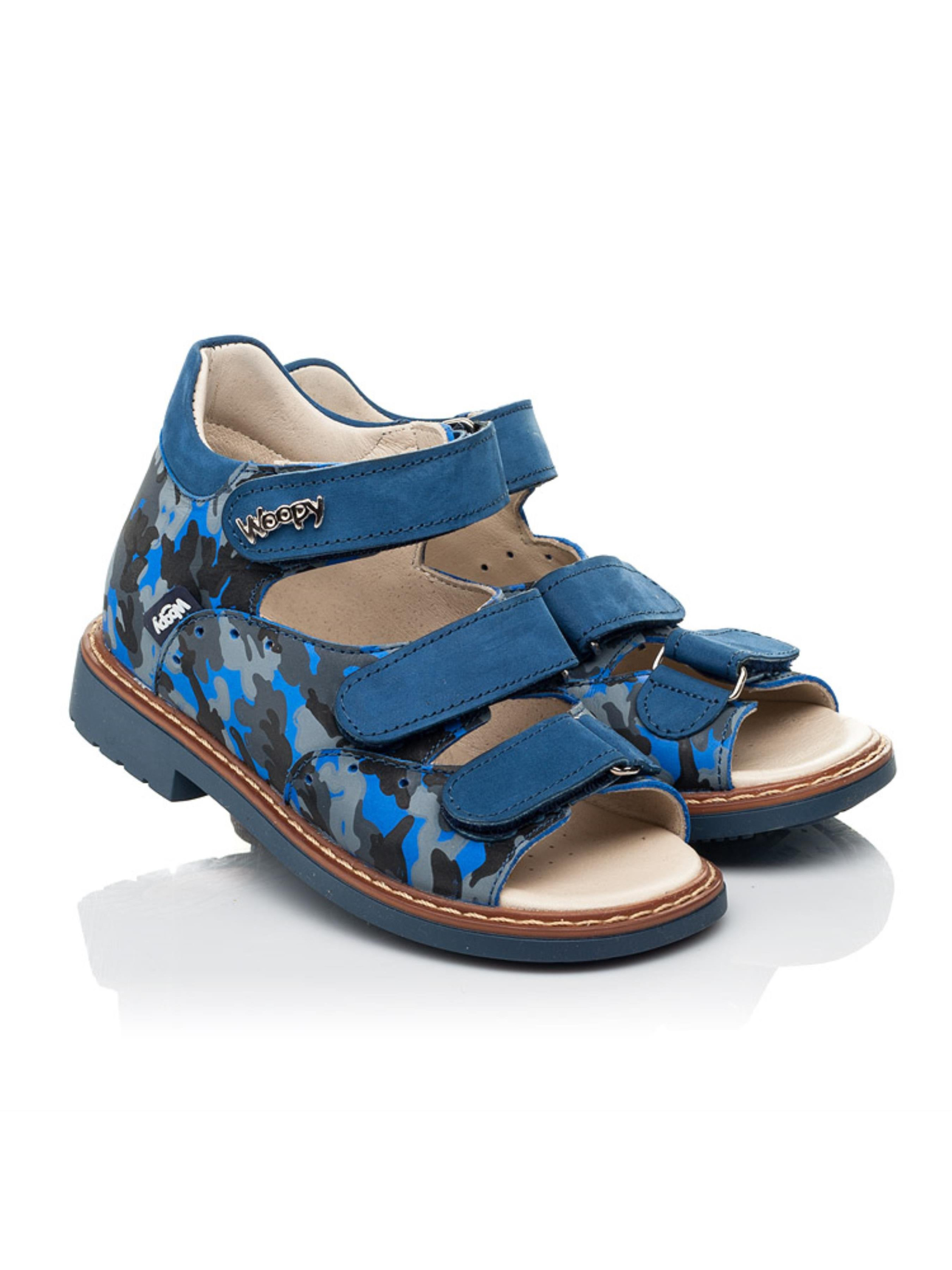 Справжній шедевр дитячого взуття - босоніжки для хлопчика від бренду Woopy з натурального нубука синього кольору. Застосування напилення дозволило створити неповторний камуфляжний візерунок. З метою профілактики дитячі босоніжки для хлопчика мають всі важливі елементи дитячого взуття: каблук Томаса, жорсткий задник, супінатор та анатомічну устілку. Всі ці елементи надзвичайно важливі для правильного формування та розвитку дитячої стопи. Надійну фіксацію ніжки в босоніжках забезпечать три застібки липучки. Верхні липучка оздоблена фірмовим логотипом виробника. Ортопедично правильні босоніжки подарують неймовірні враження від тривалих активних прогулянок в теплу пору року.