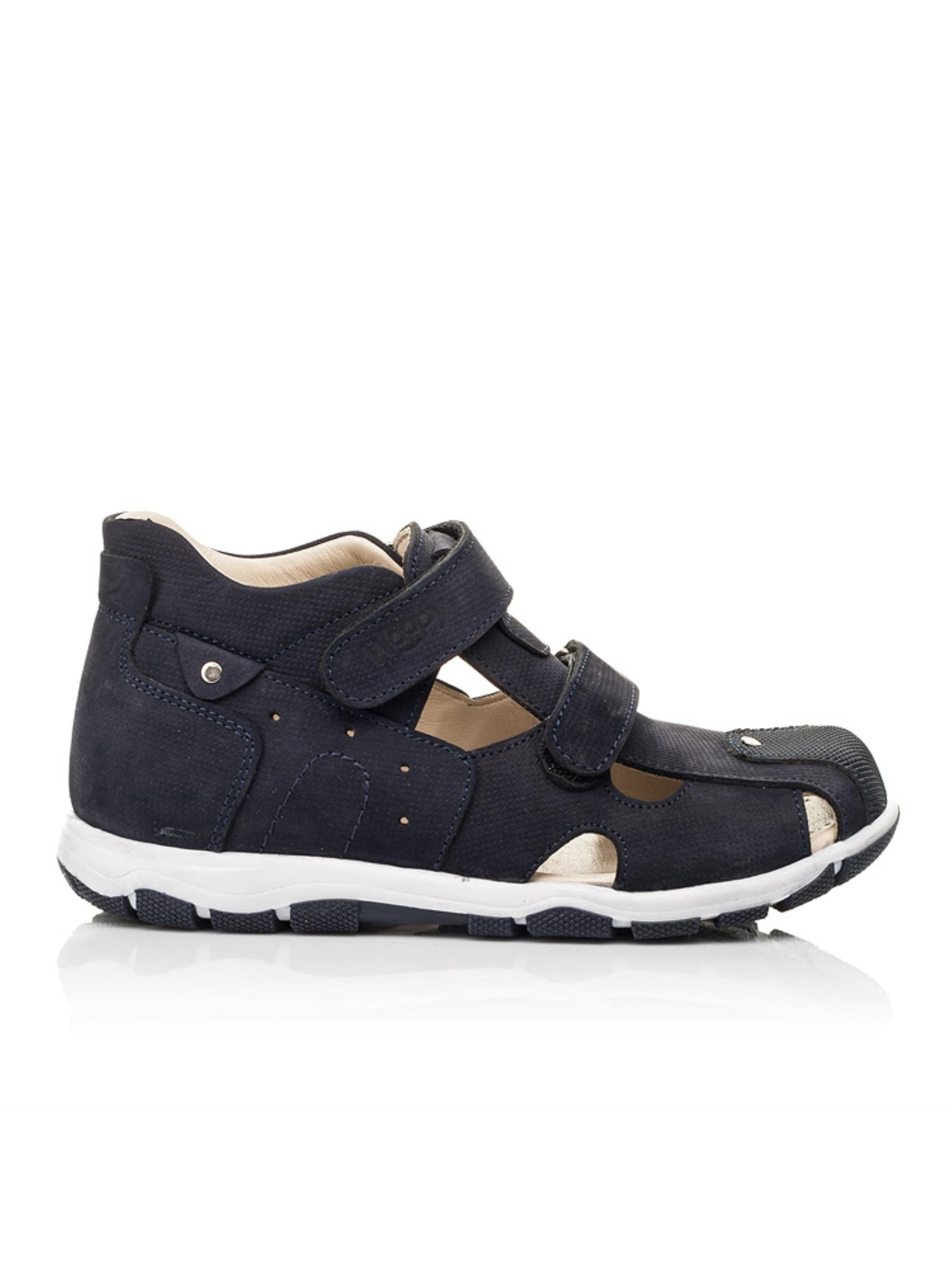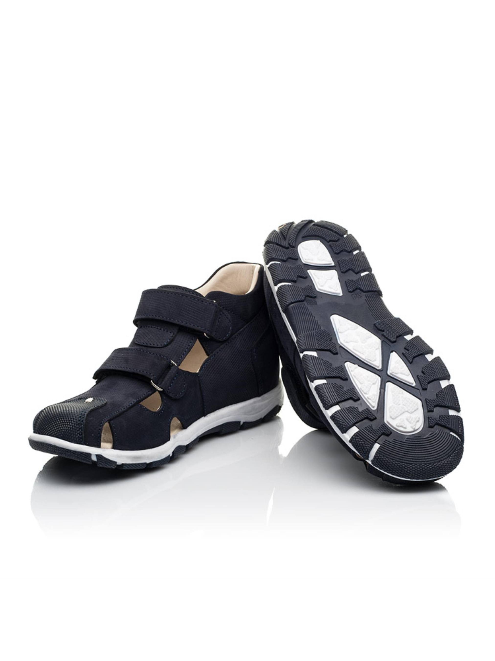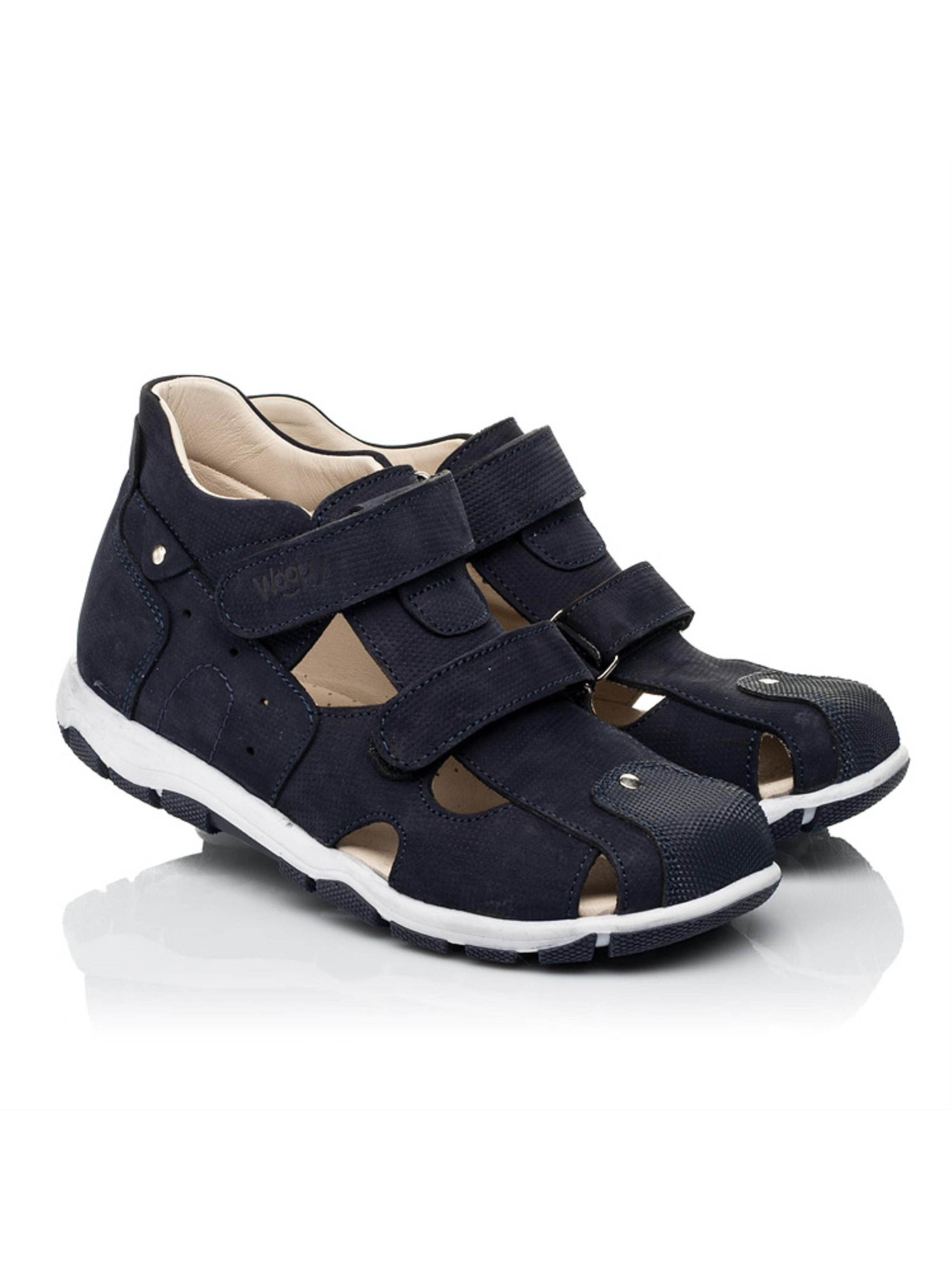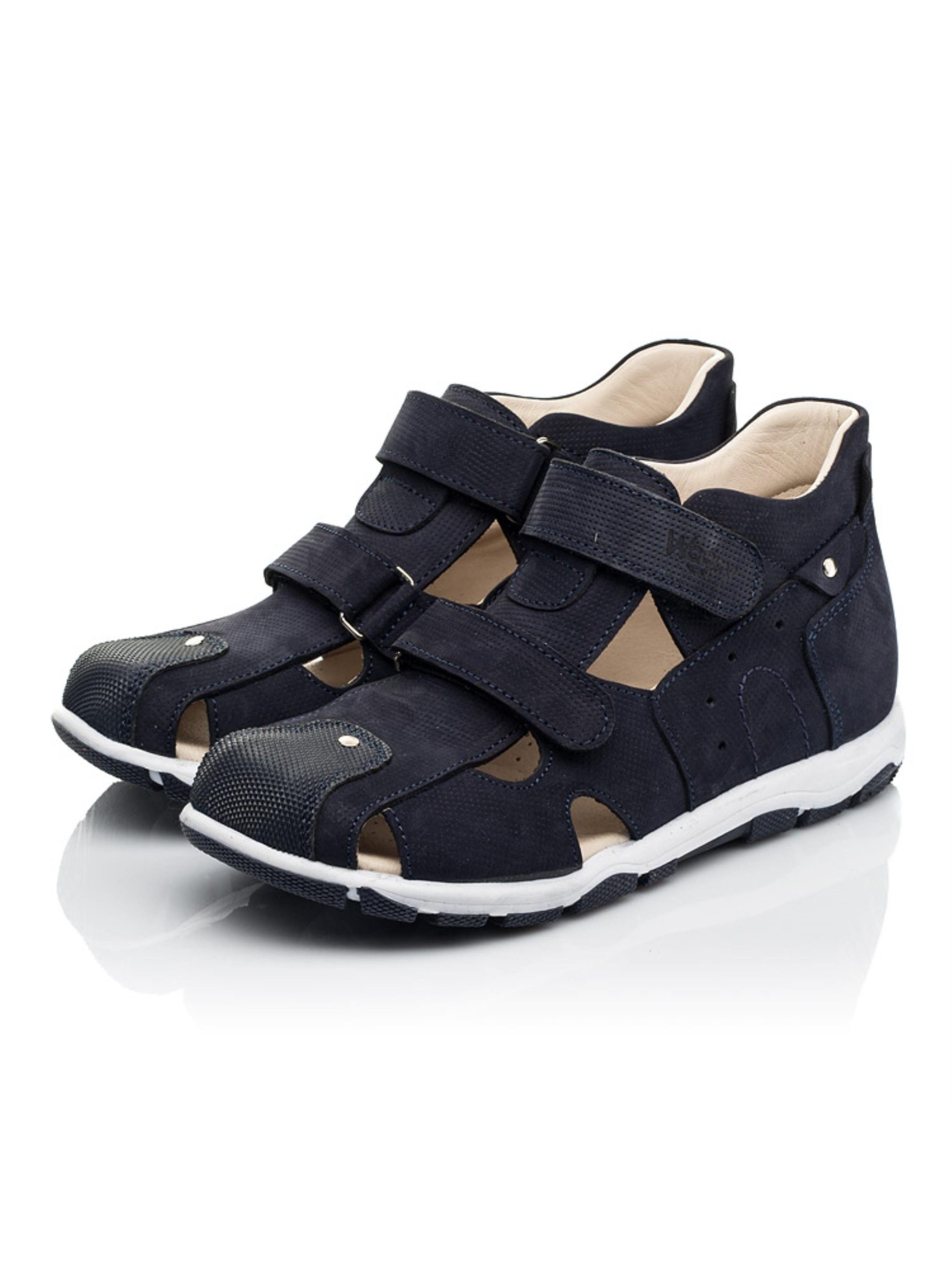 Закриті дитячі босоніжки для хлопчика створені з натурального нубука темно-синього кольору. Матеріал підкладки та устілки - натуральна високоякісна шкіра. Модель босоніжок максимально легка та комфортна. Аби дитячим стопам було максимально комфортно в жарку пору року босоніжки мають фігурні отвори для циркуляції повітря. Підошва в кросівках легка та гнучка. Підліткові босоніжки для хлопчика мають жорсткий задник, супінатор та анатомічну устілку. Спосіб застібання - дві надійні застібки-липучки. Універсальна модель босоніжок декорована поверхневою перфорацією для створення фактури та оздоблена чіткими декоративними швами. Носова частина від механічних пошкоджень захищена вставкою з сучасного штучного матеріалу "неубивайкою".