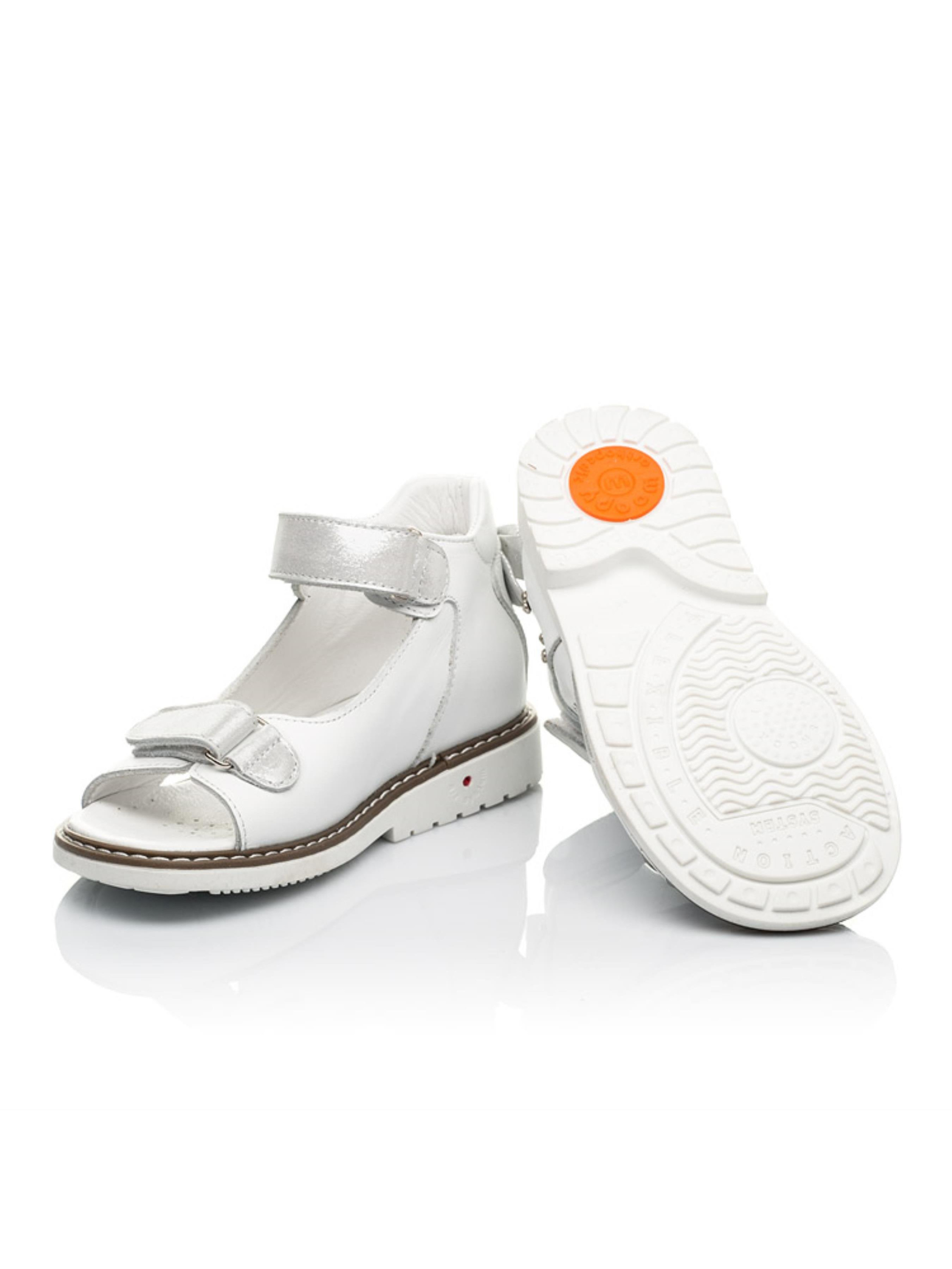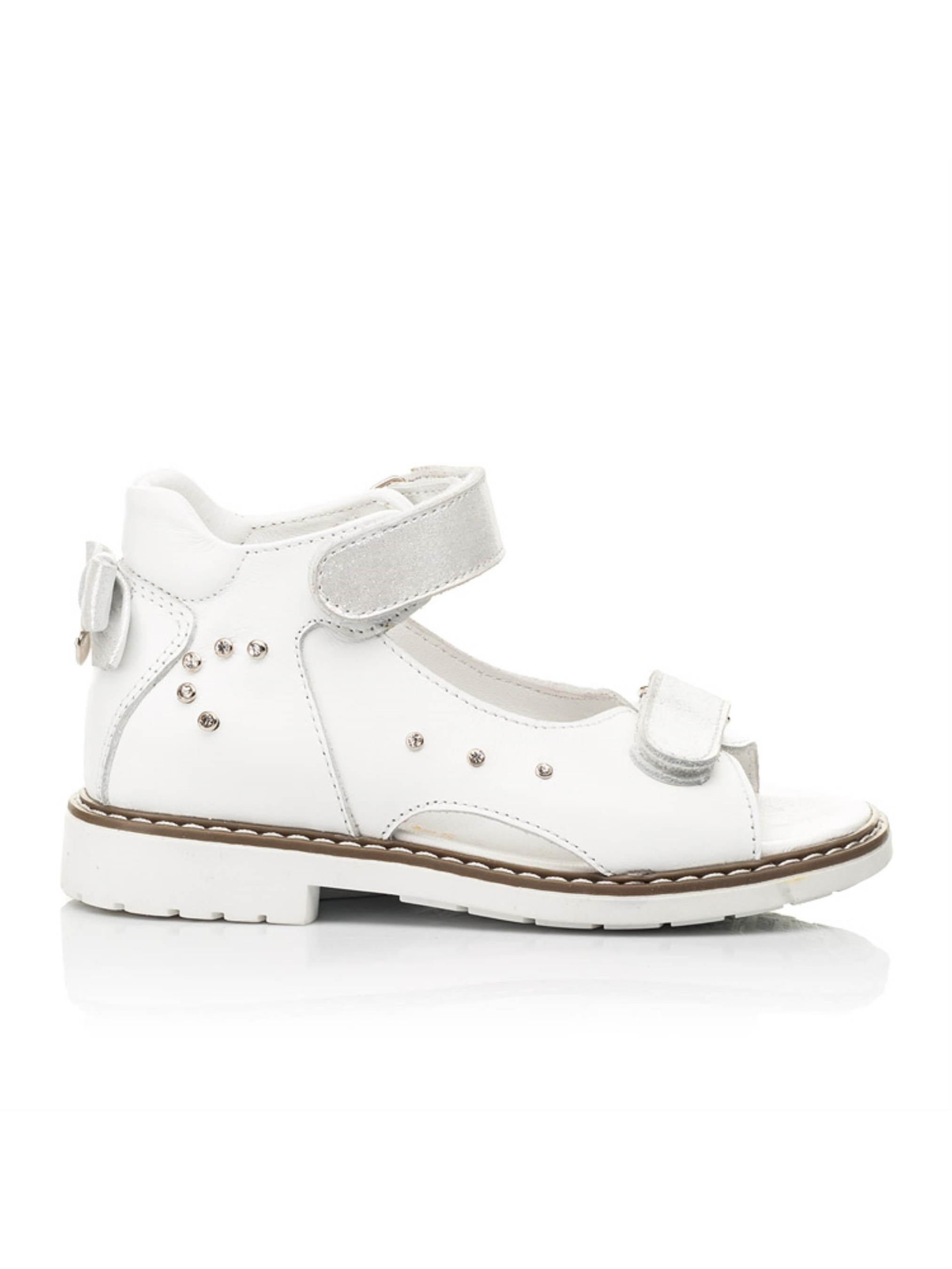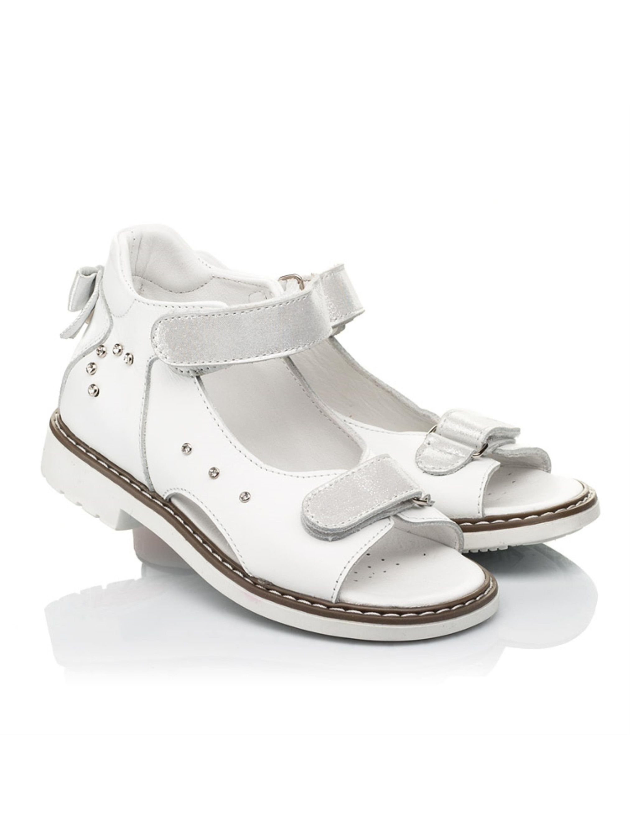 Ніжні ортопедично правильні дитячі босоніжки для дівчинки створені з натуральної шкіри вишуканого білого кольору. Універсальна модель босоніжок за рахунок стриманого дизайну дозволить створити безліч неповторних літніх образів. Матеріал підкладки та устілки - натуральна шкіра. Для контрасту фактури застібки-липучки відшиті з натурального нубука. Такий спосіб застібання значно полегшить та прискорить процес взування. Родзинкою пари виступають декоративні камінці, які прикрашають бокову частину взуття. Милим доповненням стильної пари босоніжок виступає кокетливий бантик на заднику. Окрім неповторного дизайну босоніжки вражають і комфортними характеристиками, адже створені з врахуванням ортопедичних елементів дитячого взуття. Дитячі босоніжки для дівчинки мають жорсткий задник, каблук Томаса, супінатор та анатомічно правильну устілку.