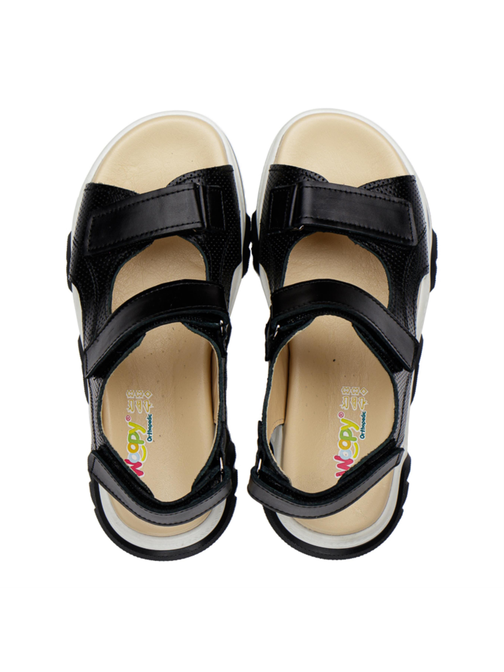 Woopy Orthopedic представлений колекцією босоніжок, туфель, ортопедичних босоніжок/туфель з високим берцем, демісезонних та зимових черевик, які забезпечують профілактику та лікування плосковальгусної деформації стопи і мають важливі ортопедичні елементи дитячого взуття: каблук Томаса, жорсткий задник, супінатор та анатомічно правильну устілку.