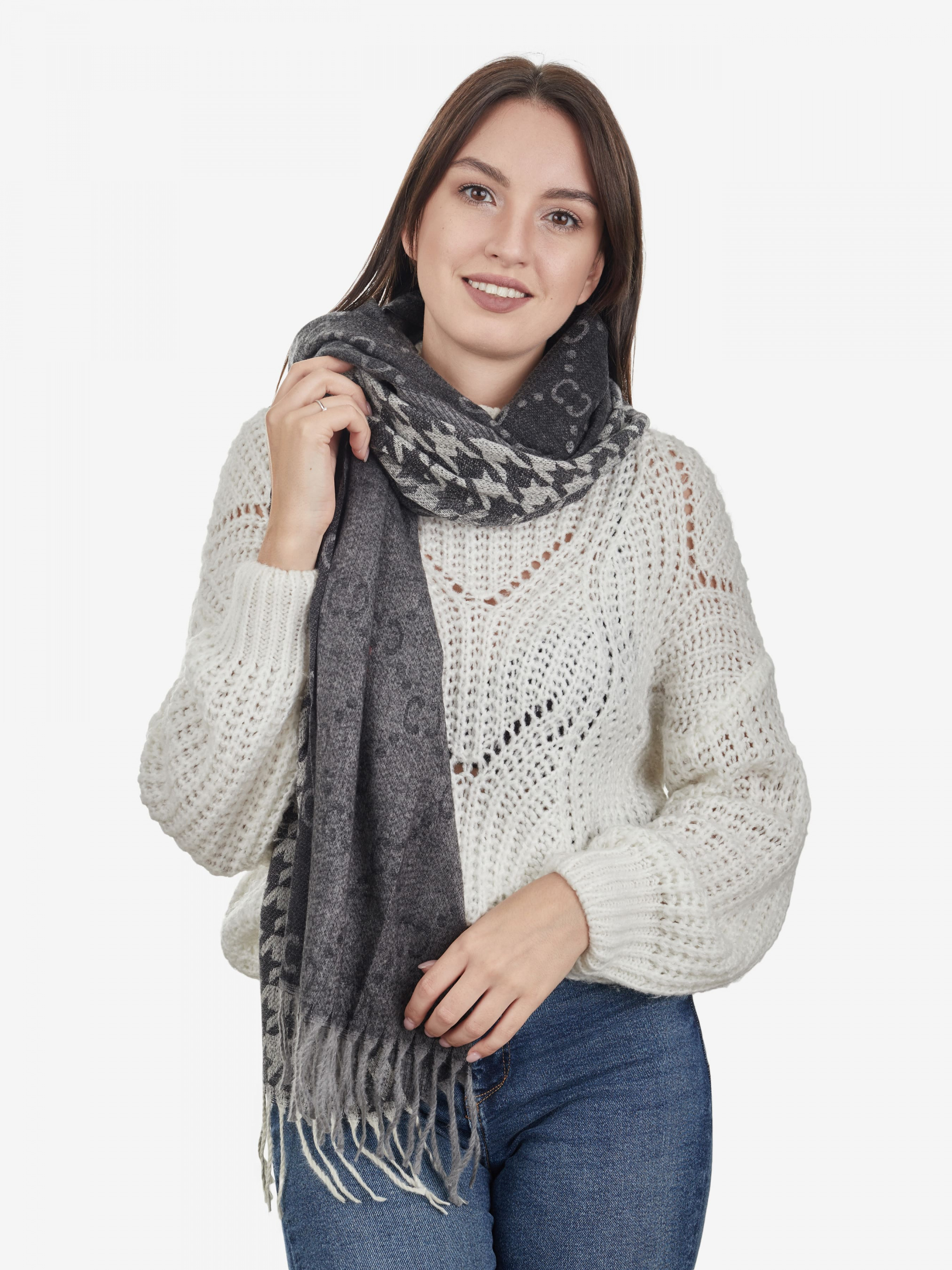 "Довгий та широкий шарф від бренду Regina Notte. Тонкий, але теплий шарф із віскози та вовни. Шарф може стати як гарним аксесуаром, так і захистом від вітру та холоду. Використовуйте його як накидку на плечі, як головний убір або як об'ємний шарф навколо шиї. Ідеально підійде для весняно-осіннього періоду. Деталі: - Широкий м'який шарф у класичному стилі - Склад: 80% віскоза, 20% шерсть - Розмір: 180 x 65 см - декорований бахромою - Демісезонний"