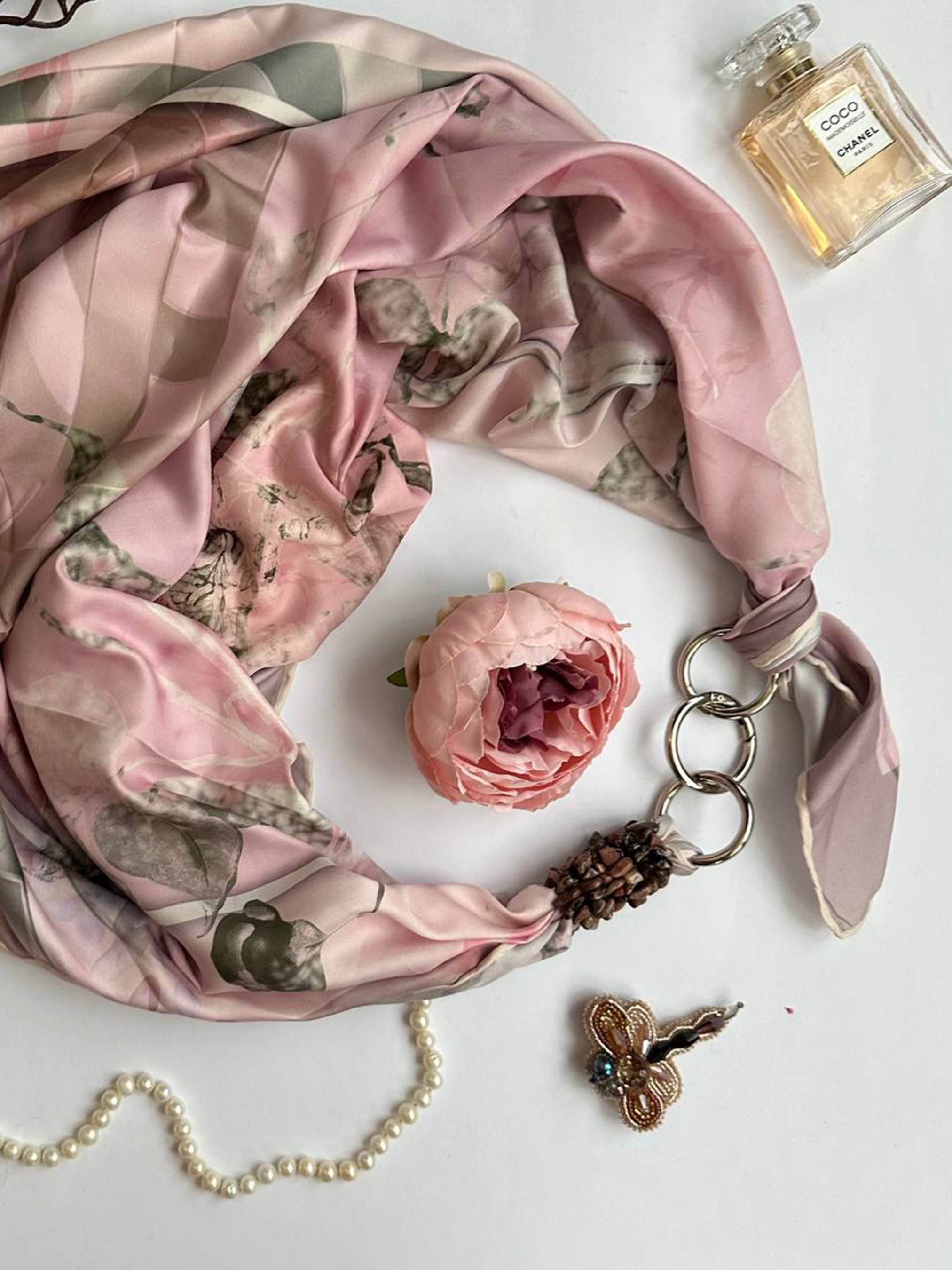 Шовкова хустка ( 70% шовк) з розкішним принтом. Прикрашений натуральним каменем і великою металевою фурнітурою сріблястого кольору. Розмір 90х90 см. Преміальна колекція. Подарункова коробка .