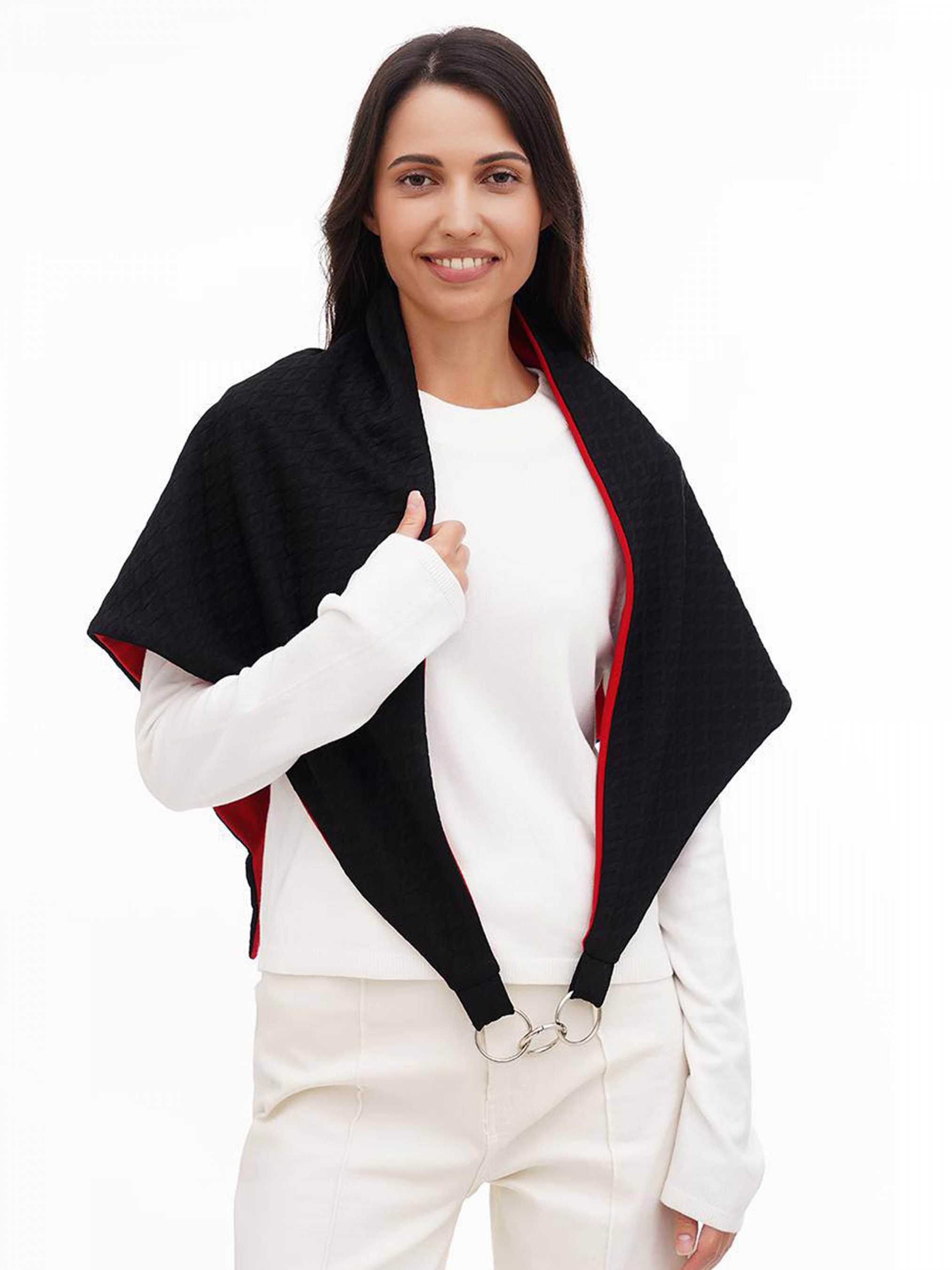 Дизайнерський шарф оздоблений великою металевою фурнітурою кольору "срібло". Шарф двосторонній. Унісекс Розмір 100х100х150 см. Трикотаж Одна сторона :віскоза 75% , поліестер 25% Друга сторона: 100% віскоза. Країна бренду Україна