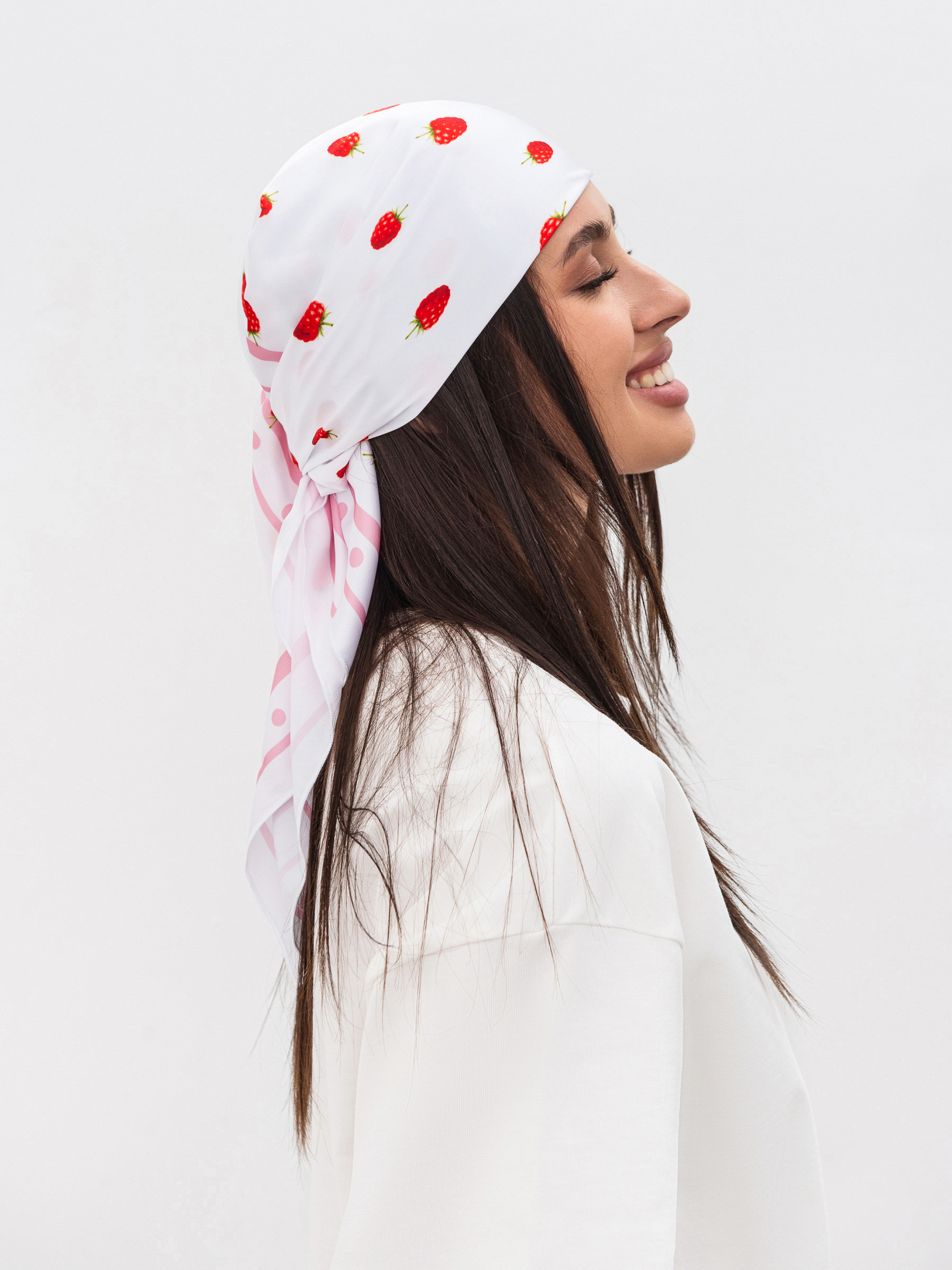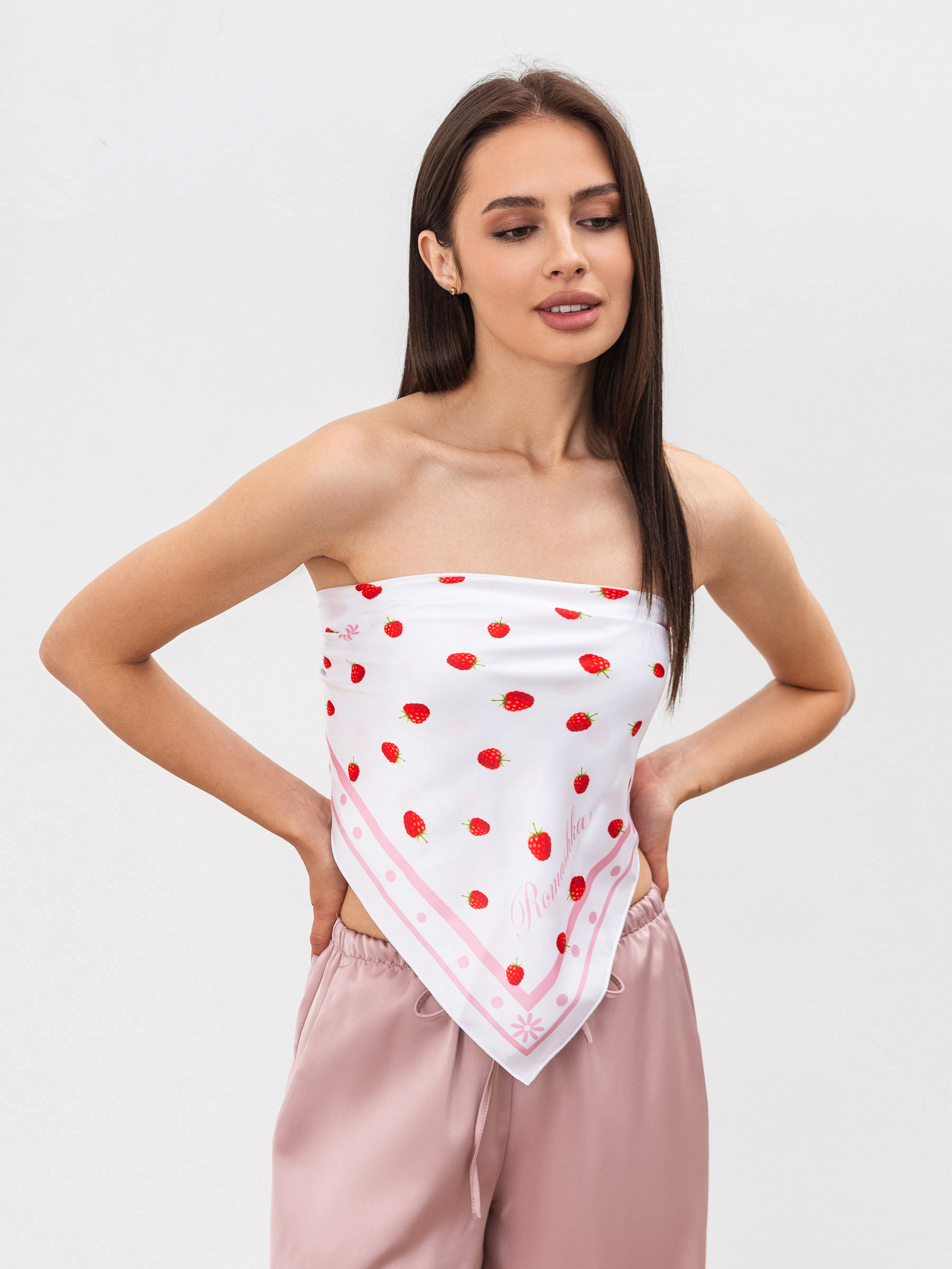 Хустка квадратної форми з яскравим принтом полуниці стильний акцент, що освіжить будь-який образ. Завдяки ніжному сатиновому блиску аксесуар виглядає елегантно як у щоденних луках, так і в романтичних або святкових стилізаціях. Модель можна носити як на шиї, так і в якості пов'язки на голову, браслета або прикраси на сумку. Матеріал м'який сатин, склад 100% поліестер. Легка, приємна на дотик і проста в догляді. Довжина аксесуару: 69 см, ширина : 69 см