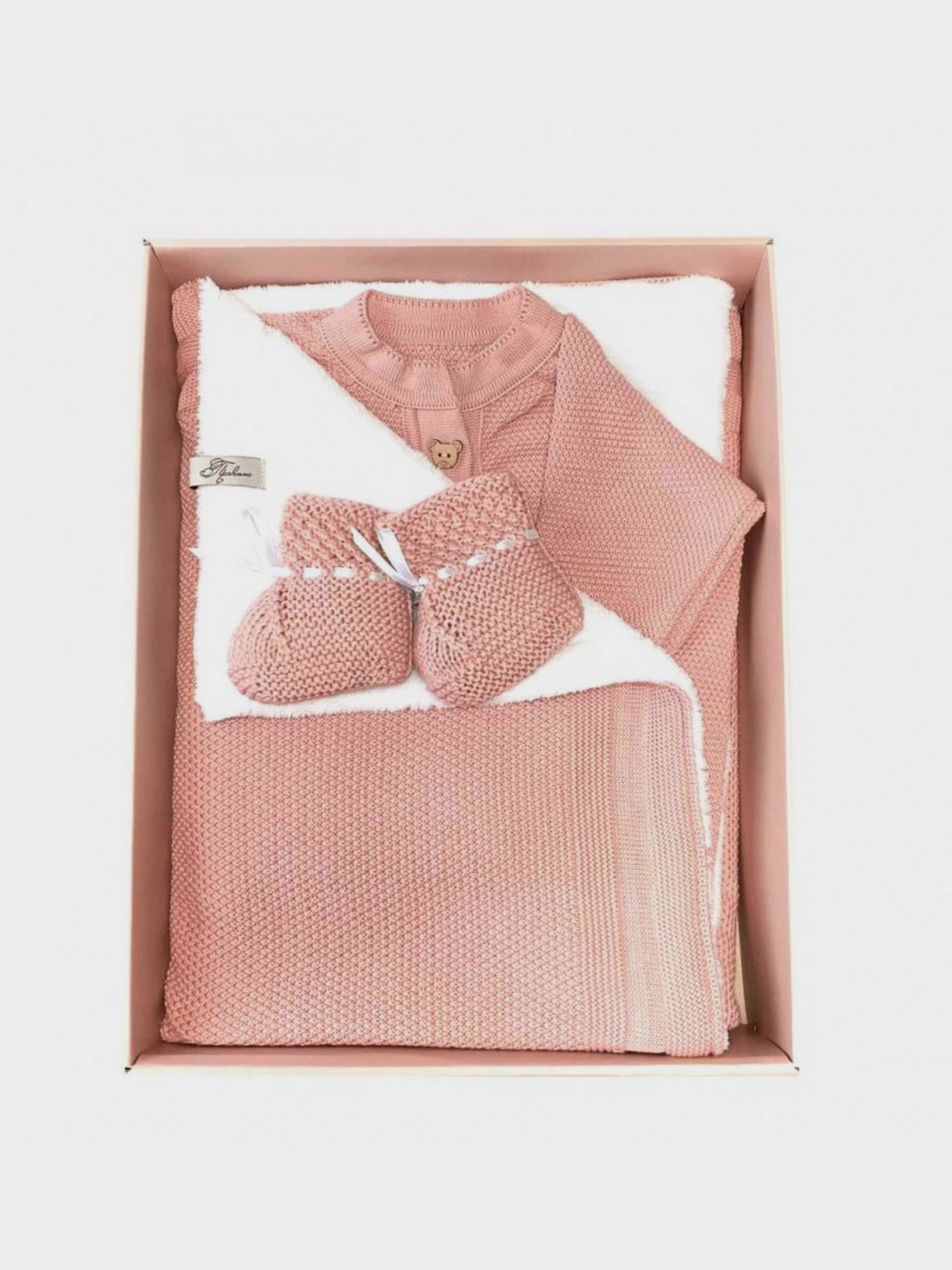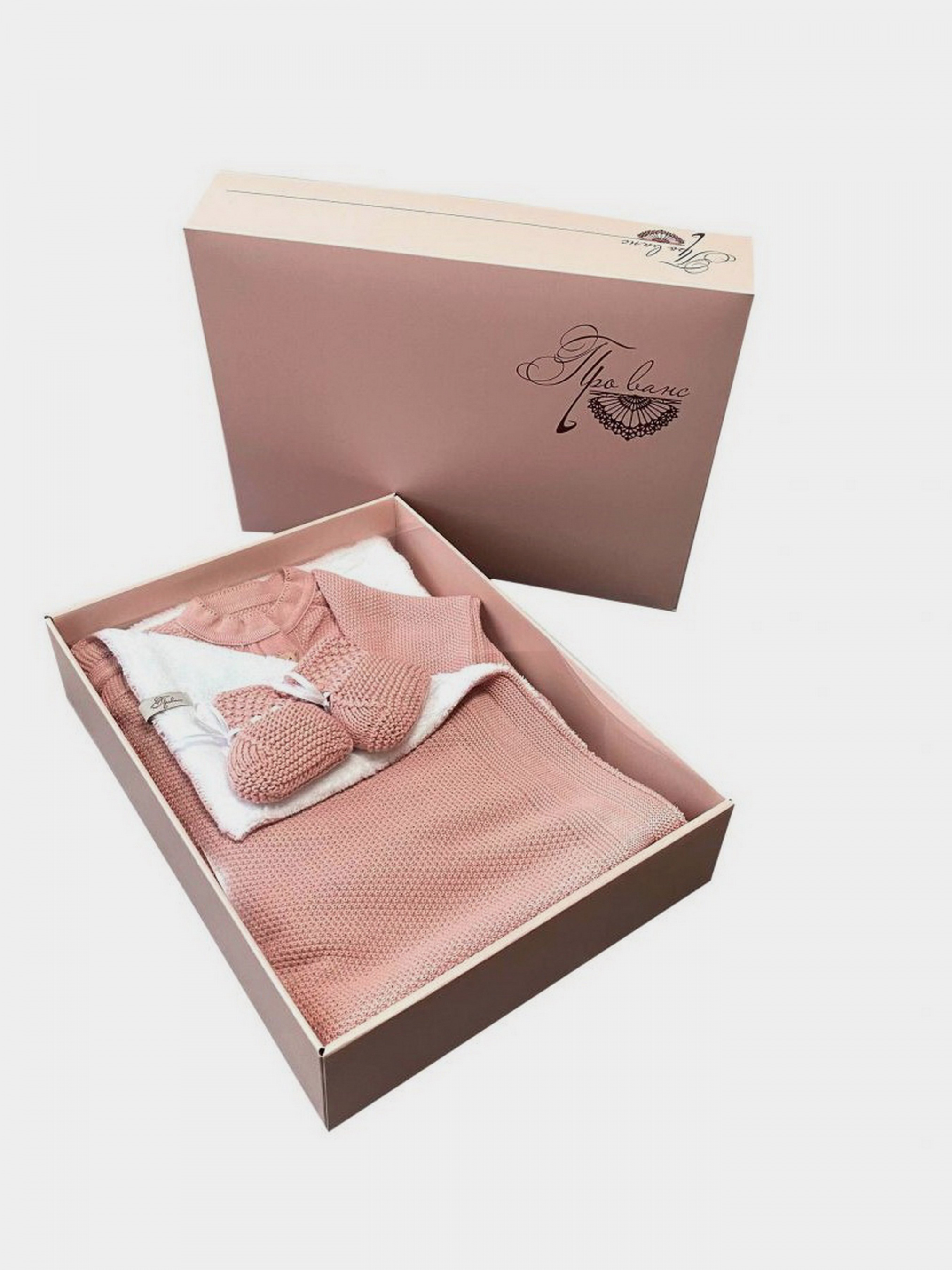 У набір входить: Пледик в'язаний з теплим хутром у розмірі 86 * 96 см, можна використовувати як в візочок так і в ліжечко.