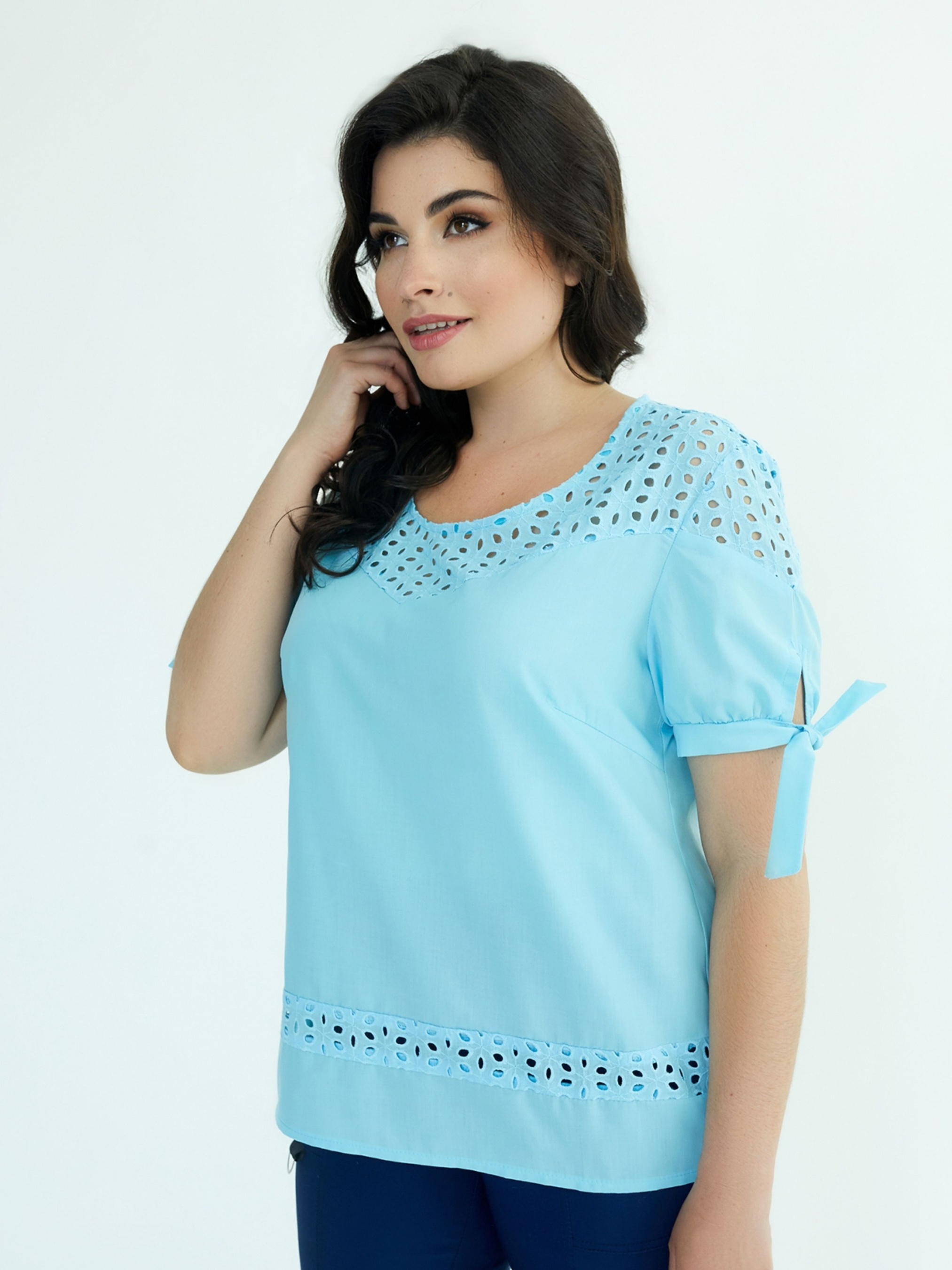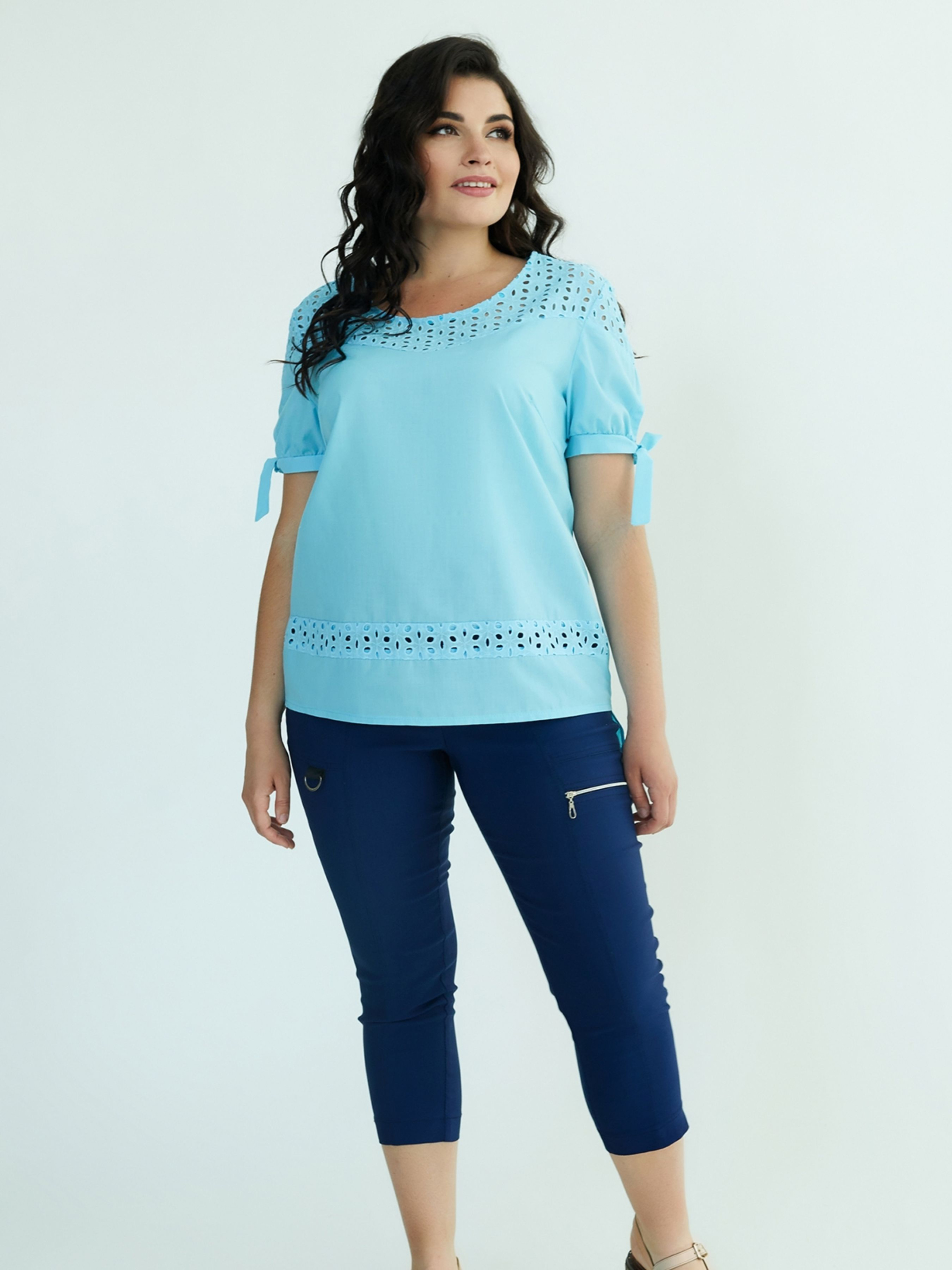 Літня блуза, модель "Джесика", виконана з батисту та прошви (100% бавовна). Рукав на манжеті з зав'язкою. Ажурний візерунок з прошви на пілочці, спинці та рукавах додає виробу елегантності. Спинка подовжена. Ця модель гармонійно поєднується з брюками, спідницями або подовженими шортами, створюючи святкові або повсякденні образи. Доступні розміри: 50-60. Характеристики: Назва моделі: Джесика. Тип тканини: батист, прошва (обидві - 100% бавовна). Склад тканини: 100% бавовна. Довжина рукава: 22 см. Довжина виробу по спинці: р. 50, 52 - 71 см; р. 54, 56 - 73 см; р. 58, 60 - 76 см. Орієнтовні заміри готового виробу: 50 розмір: Обхват грудей - 104 см, обхват стегон - 110 см; ширина плечей - 40 см. 52 розмір: Обхват грудей - 108 см, обхват стегон - 118 см; ширина плечей - 41 см. 54 розмір: Обхват грудей - 116 см, обхват стегон - 122 см; ширина плечей - 42 см. 56 розмір: Обхват грудей - 120 см, обхват стегон - 126 см; ширина плечей - 43 см. 58 розмір: Обхват грудей - 124 см, обхват стегон - 130 см; ширина плечей - 44 см. 60 розмір: Обхват грудей - 128 см, обхват стегон - 134 см; ширина плечей - 45 см.