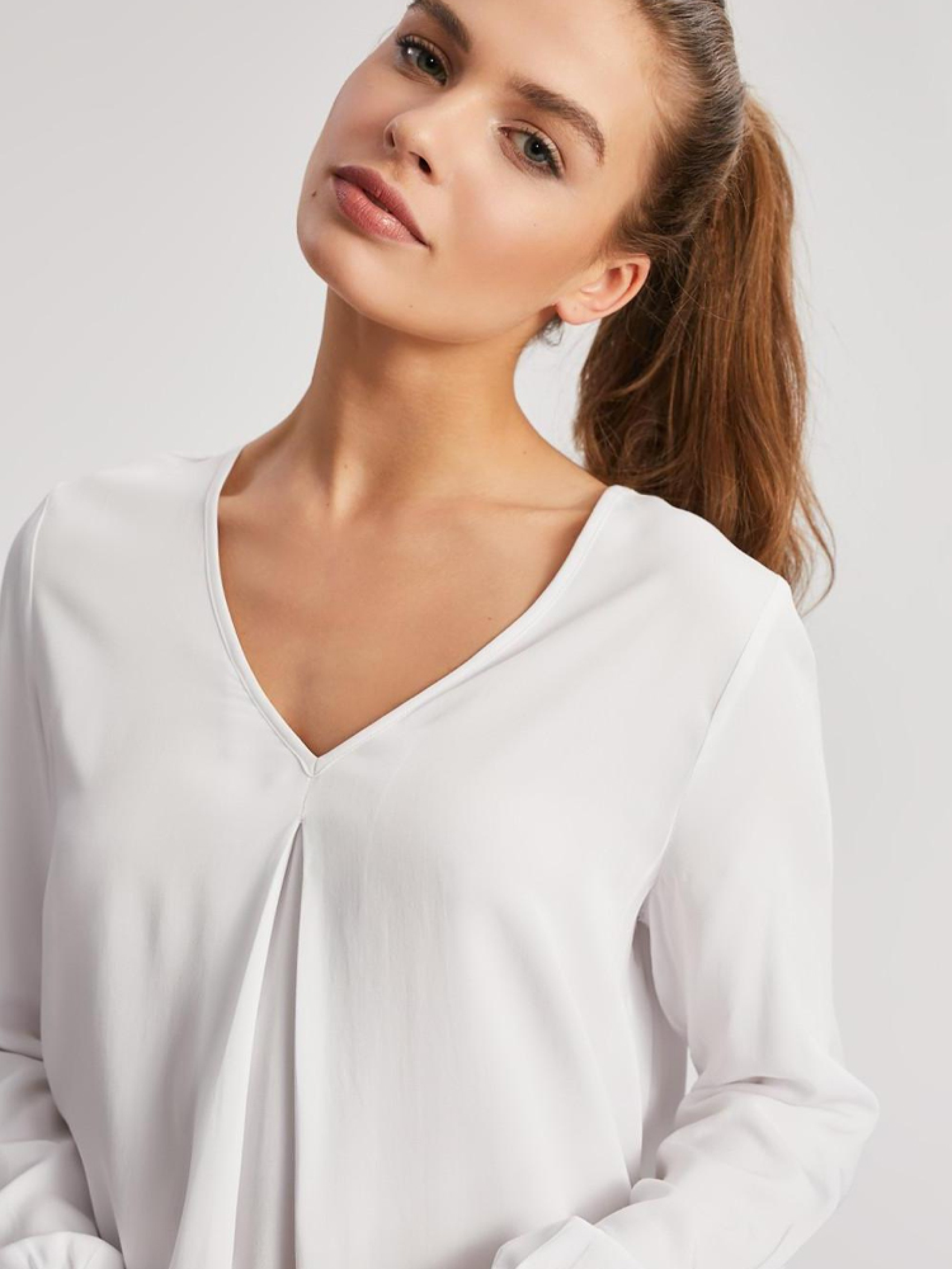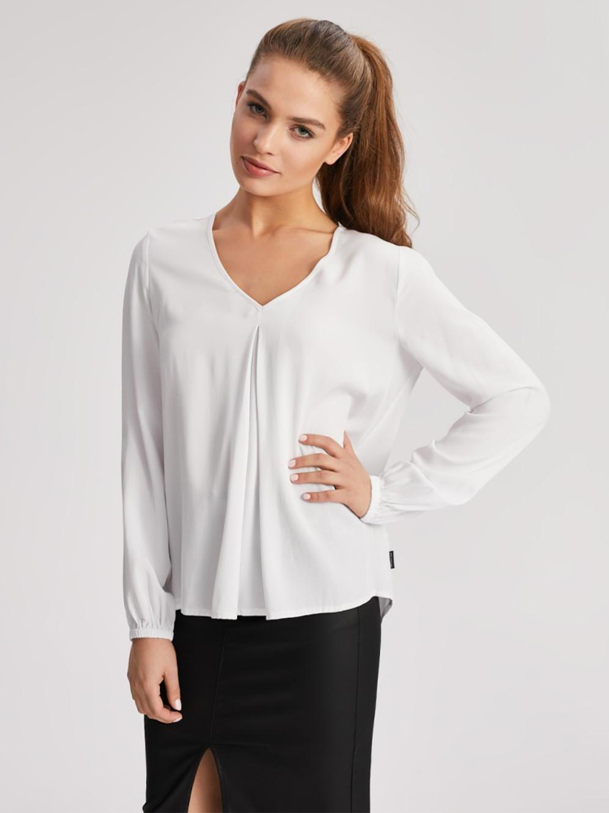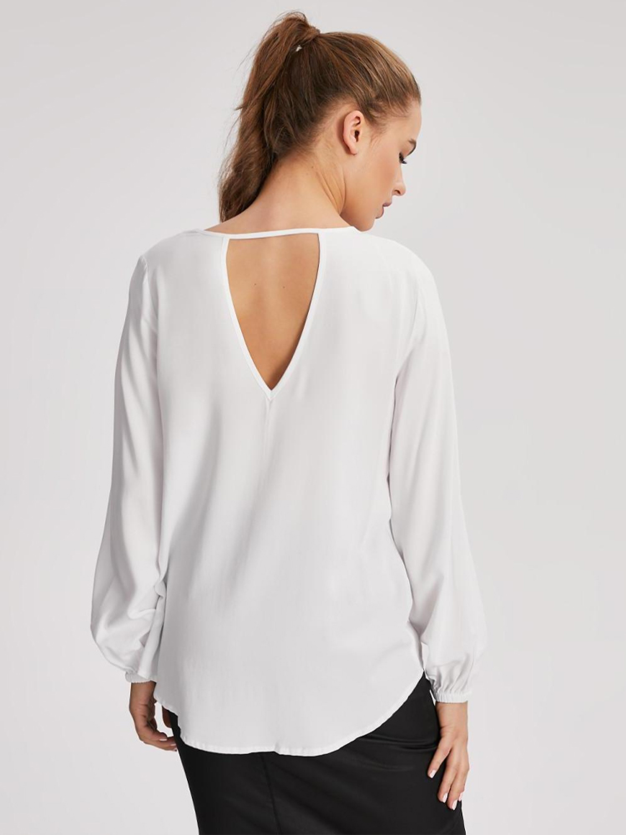 Вільна жіноча блуза BONO з V-подібним вирізом на спині. Модель виготовлена з віскози, довгі рукави з манжетами. Легка і дуже комфортна для щоденного використання в теплі дні весни і літа за рахунок натурального складу. Виріб можна купити в білому кольорі. Відмінне рішення разом з спідницею і черевиками з асортименту. РОЗМІР: XS, S, М, L, XL, ДОВЖИНА ПО ЦЕНТРУ СПИНИ: 68 см, 70 см, 72 см, 74 см, 76 см, ШИРИНА НИЗУ:54 см, 56 см, 58 см, 60 см, 62 см, ШИРИНА У НИЖНІЙ ЧАСТИНІ ПАХВИ: : 46 см, 48 см, 50 см, 52 см, 54 см, ДОВЖИНА РУКАВА: 60 см, 60 см, 61 см, 62 см, 63 см