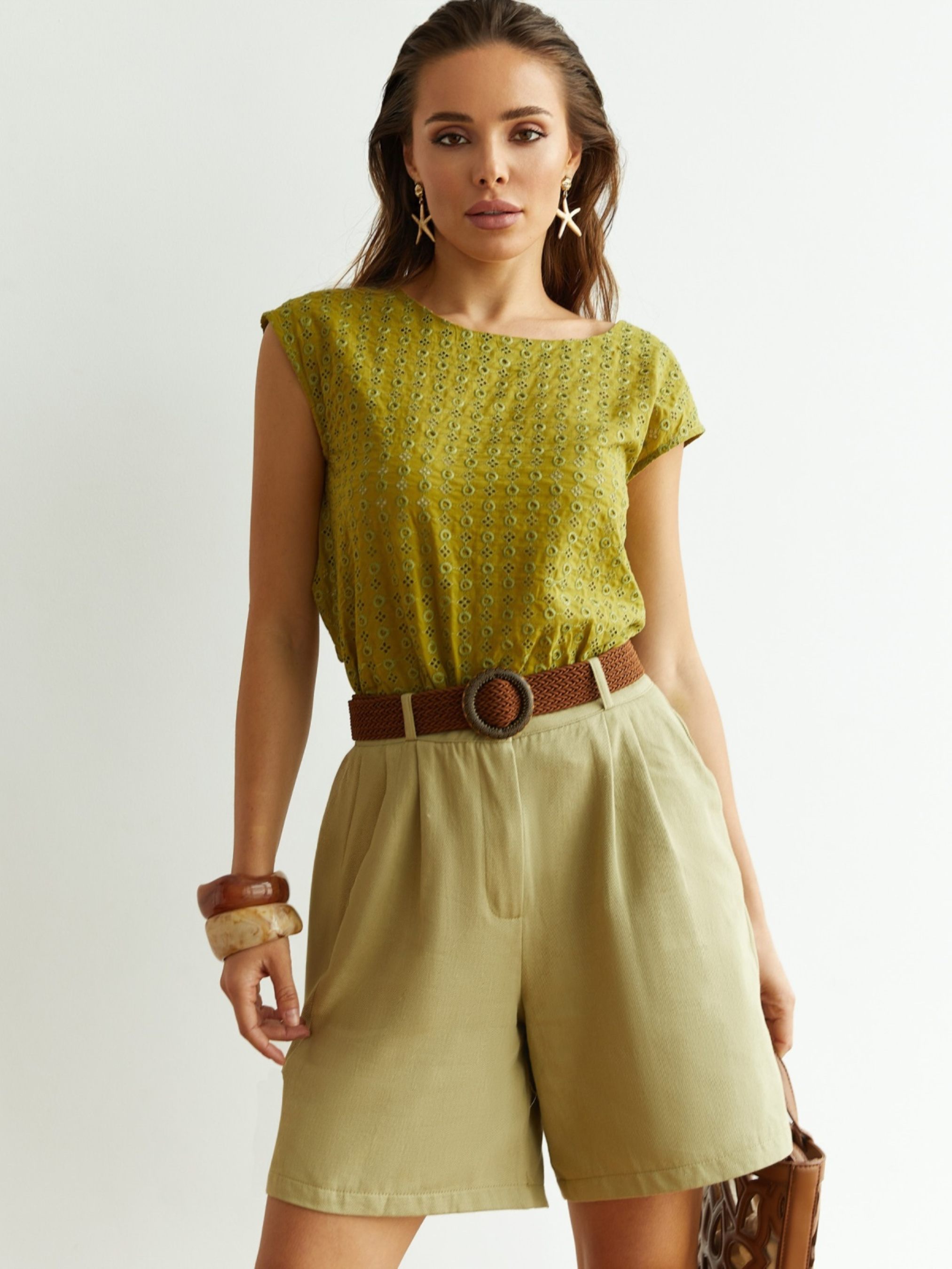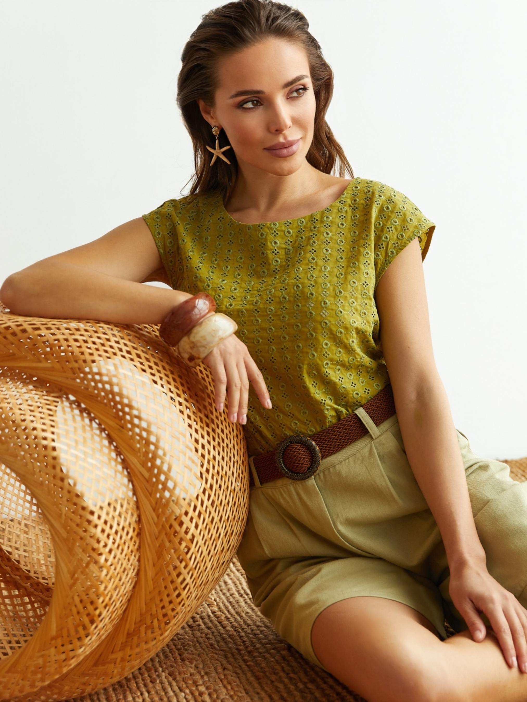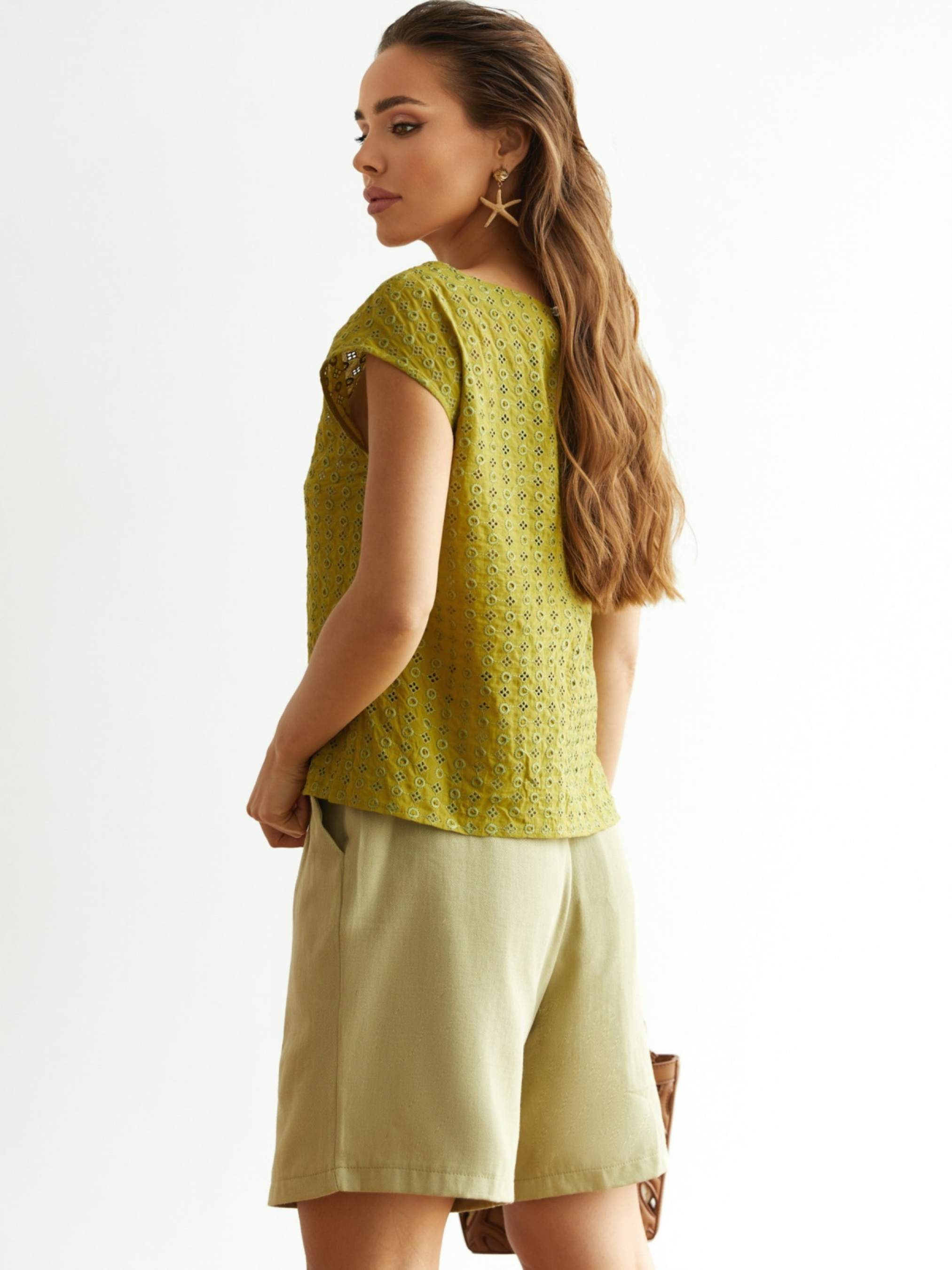 Блузка з бавовняної прошви, розроблена з акцентом на комфорт і практичність. Круглий виріз горловини та спущена лінія плеча забезпечують свободу рухів. Застібка ззаду — петелька і ґудзик — спрощує процес одягання. Легка та універсальна модель, яка підходить для повсякденної носки та базових поєднань.