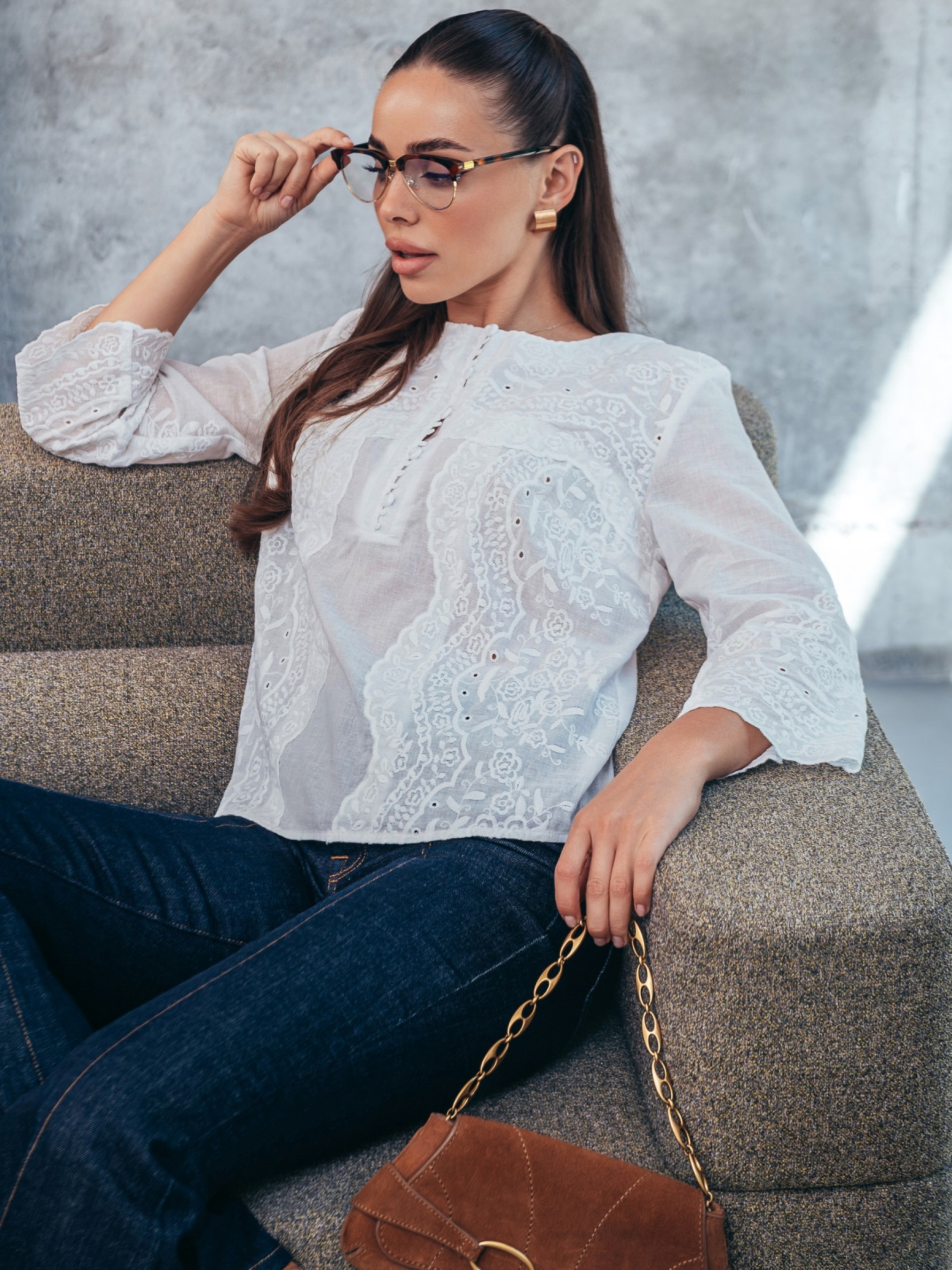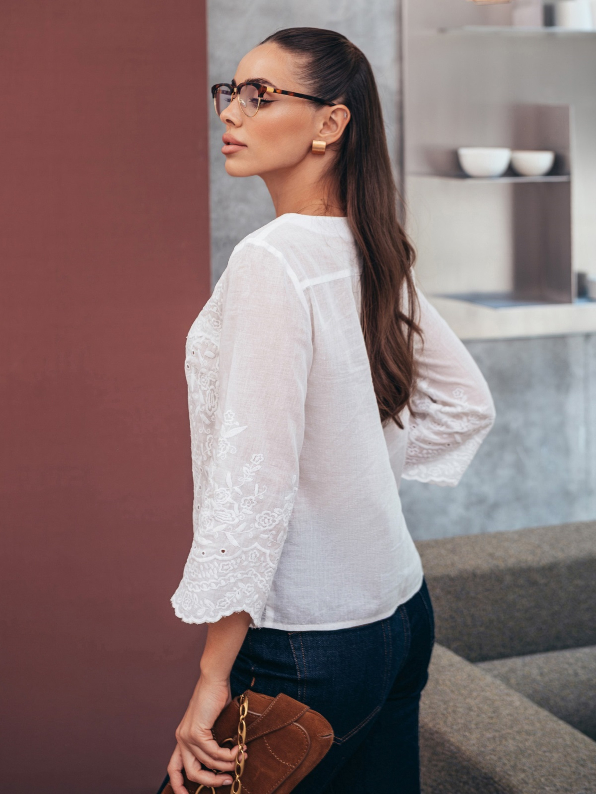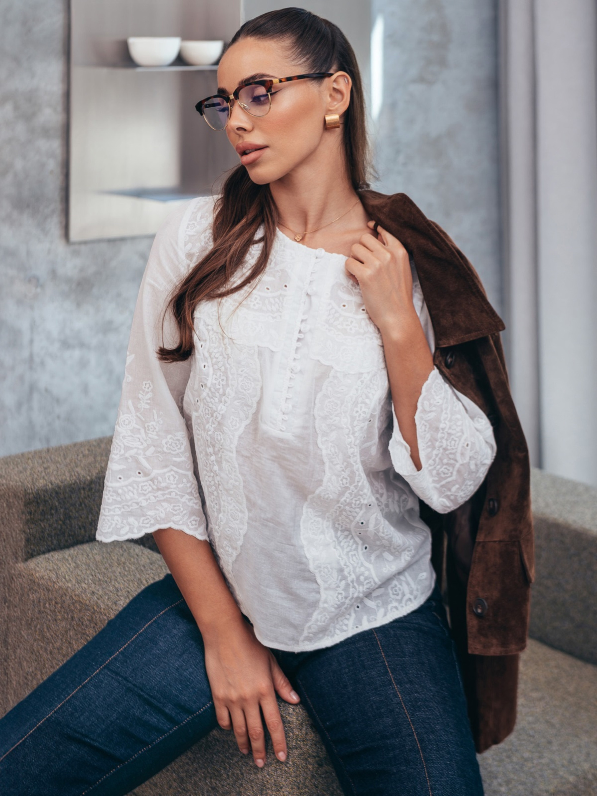 Блузка з натуральної бавовняної прошви — стильне та комфортне рішення для теплого сезону. Вільний крій пасує до будь-якої фігури, а рукави ¾ з фігурним краєм акцентують зап’ястя. Фактурний квітковий візерунок прикрашає передню частину та рукави, створюючи елегантний образ. Горловина оформлена планкою з функціональними ґудзиками. Модель без підкладки.