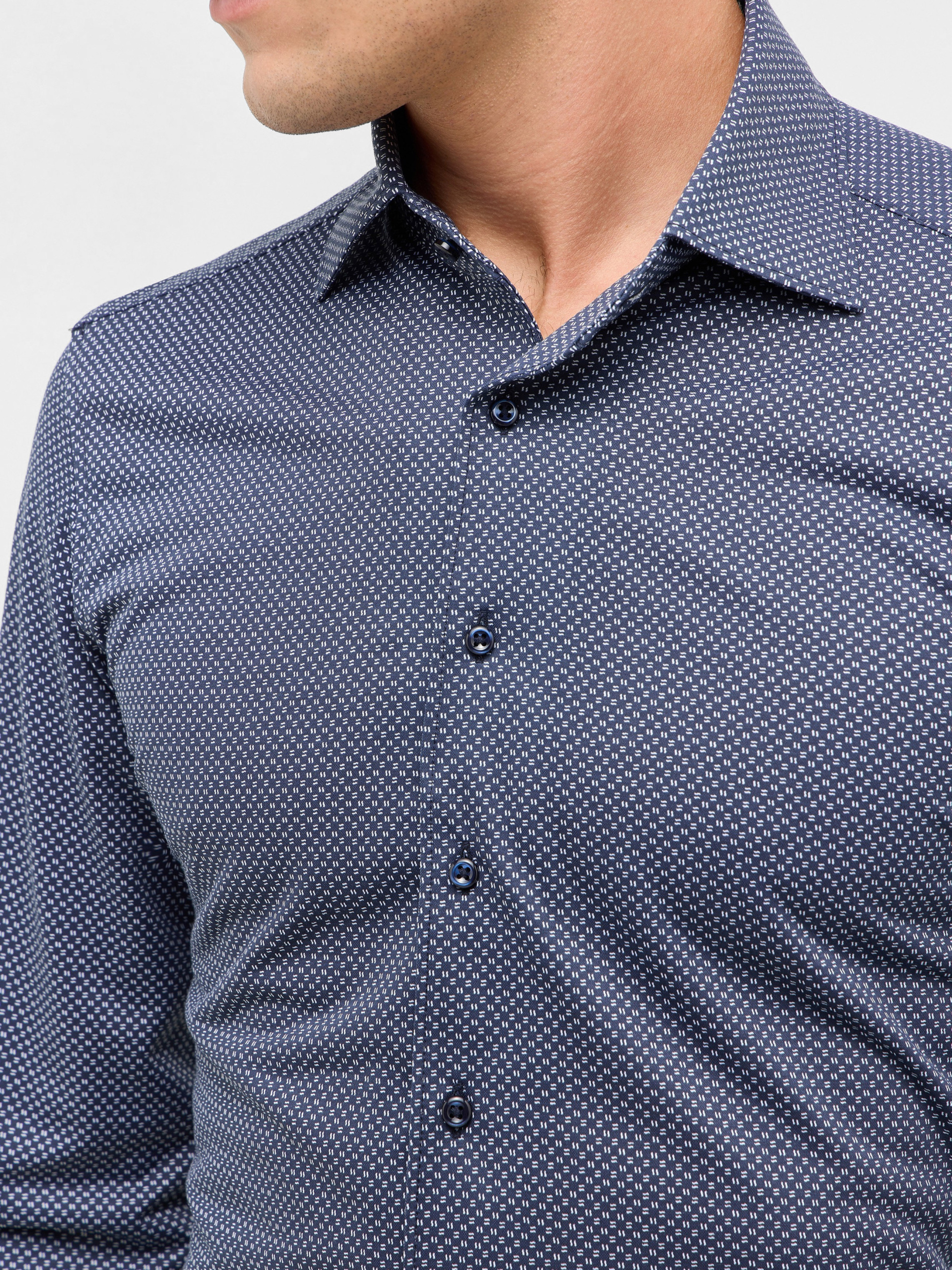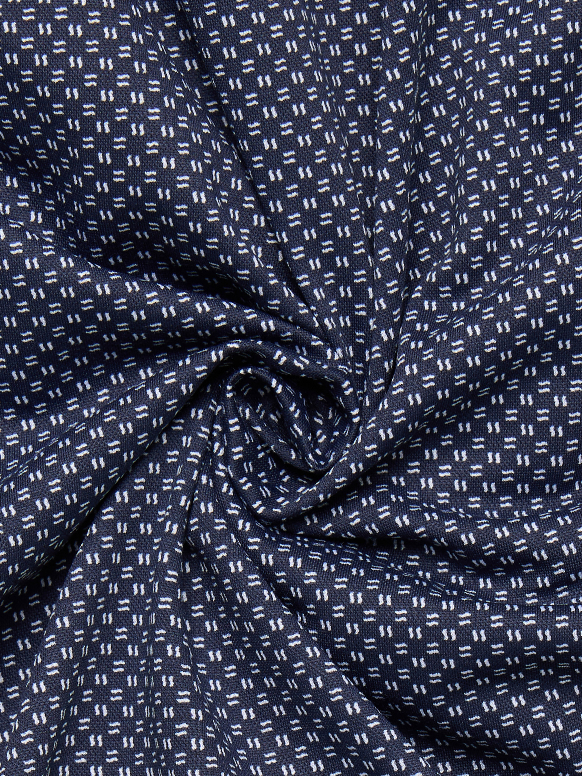 Стильна чоловіча сорочка Slim Fit темно-синього кольору з дрібним геометричним візерунком — ідеальний вибір для сучасного ділового та smart-casual гардероба. Приталений крій підкреслює силует, а тканина з високим вмістом бавовни забезпечує комфорт і практичність у щоденному носінні. Характеристики Колір: темно-синій Візерунок: дрібний геометричний Фасон: Slim fit (приталений) Комір: класичний відкладний Рукави: довгі, манжети на ґудзиках Застібка: ґудзики Склад: 58% бавовна, 42% поліестер Сезон: всесезонна Переваги Акуратна посадка та сучасний вигляд Зносостійка тканина, що добре тримає форму Підходить для офісу, ділових зустрічей і повсякденних образів Догляд Прання при 30°C, не відбілювати, прасувати при середній температурі, не сушити в сушильній машині.