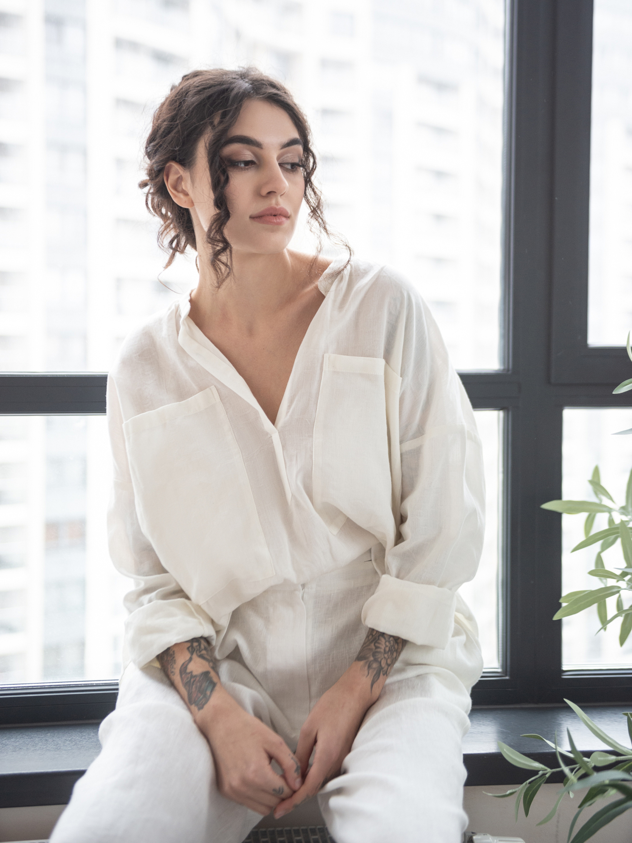 Батистова сорочка має по центру переда розріз_планку та дві великі накладні кишені. Комір-стійка. Низ довгих рукавів має застібку на петельку та дерев'яний гудзик. Під коміром по центру спинки збірка. Наша напівпрозора бавовняна сорочка ідеальна на будь-яку погоду, призначена для носіння оверсайз. Заправте її, щоб отримати об'ємну форму або носіть навипуск для вільного силуету. Ідеальна для носіння цілий рік. One size (XS-XXL) Груди 138cm Талія 138cm Стегна 138cm Довжина вироба 64cm Довжина рукава 76cm Ширина рукава 41cm Ширина низу рукава 29cm