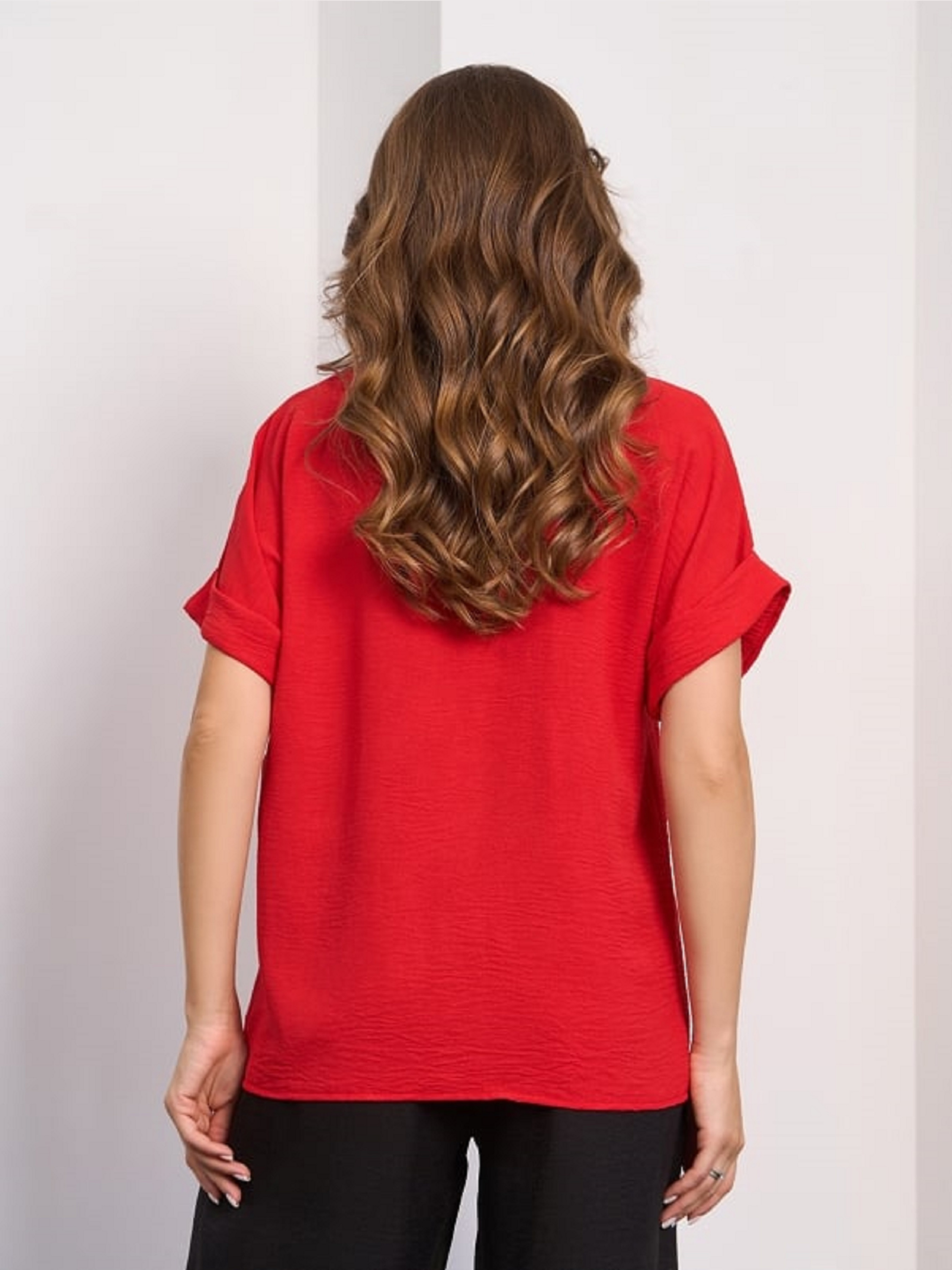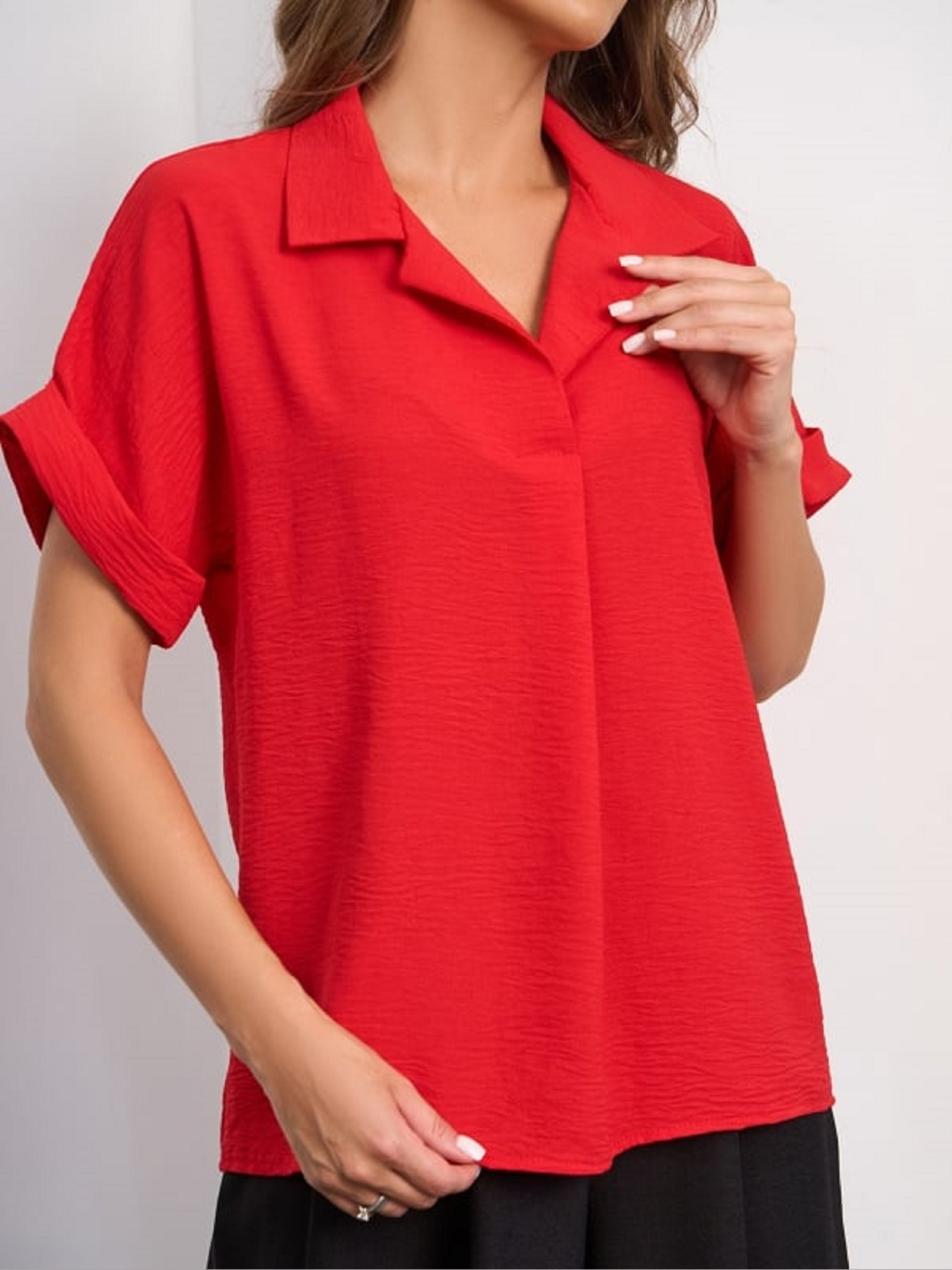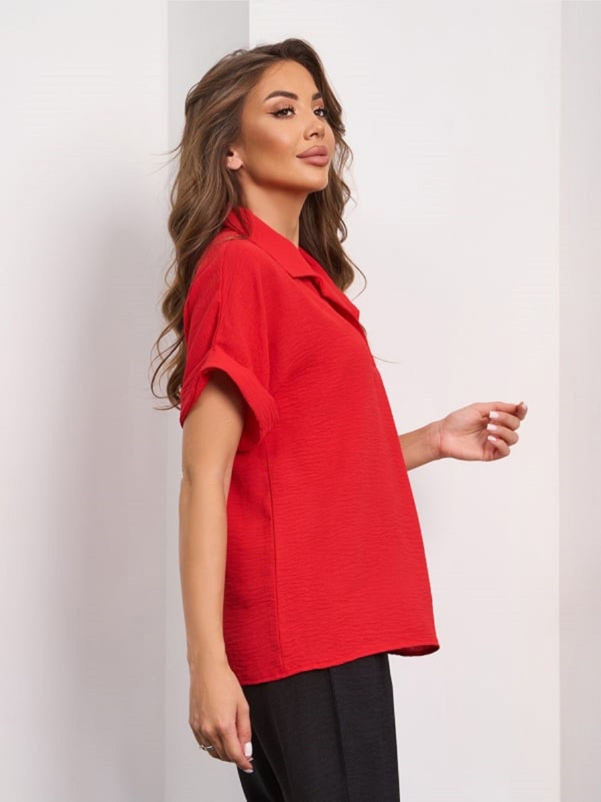 Яскрава червона блузка, виготовлена з текстурованого крепу з прямим вільним кроєм. Модель із защипом біля горловини, відкладним коміром та рукавами короткої довжини з підворотами. Напівобхват: Груди: S (51), M (53), L (55), XL (57), XXL (59), 3XL (61), Довжина виробу - 62, Рукав - 14, Тканина: Низька еластичність.
