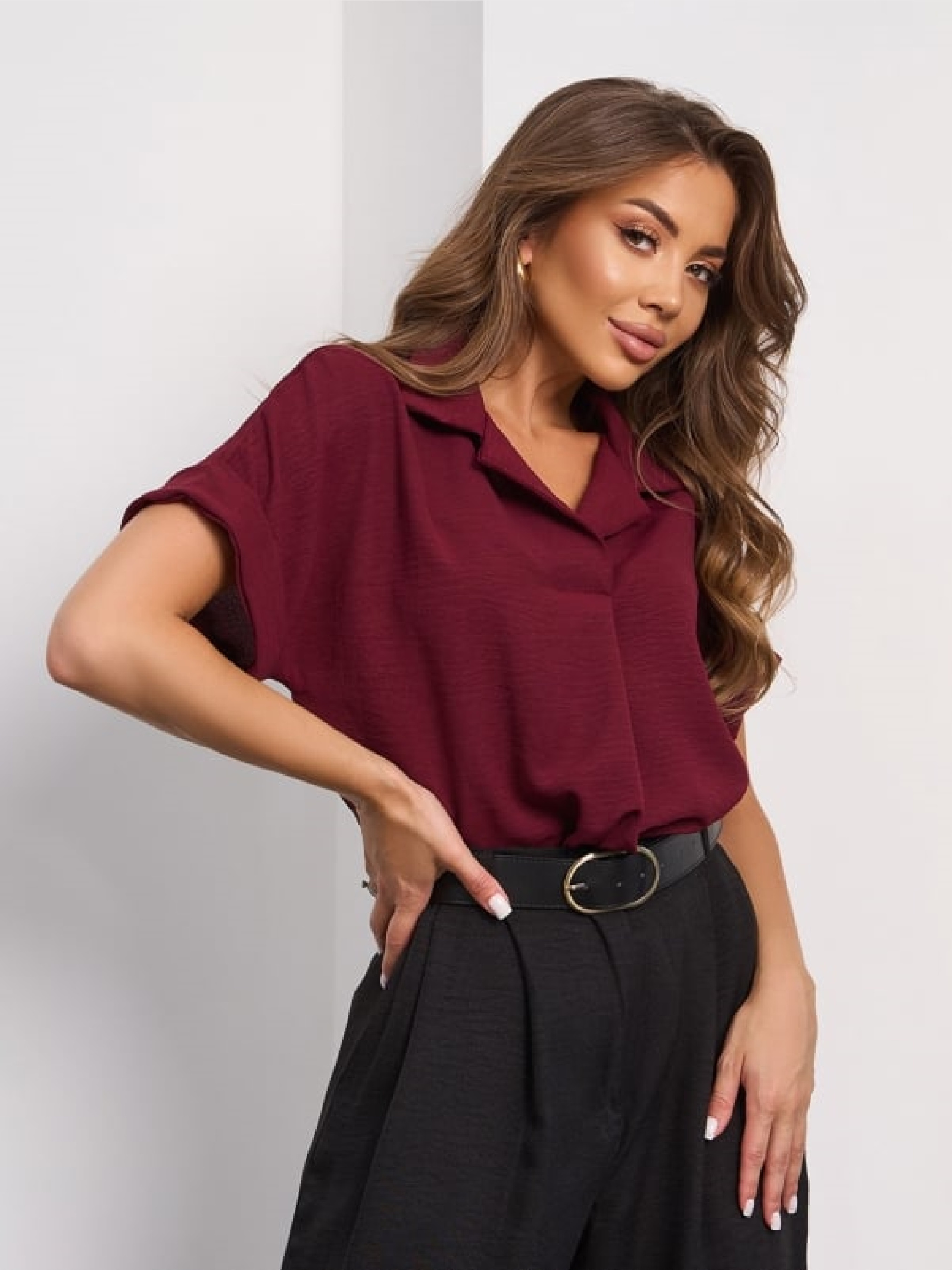 Свободна темно-бордова блузка, виготовлена з текстурованого крепу. Модель із защипом біля горловини, відкладним коміром та рукавами короткої довжини з підворотами. Напівобхват: Груди: S (51), M (53), L (55), XL (57), XXL (59), 3XL (61), Довжина виробу - 62, Рукав - 14, Тканина: Низька еластичність.