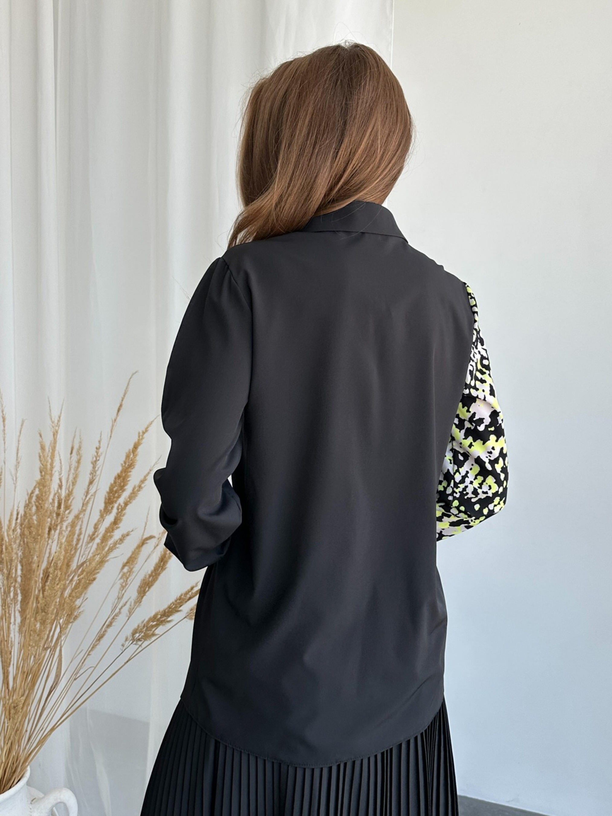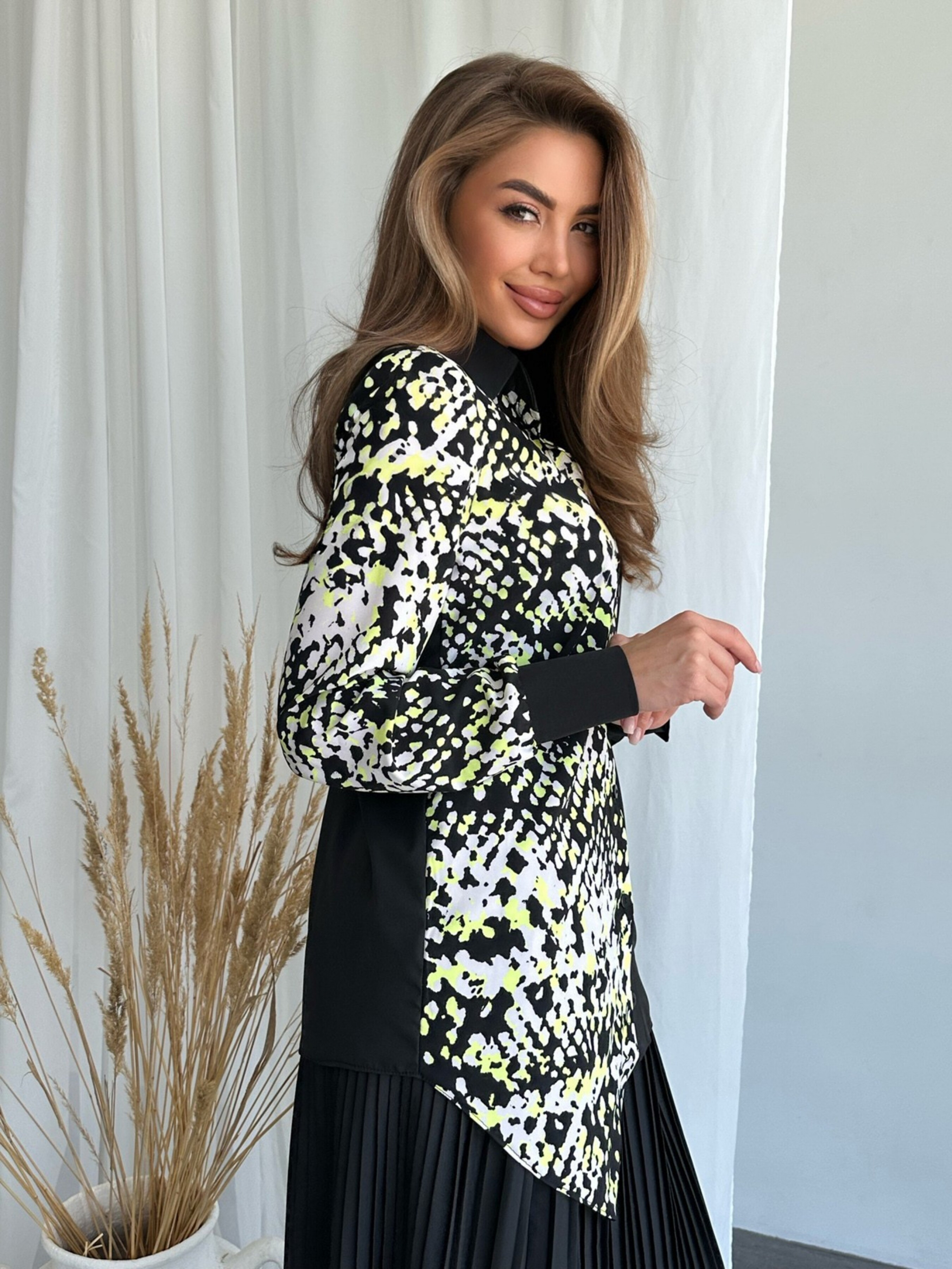 Чорно-салатова сорочка з анімалістичним принтом. Асиметрична подовжена сорочка виконана із софту. Бічна деталь виробу декорована принтом під пітона салатового кольору. Модель на ґудзиках з довгими рукавами та коміром. Сорочка зі знімним поясом. Склад: 50% бавовна, 50% поліестер. Матеріал: Софт. Напівобхват: Груди: S (48), M (50), L (52), XL (54), Довжина виробу - 71, Рукав - 62, Тканина: Низька еластична