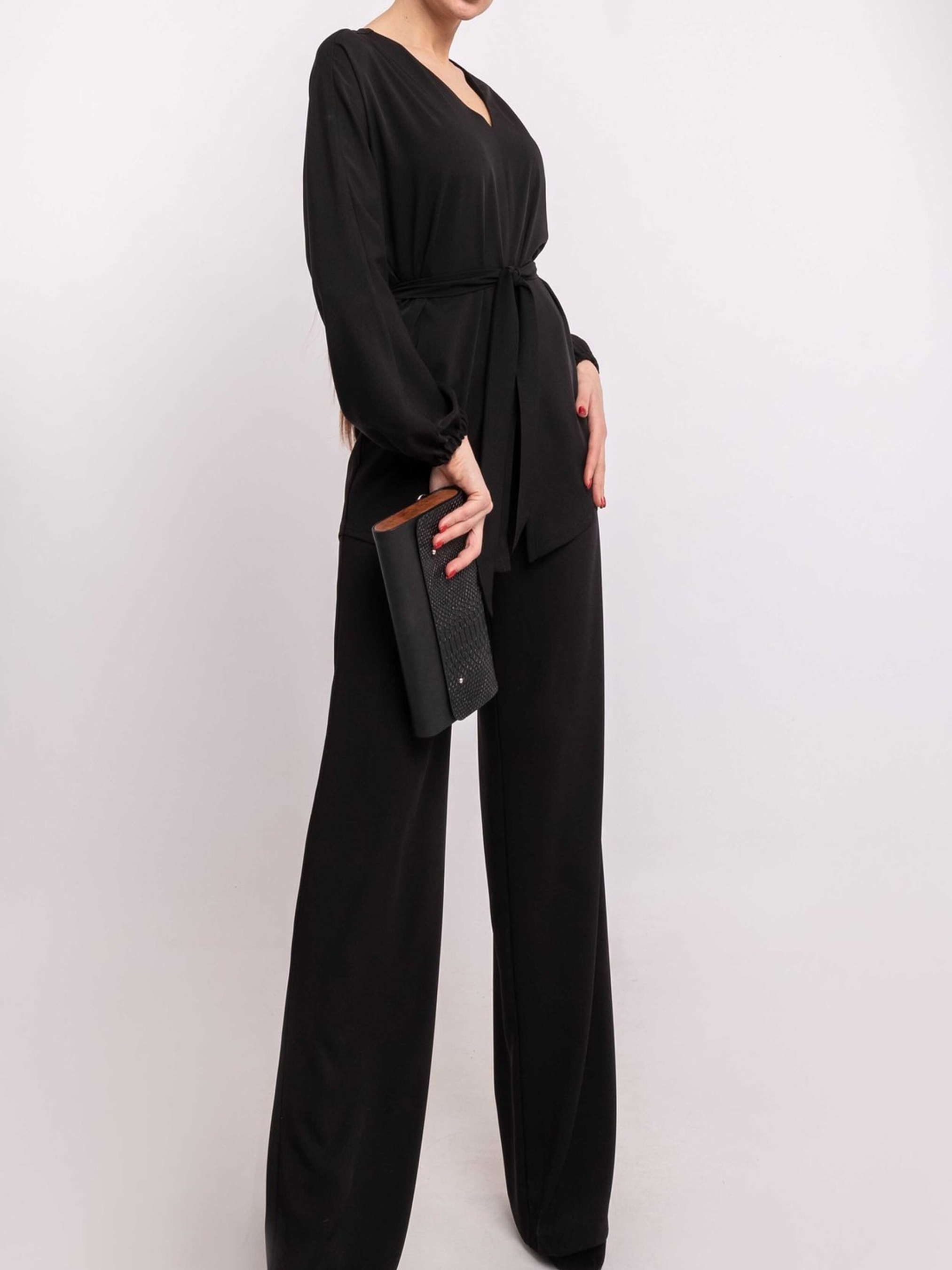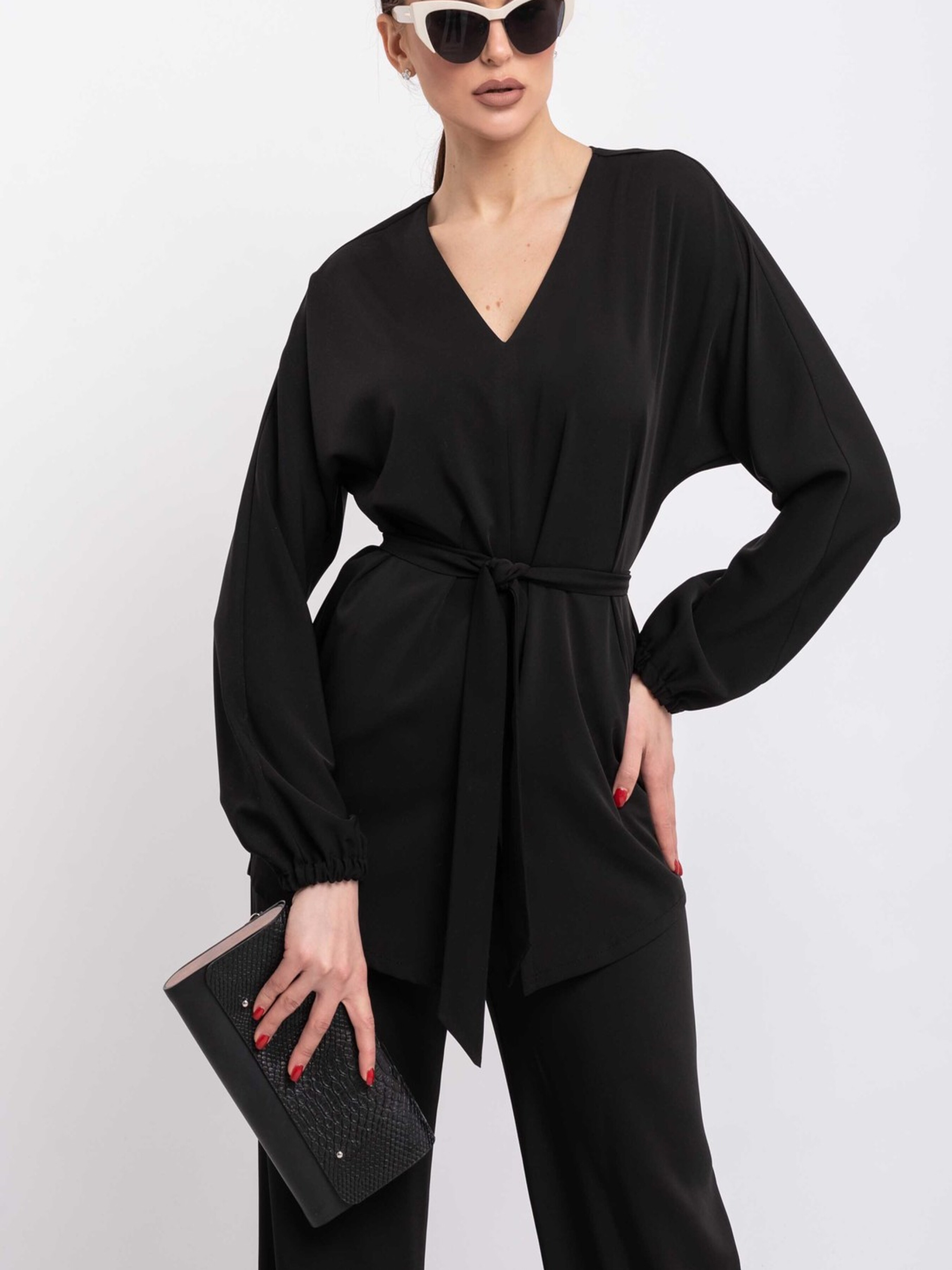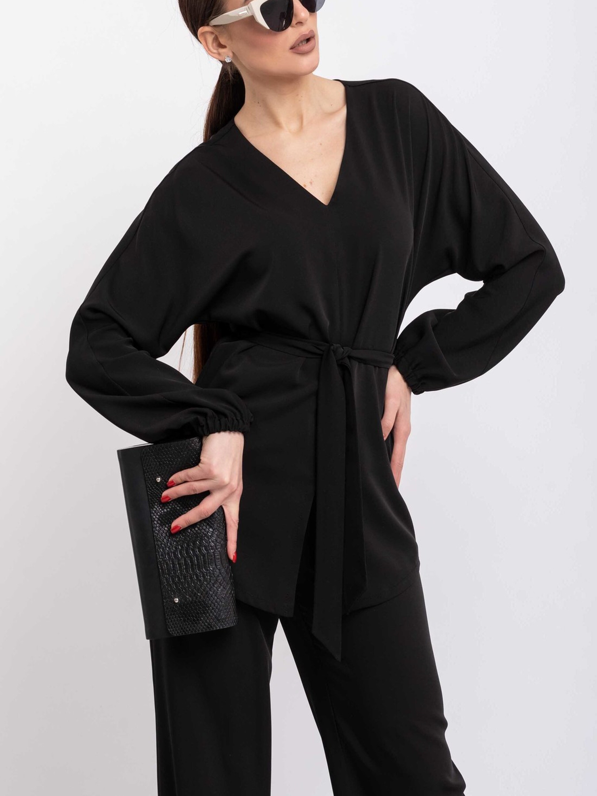Подовжена аристократична блуза, виконана з щільної тканини, що елегантно струмує, стане вишуканим доповненням вашого гардеробу. Її особливістю є розширена V-подібна горловина, яка підкреслює лінію шиї та декольте, а також цільнокроєний широкий рукав, що додає образу витонченості та свободи рухів. Передня частина блузи має акуратний центральний шов, який завершується невеликим розрізом знизу, а напівкругло-сорочковий низ спинки злегка подовжений, створюючи елегантний силует. У комплекті з блузою йде пояс з основної тканини, який допоможе підкреслити талію та завершити образ. Ця блуза чудово поєднується як з класичними брюками та спідницями, так і з більш повсякденними варіантами, підкреслюючи ваш бездоганний смак. Характеристики: Матеріал: Костюмна тканина (69% віскоза, 30% поліестер, 1% еластан) Крій: Вільний, подовжений Горловина: Розширена V-подібна Рукав: Цільнокроєний, широкий Перед: Центральний шов з розрізом знизу Спинка: Напівкругло-сорочковий низ, трохи подовжений Додатково: Пояс з основної тканини Стиль: Аристократичний, елегантний, класичний, повсякденний Властивості: Щільна тканина, що струмує, комфортна, витончений силует
