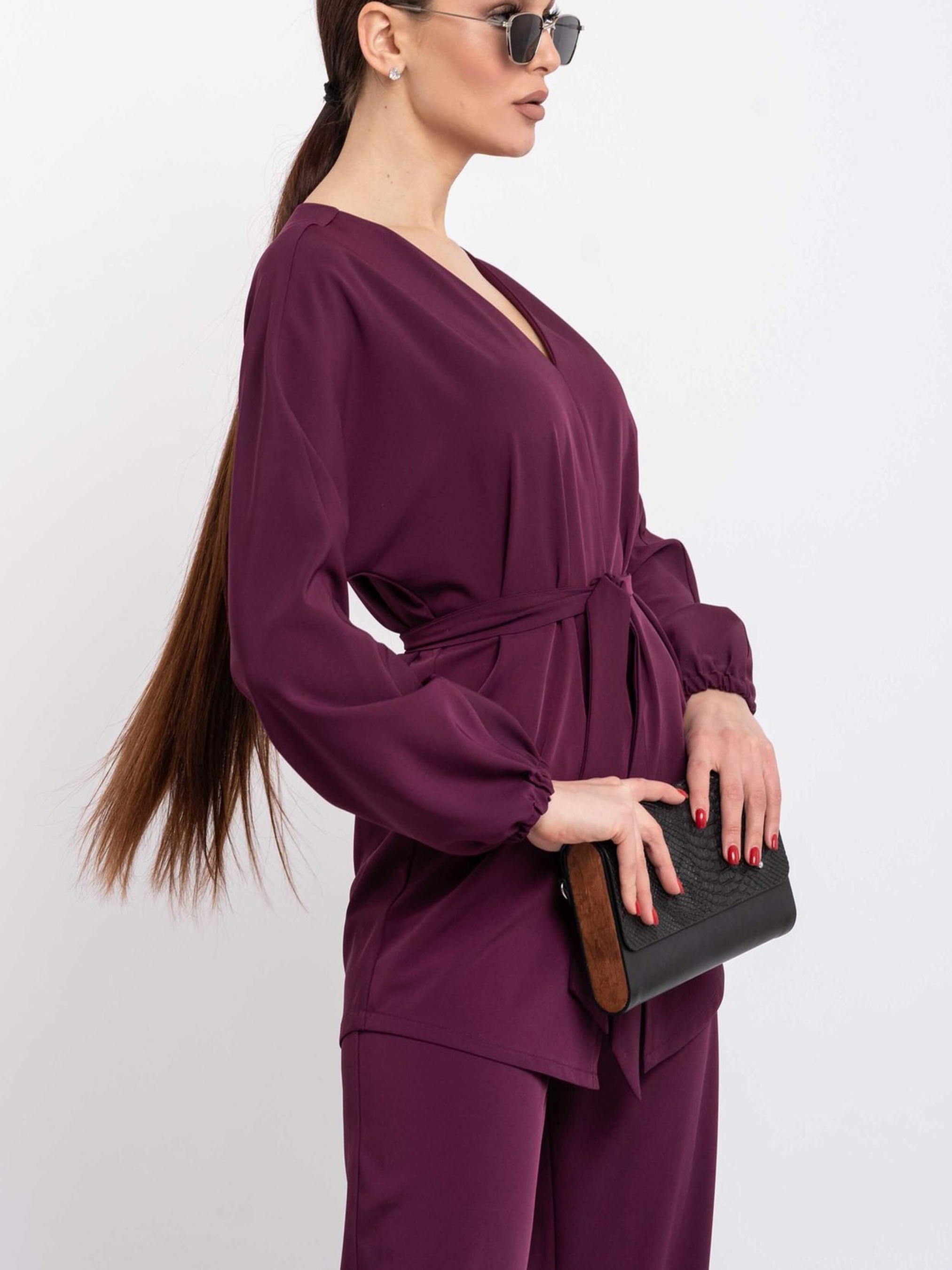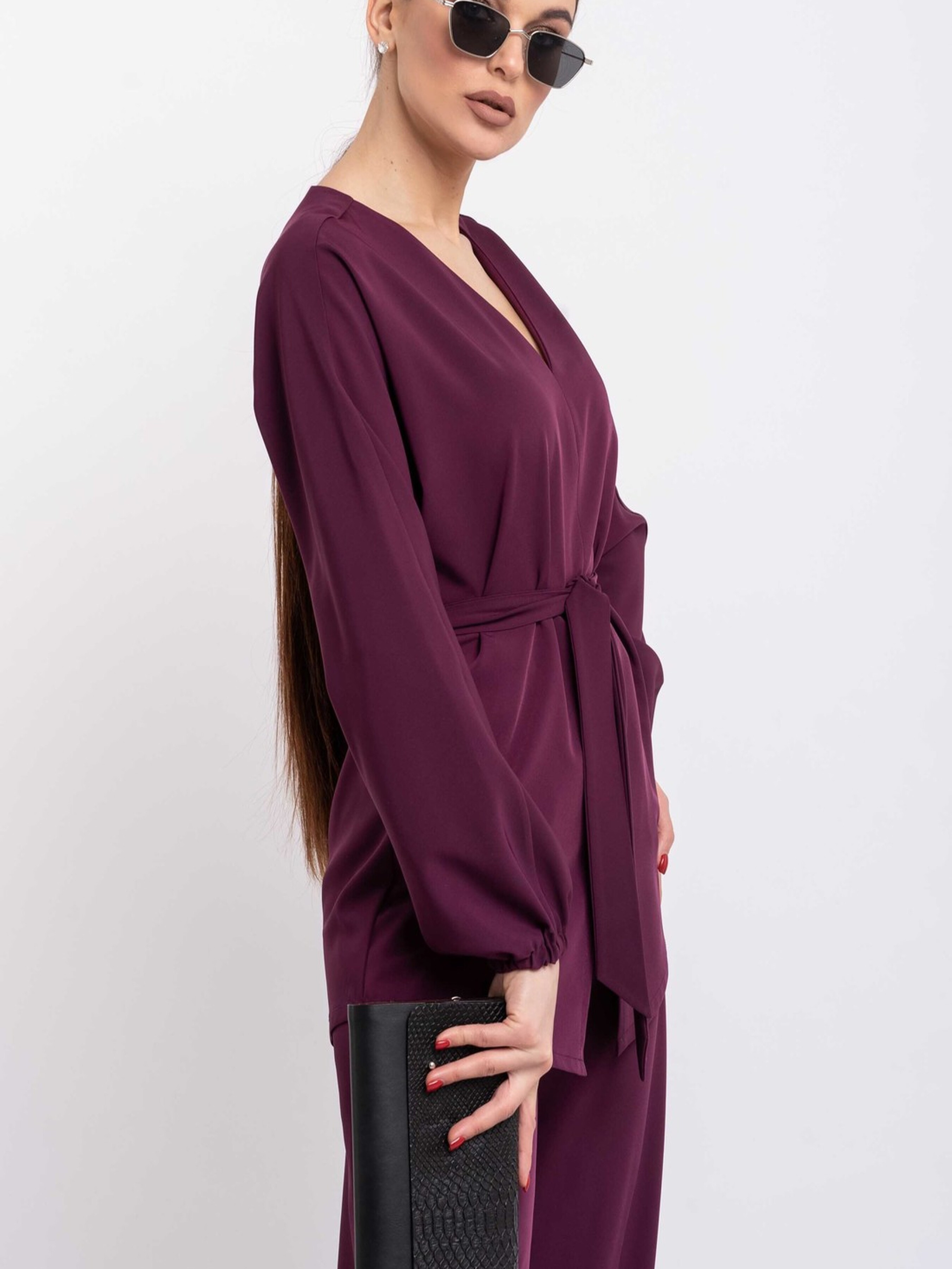 Подовжена аристократична блуза, виконана з щільної тканини, що елегантно струмує, стане вишуканим доповненням вашого гардеробу. Її особливістю є розширена V-подібна горловина, яка підкреслює лінію шиї та декольте, а також цільнокроєний широкий рукав, що додає образу витонченості та свободи рухів. Передня частина блузи має акуратний центральний шов, який завершується невеликим розрізом знизу, а напівкругло-сорочковий низ спинки злегка подовжений, створюючи елегантний силует. У комплекті з блузою йде пояс з основної тканини, який допоможе підкреслити талію та завершити образ. Ця блуза чудово поєднується як з класичними брюками та спідницями, так і з більш повсякденними варіантами, підкреслюючи ваш бездоганний смак. Характеристики: Матеріал: Костюмна тканина (69% віскоза, 30% поліестер, 1% еластан) Крій: Вільний, подовжений Горловина: Розширена V-подібна Рукав: Цільнокроєний, широкий Перед: Центральний шов з розрізом знизу Спинка: Напівкругло-сорочковий низ, трохи подовжений Додатково: Пояс з основної тканини Стиль: Аристократичний, елегантний, класичний, повсякденний Властивості: Щільна тканина, що струмує, комфортна, витончений силует