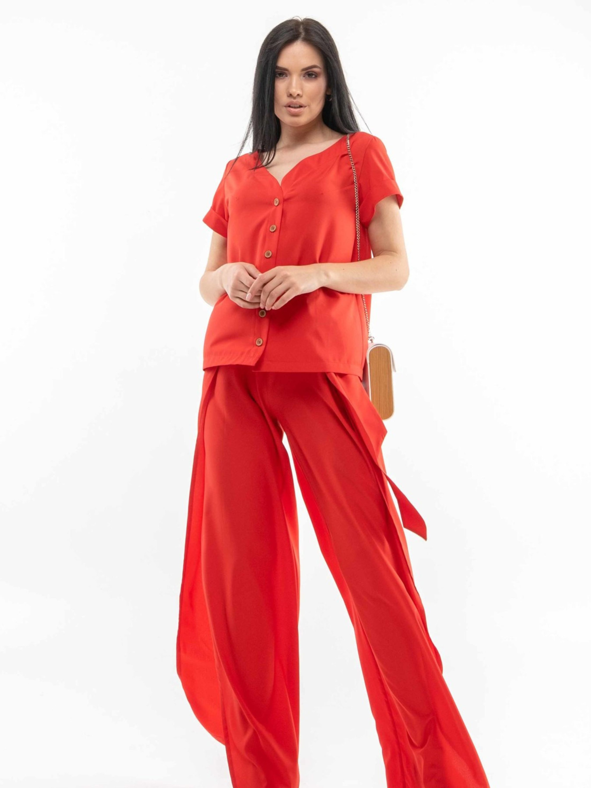 Трендова блуза вільного силуету, що елегантно сягає рівня стегон, зі спущеною лінією плеча, стане універсальним доповненням вашого гардеробу. Її елегантна розширена V-подібна горловина плавно переходить у функціональну застібку на ґудзики, додаючи образу витонченості. Широкі рукави завершуються акуратними манжетами. Ця ніжна блуза є досить класичною для офісу, але водночас легко комбінується з різними елементами гардеробу, допомагаючи створювати безліч стильних образів. Залежно від кольору, блуза виготовлена з різних, але однаково приємних до тіла тканин: Беж, капучино: Легкий та струмливий аер флоу муслін. Темно-синій, червоний: М'який та комфортний софт. Обидва матеріали забезпечують приємні тактильні відчуття та гарну посадку. Характеристики (залежно від кольору): Матеріал (беж, капучино): Аер флоу муслін (34% віскоза, 56% поліестер, 10% бавовна) - легка, струмлива тканина. Матеріал (т.синій, червоний): Софт (34% віскоза, 56% поліестер, 10% бавовна) - м'яка, приємна тканина. Крій: Вільний силует Довжина: До рівня стегон Горловина: Розширена V-подібна, переходить у застібку на ґудзики Рукав: Широкий, спущена лінія плеча, манжета Стиль: Універсальний, офісний (класичний), повсякденний, ніжний Властивості: Комфортна посадка, приємна тканина, легко комбінується