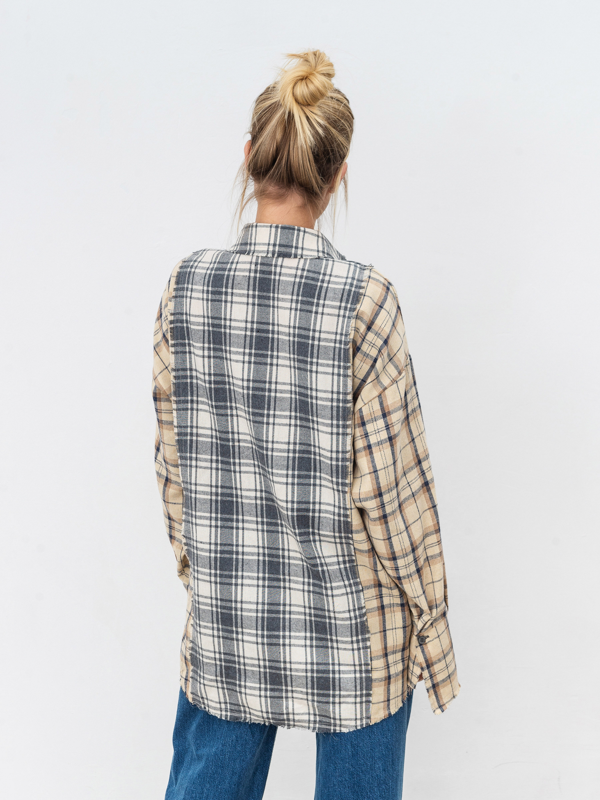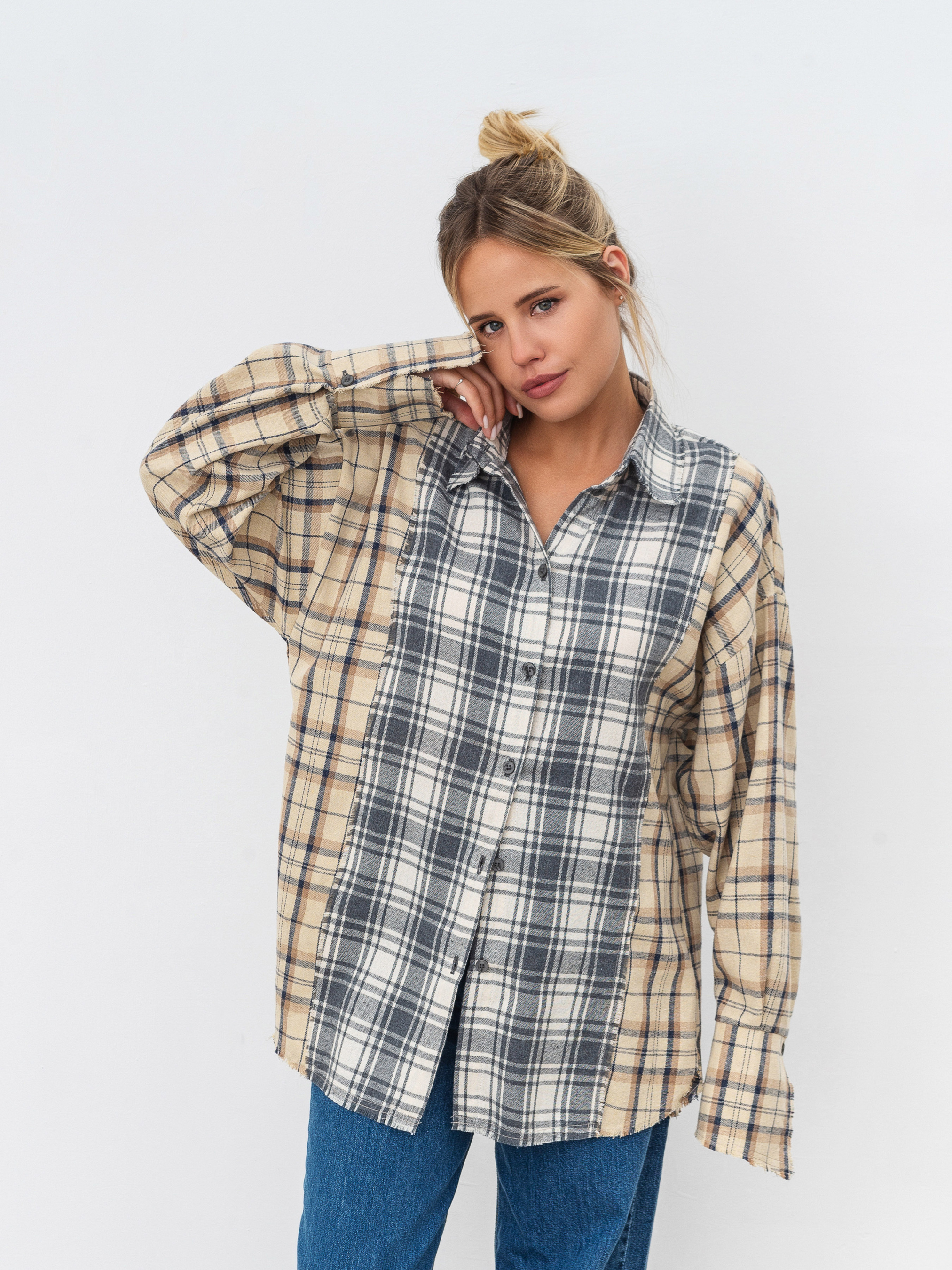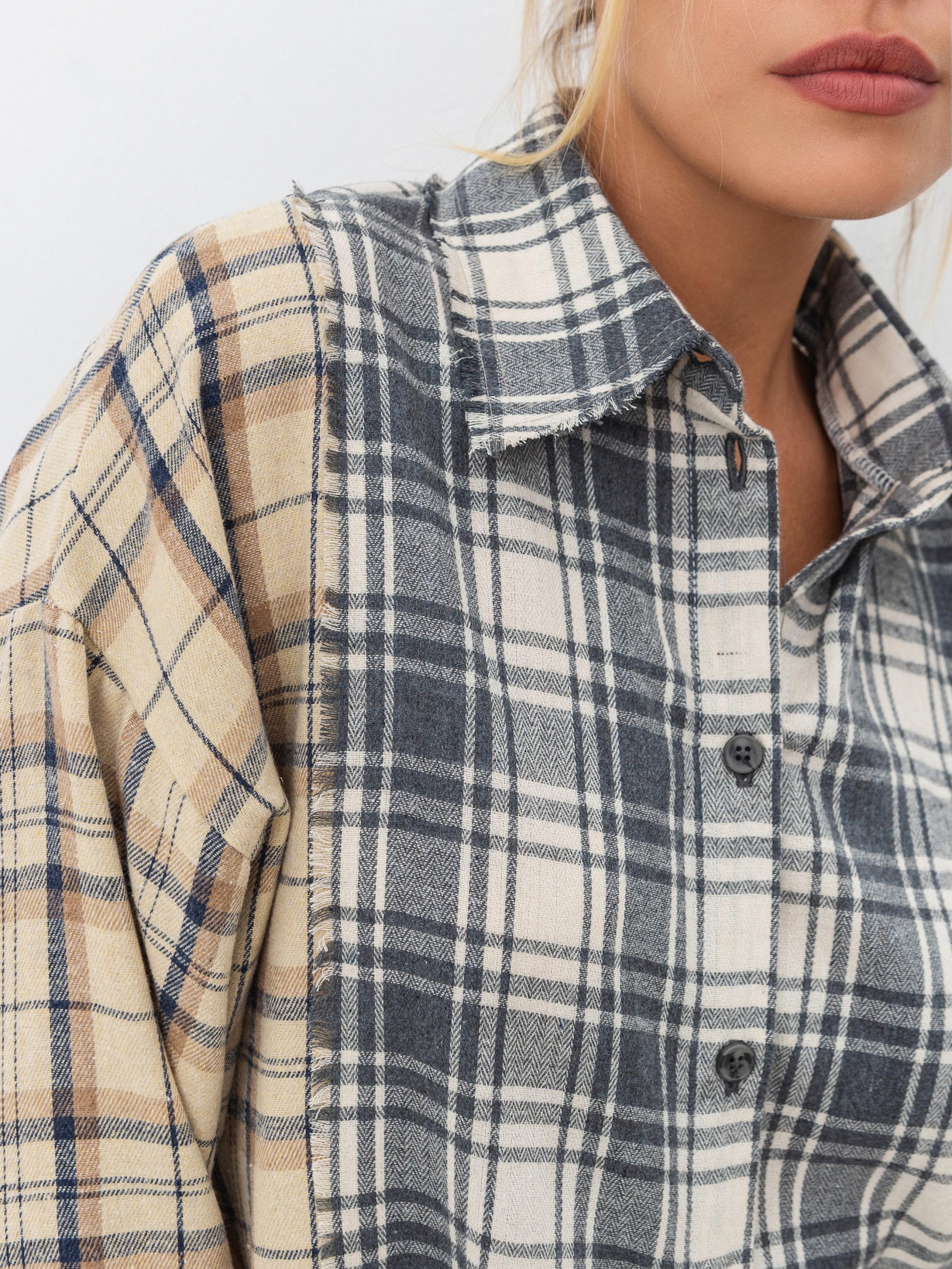 Сорочка з комбінованої байки. Вільний фасон з легка подовженими манжетами. Краї невідпрацьовані. Ідеально впишеться в образ із косухою та джинсами. XS-S Довжина по спині : 76 см Довжина рукава : 57 см Напівобхват грудей : 51 см Плечі : 55 см Напівобхват талії : 50 см S-M Довжина по спині : 76 см Довжина рукава : 57 см Напівобхват грудей : 55 см Плечі : 57 см Напівобхват талії : 54 см M-L Довжина по спині : 76 см Довжина рукава : 57 см Напівобхват грудей : 57 см Плечі : 59 см Напівобхват талії : 56 см L-XL Довжина по спині : 76 см Довжина рукава : 57 см Напівобхват грудей : 51 см Плечі : 55 см Напівобхват талії : 50 см XL-XXL Довжина по спині : 76 см Довжина рукава : 57 см Напівобхват грудей : 51 см Плечі : 55 см Напівобхват талії : 50 см