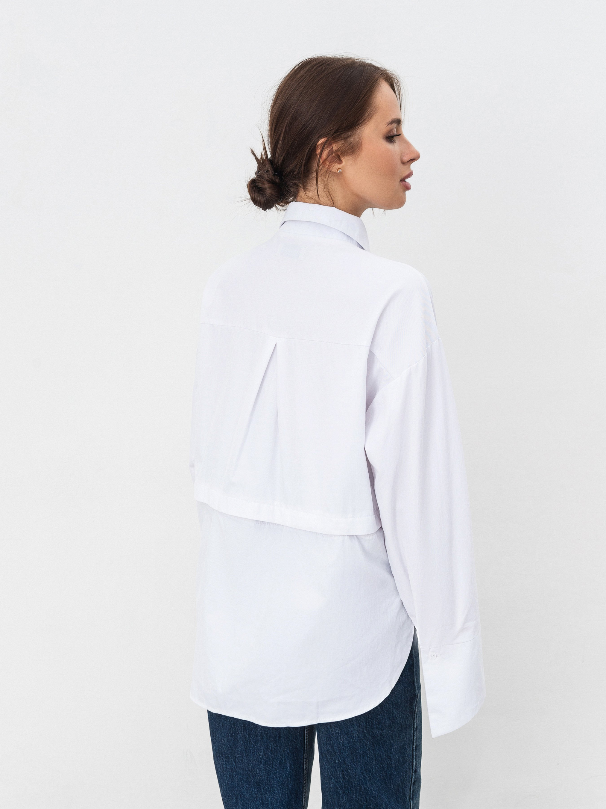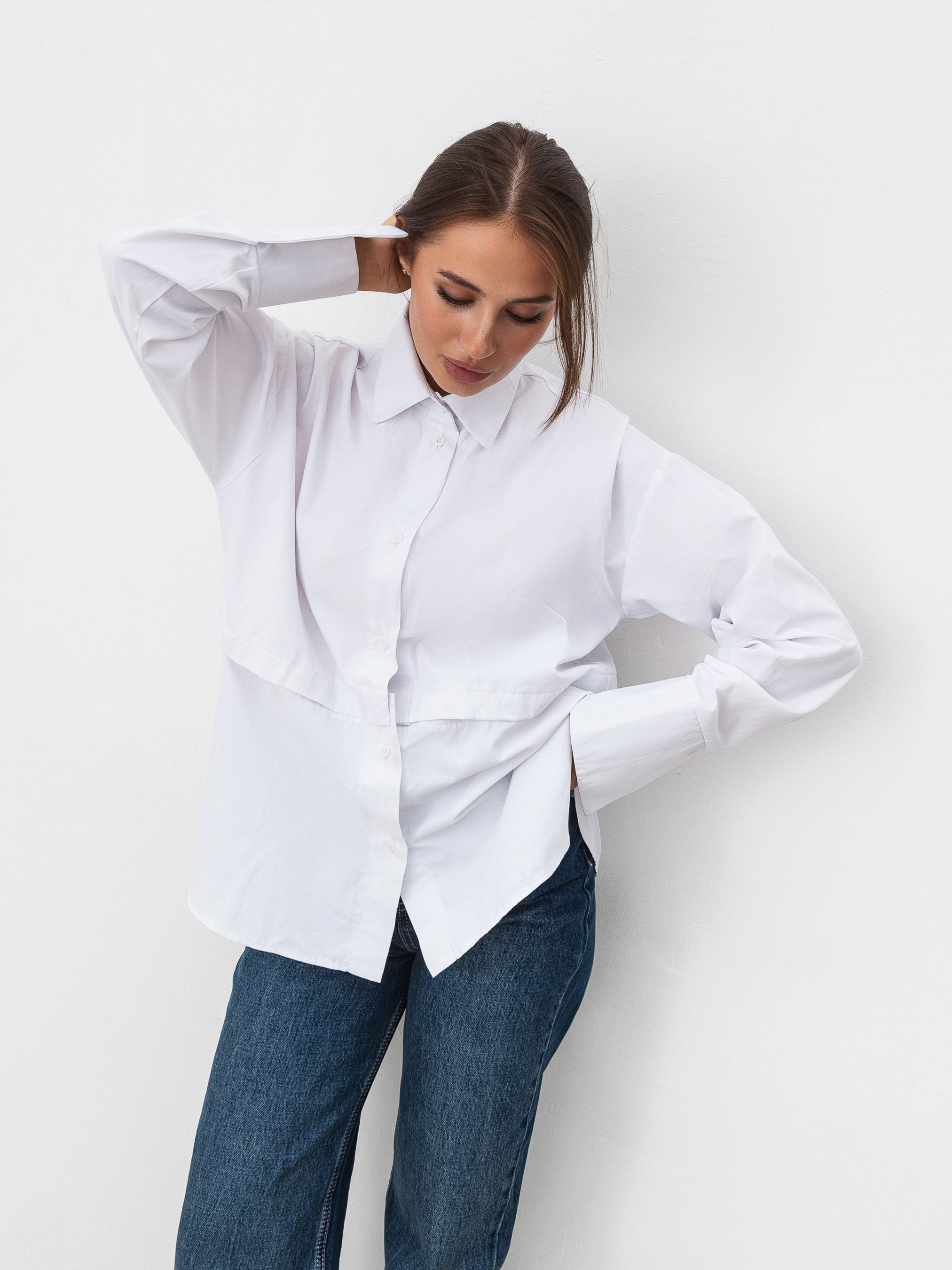 Сорочка поєднує в собі класичну модель та вкорочену. Приховані ґудзики на лінії талії дозволяють відстібнути нижню частину й носити вкорочену версію. Модель має подовжені манжети на ґудзиках. З боків є невеликі розрізи для комфортного носіння.