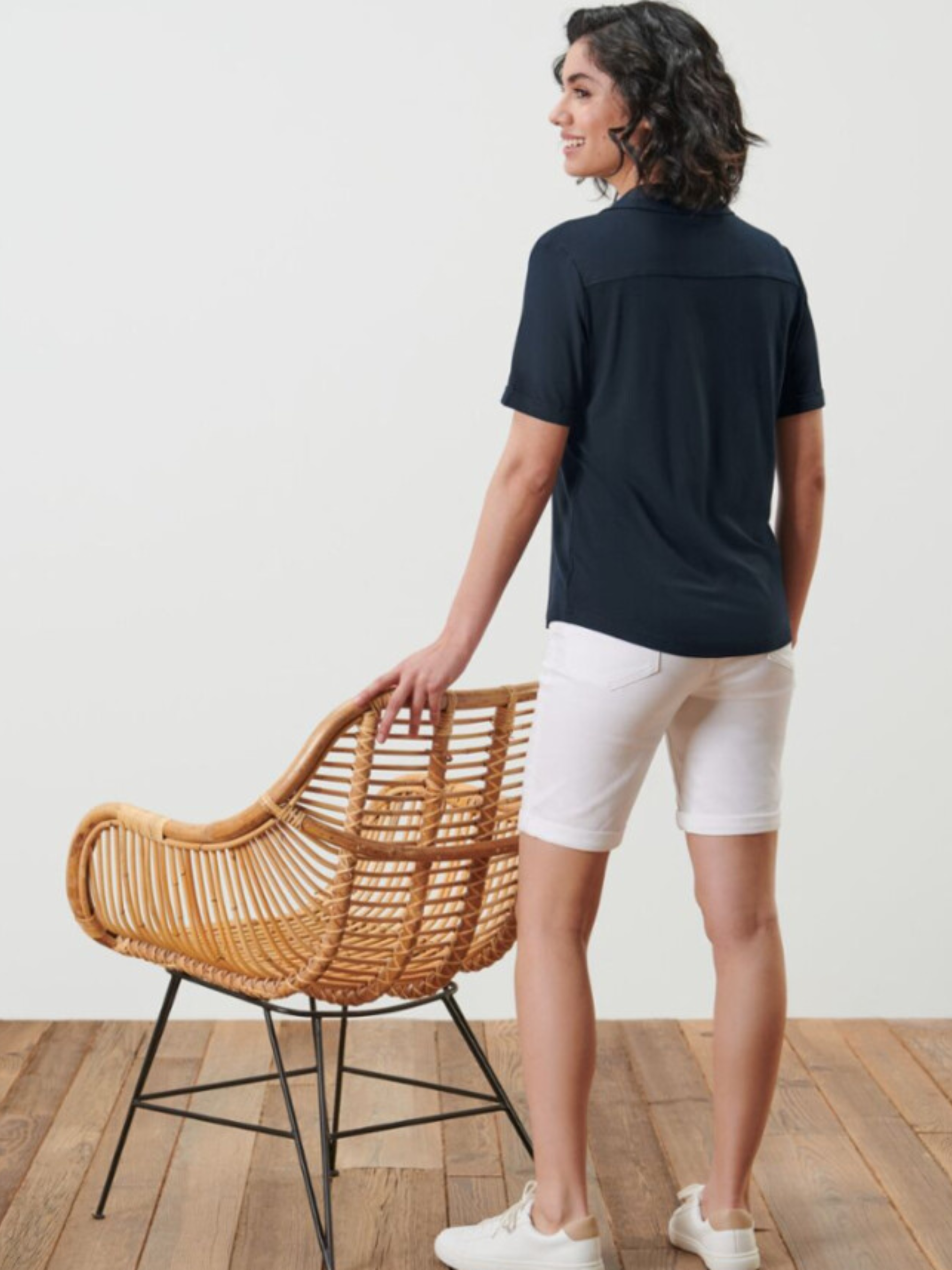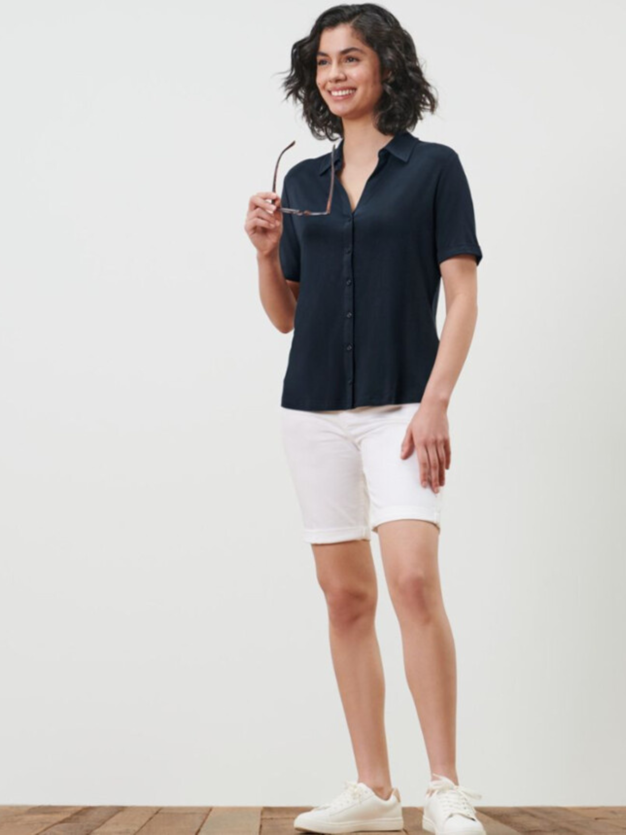 М'яка, струмлива віскозна еластична тканина Застібка на ґудзики спереду V-подібний виріз з коміром Закруглений поділ З еластаном: зберігає форму, ідеально сидить і надзвичайно комфортна Ця блузка-сорочка містить волокна з екологічно чистої деревини. Колір - Темно-синій Матеріал - 95% віскоза, 5% еластан (Creora®) Розмір наш 50-52(44/46 євро) ПОГ: 57 см. Довжина:65 см Одяг бренду Tchibo зазвичай не має паперових етикеток. У більшості випадків внутрішні бірки зі складом тканини, назвою бренду або розміром зрізані частково або повністю.