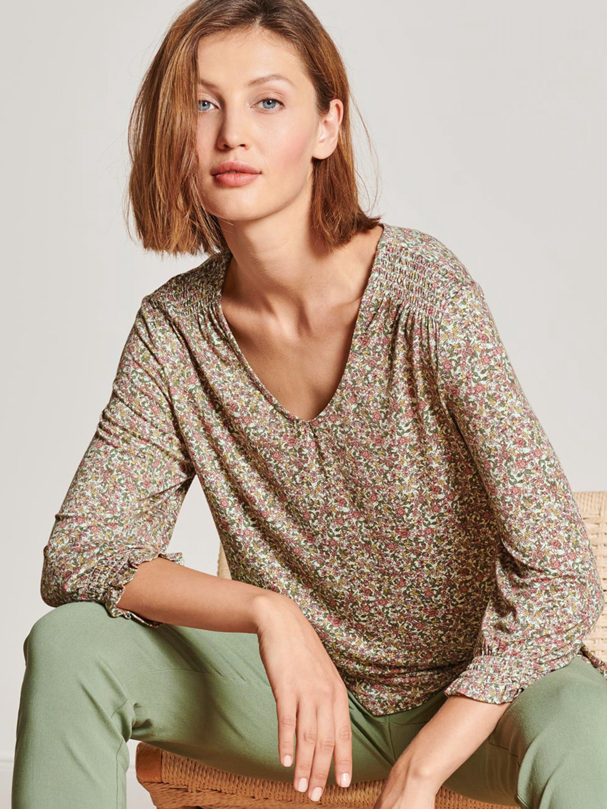 М’яка, текуча віскоза, еластична якість. Манжети з оборками. Злегка закруглений V-подібний виріз. З еластаном: зберігає форму, ідеальна посадка, високий комфорт при носінні. Перевірено на вміст шкідливих речовин – сторонніми акредитованими інститутами. Колір: Різнокольоровий квітковий принт по всій поверхні. Склад: 95% віскоза, 5% еластан. 36/38 євро розмір (42/44 або XS/S європейський) ПОГ: 47 см, Довжина рукава: 44 см, Довжина: 61 см. 44/46 євро розмір (50/52 або XL/XXL європейський) ПОГ: 58 см, Довжина рукава: 45 см, Довжина: 65 см. Зверніть увагу, вказано розміри за Євро шкалою (Український розмір = Євро + 6) Одяг бренду TCM Tchibo практично весь без паперових етикеток, за рідкісним винятком, і зі зрізаними частково або повністю внутрішніми бірками і ярликами зі складом тканини та іншими даними.