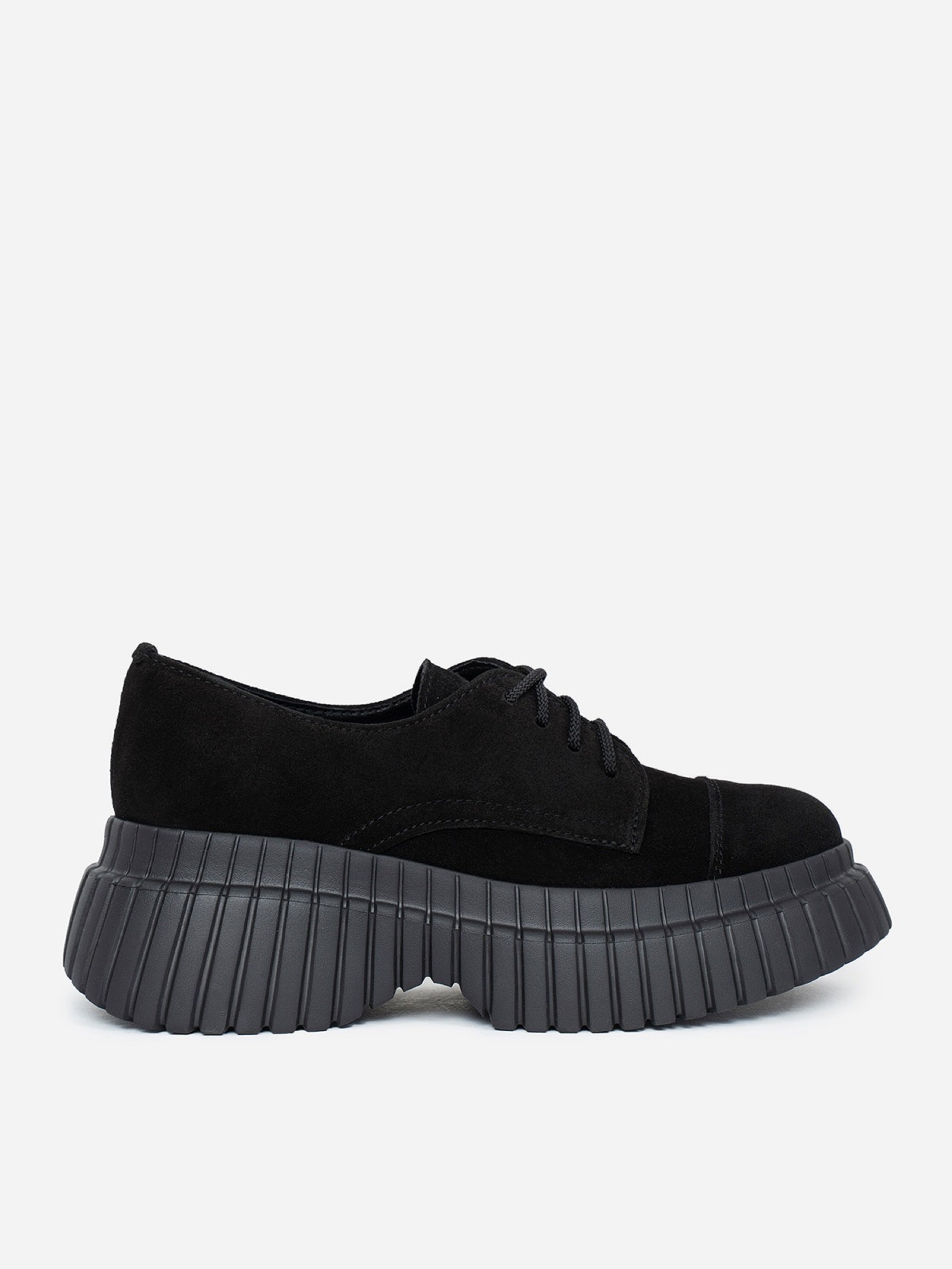 Полегшені туфлі дербі на високій підошві. Модель зі шнурівкою виготовлена з натуральної чорної замші.Матеріал верху: натуральна замша. Підклад: натуральна шкіра. Підошва: EVA (Ева)Висота підошви: 6 см та 3,5 см. Заміри: 36 (23), 37 (23,5), 38 (24), 39 (24,5), 40 (25), 41 (25,5).