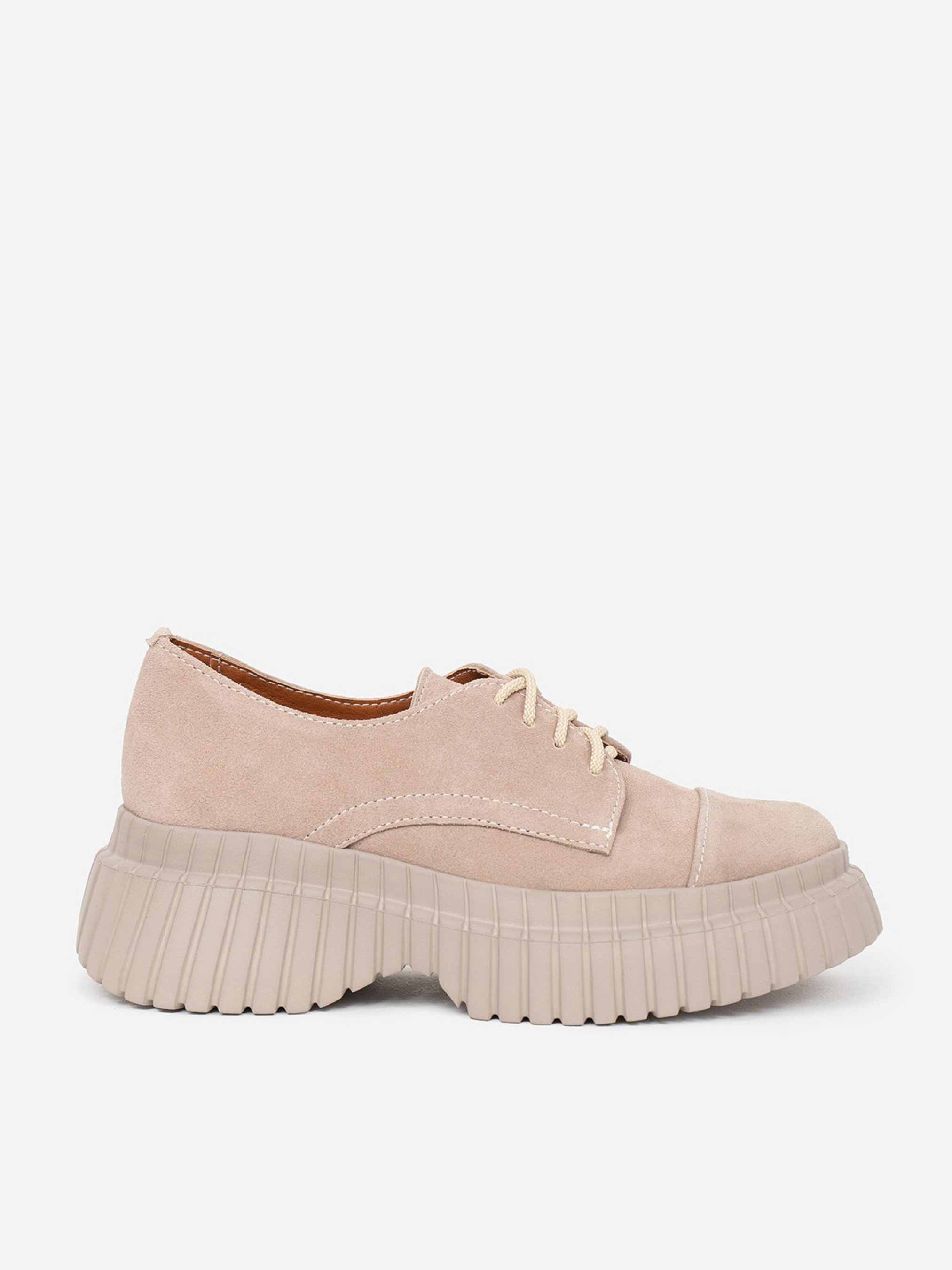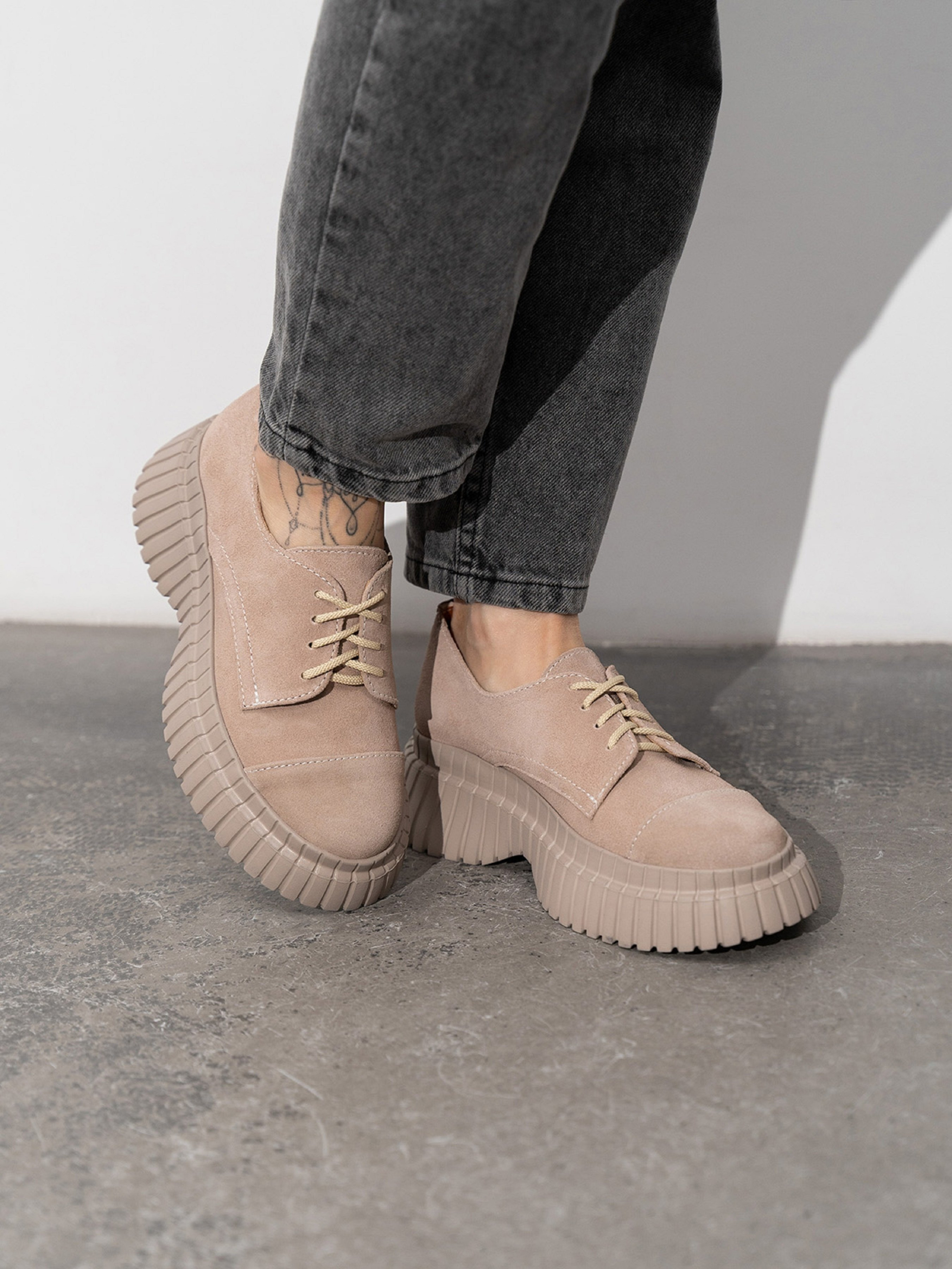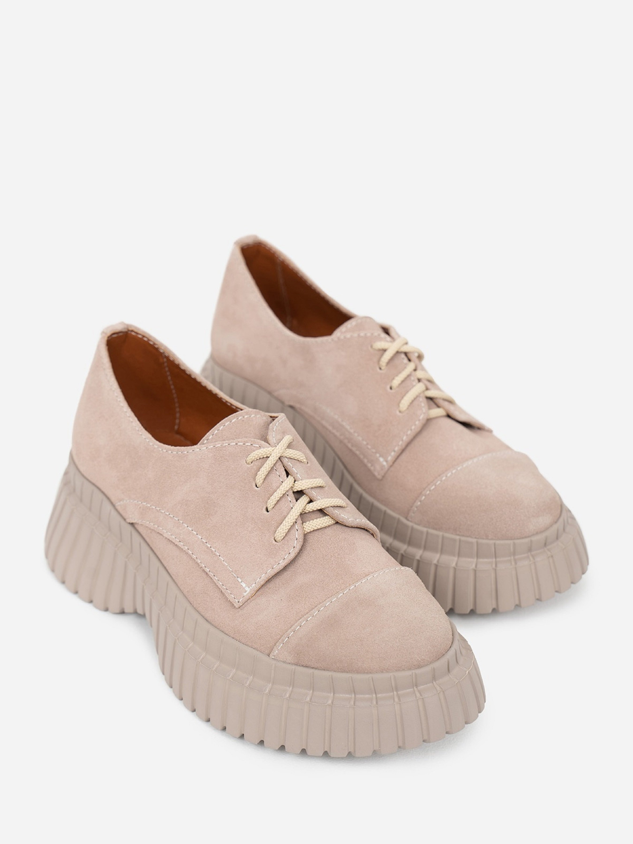 Полегшені туфлі дербі на високій підошві. Модель зі шнурівкою виготовлена з натуральної замші бежевого кольору.Матеріал верху: натуральна замша. Підклад: натуральна шкіра. Підошва: EVA (Ева)Висота підошви: 6 см та 3,5 см. Заміри: 36 (23), 37 (23,5), 38 (24), 39 (24,5), 40 (25), 41 (25,5).
