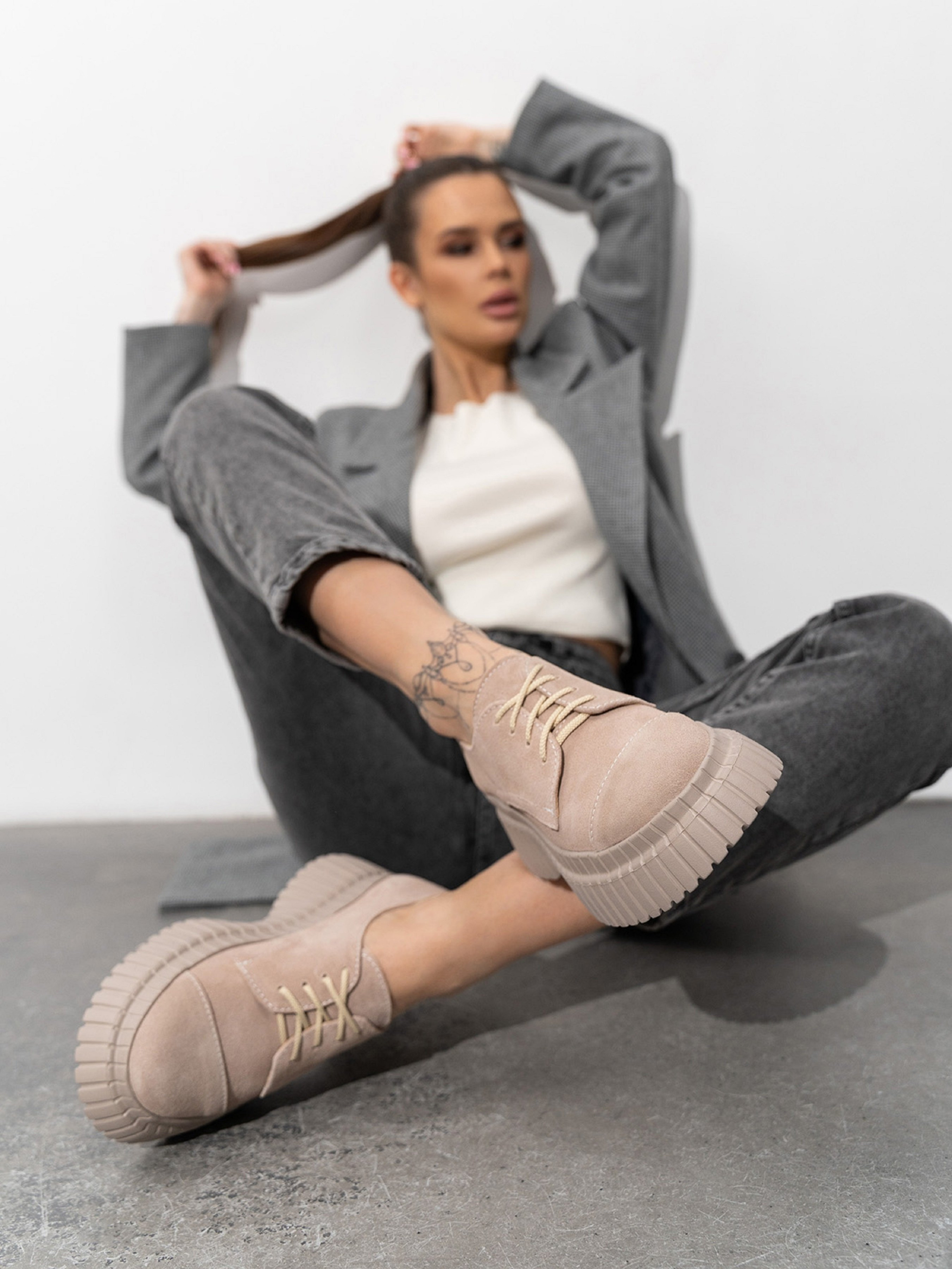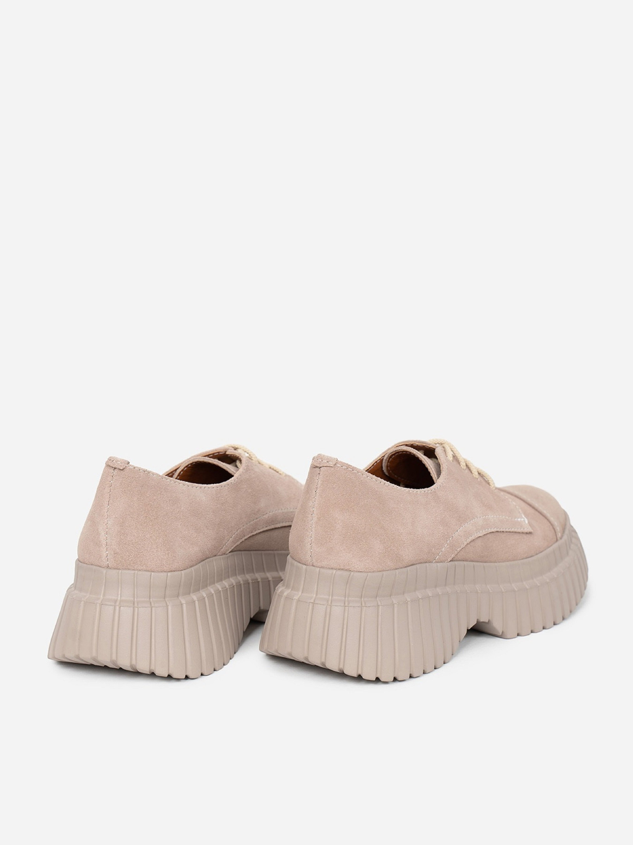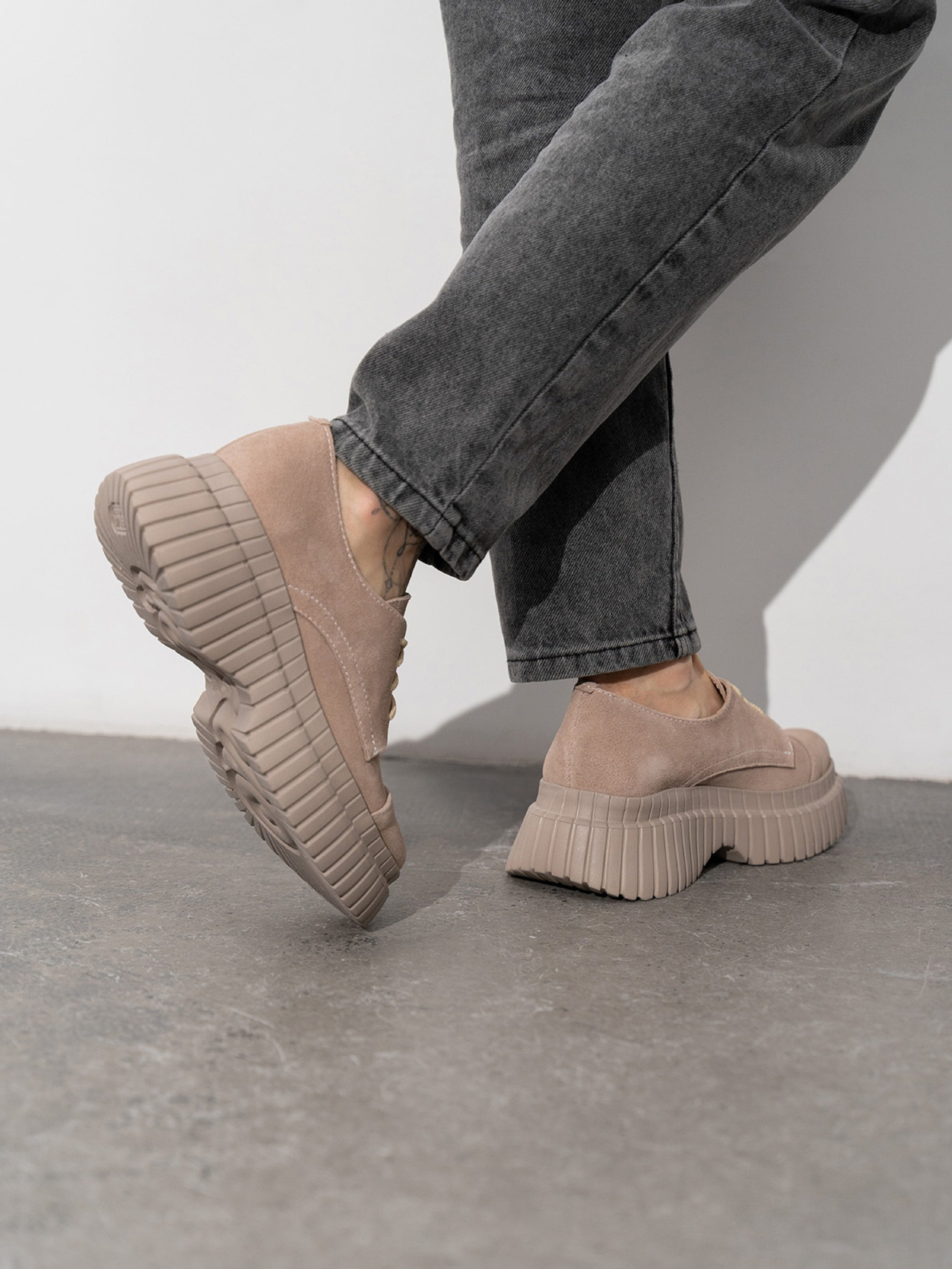 Полегшені туфлі дербі на високій підошві. Модель зі шнурівкою виготовлена з натуральної замші бежевого кольору.Матеріал верху: натуральна замша. Підклад: натуральна шкіра. Підошва: EVA (Ева)Висота підошви: 6 см та 3,5 см. Заміри: 36 (23), 37 (23,5), 38 (24), 39 (24,5), 40 (25), 41 (25,5).