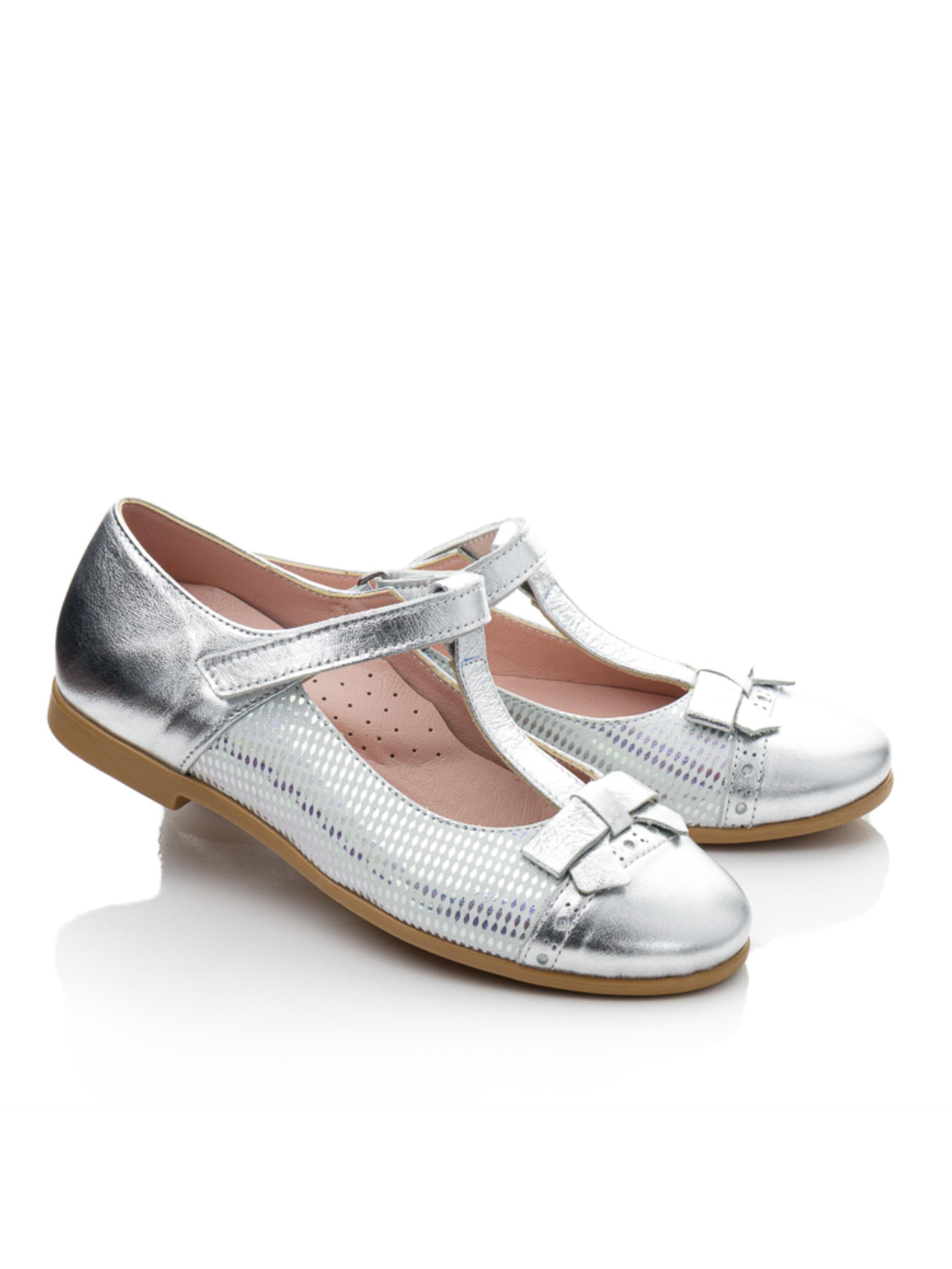 Шукаєте стильні туфлі для школи або святкової події? Сріблясті туфлі для дівчат виглядають святково й водночас стримано — саме те, що потрібно для школи! Виготовлені з натуральної шкіри, модель має м’яку шкіряну підкладку, супінатор для підтримки стопи та жорсткий задник для формування правильної ходи. Вставка з принтованої шкіри та бантик додають взуттю вишуканого вигляду. Завдяки зручній липучці туфлі легко надягати та знімати, що особливо зручно для дитини. Комфорт, якість і краса — все в одній парі!