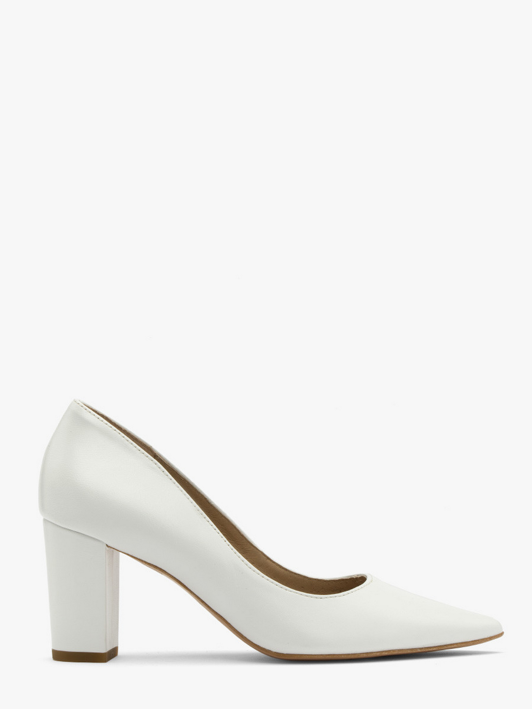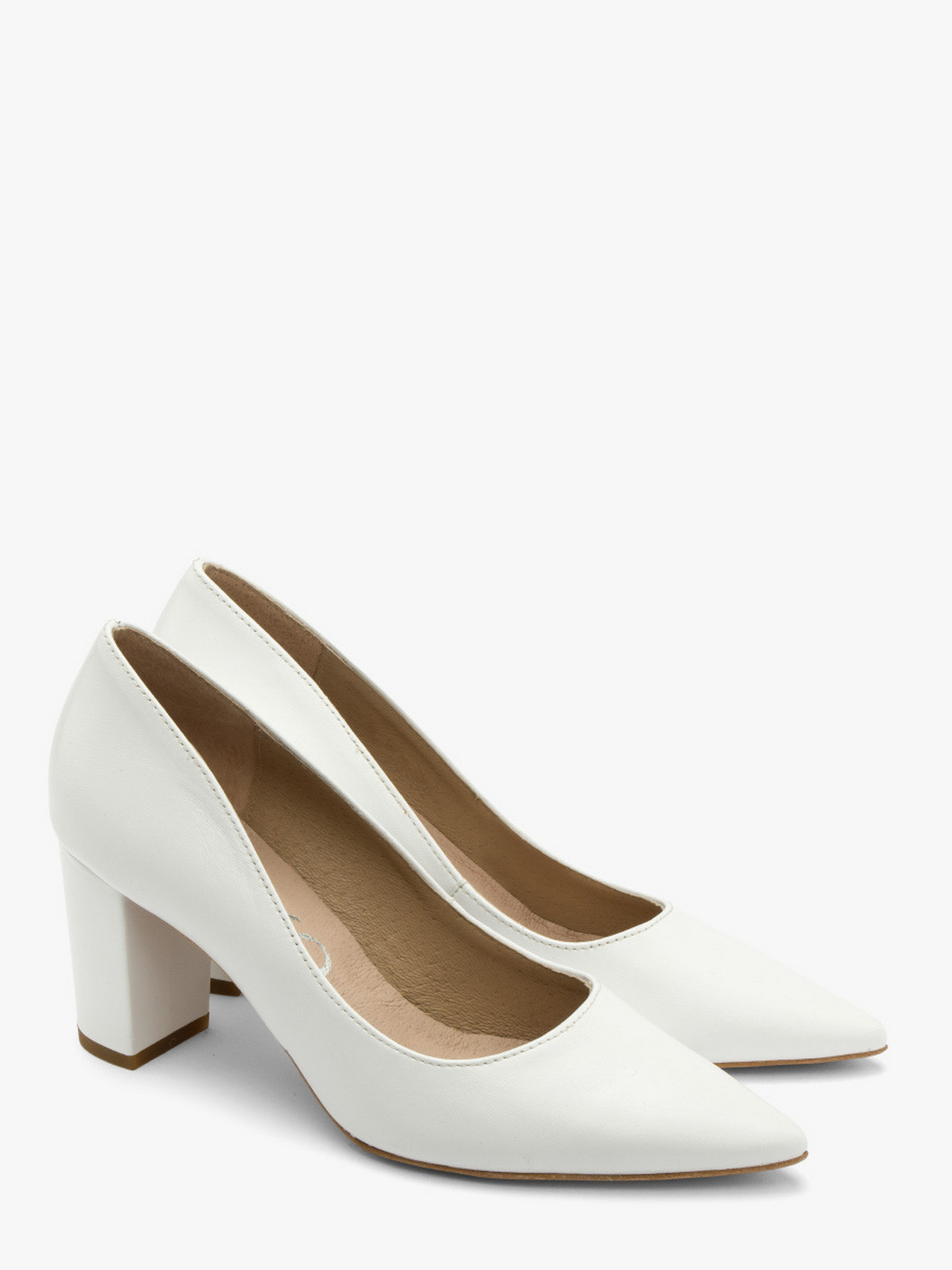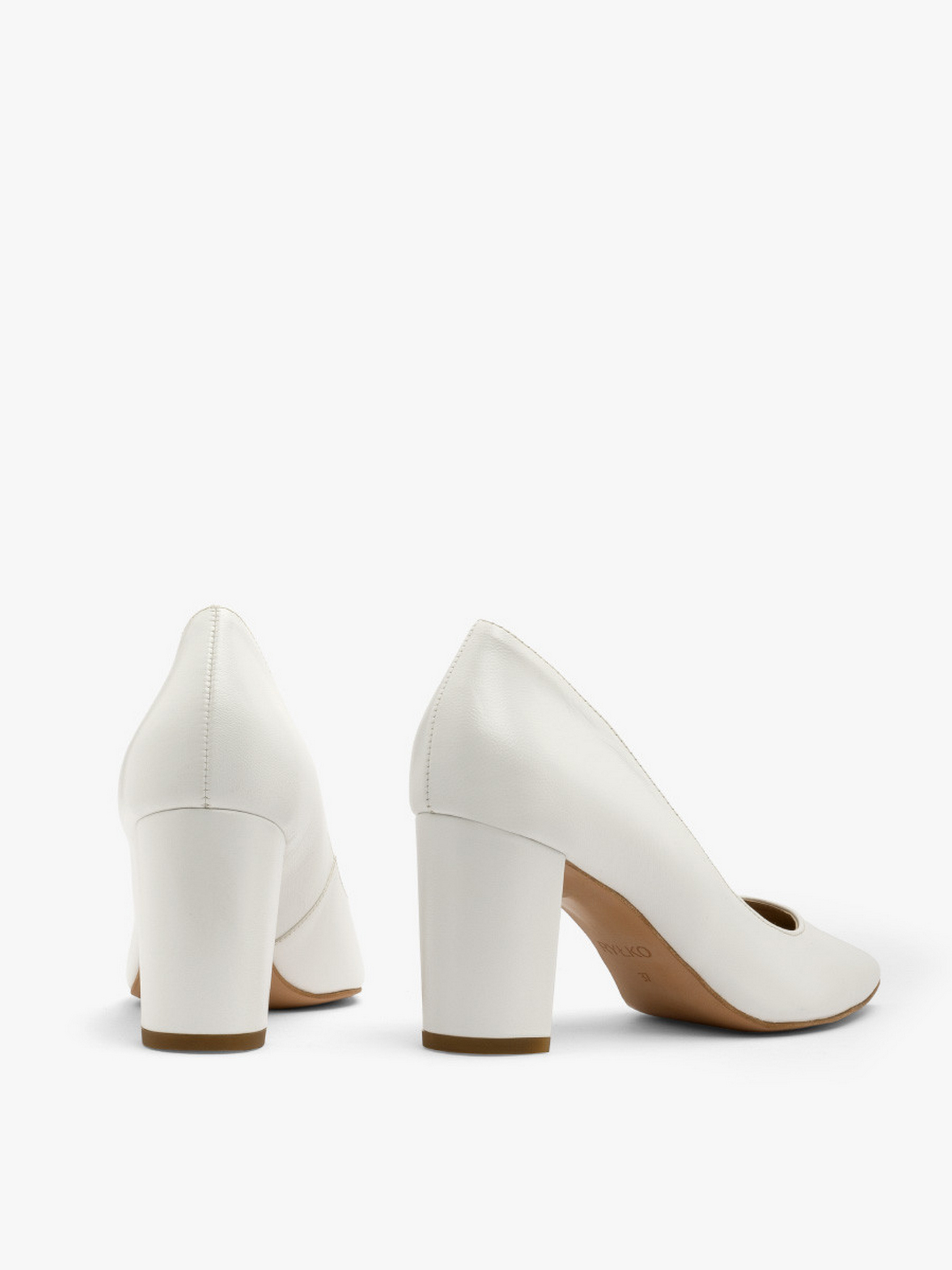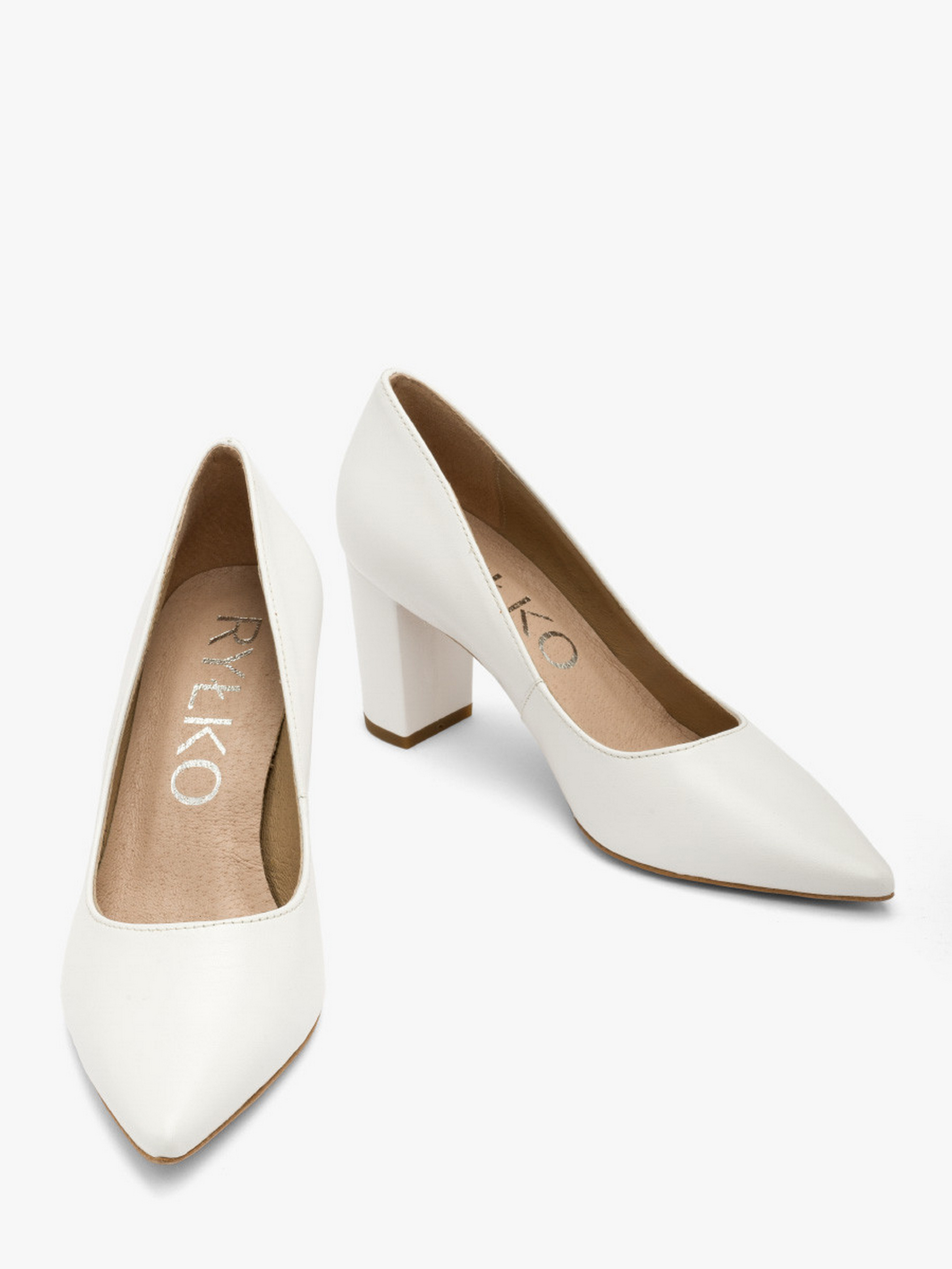 Шкіряні туфлі-човники польського виробника RYŁKO білого кольору. Виконані з натуральної лицьової шкіри високої якості. Підходять на стандартну (середню) повноту стопи. Модель має зручний широкий каблук заввишки 7,5 см, обтягнутий шкірою. Підкладка та устілка – натуральна шкіра. Носок - шпиль.