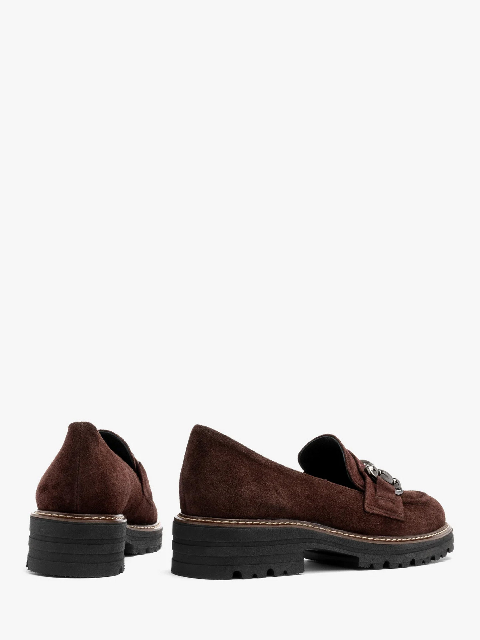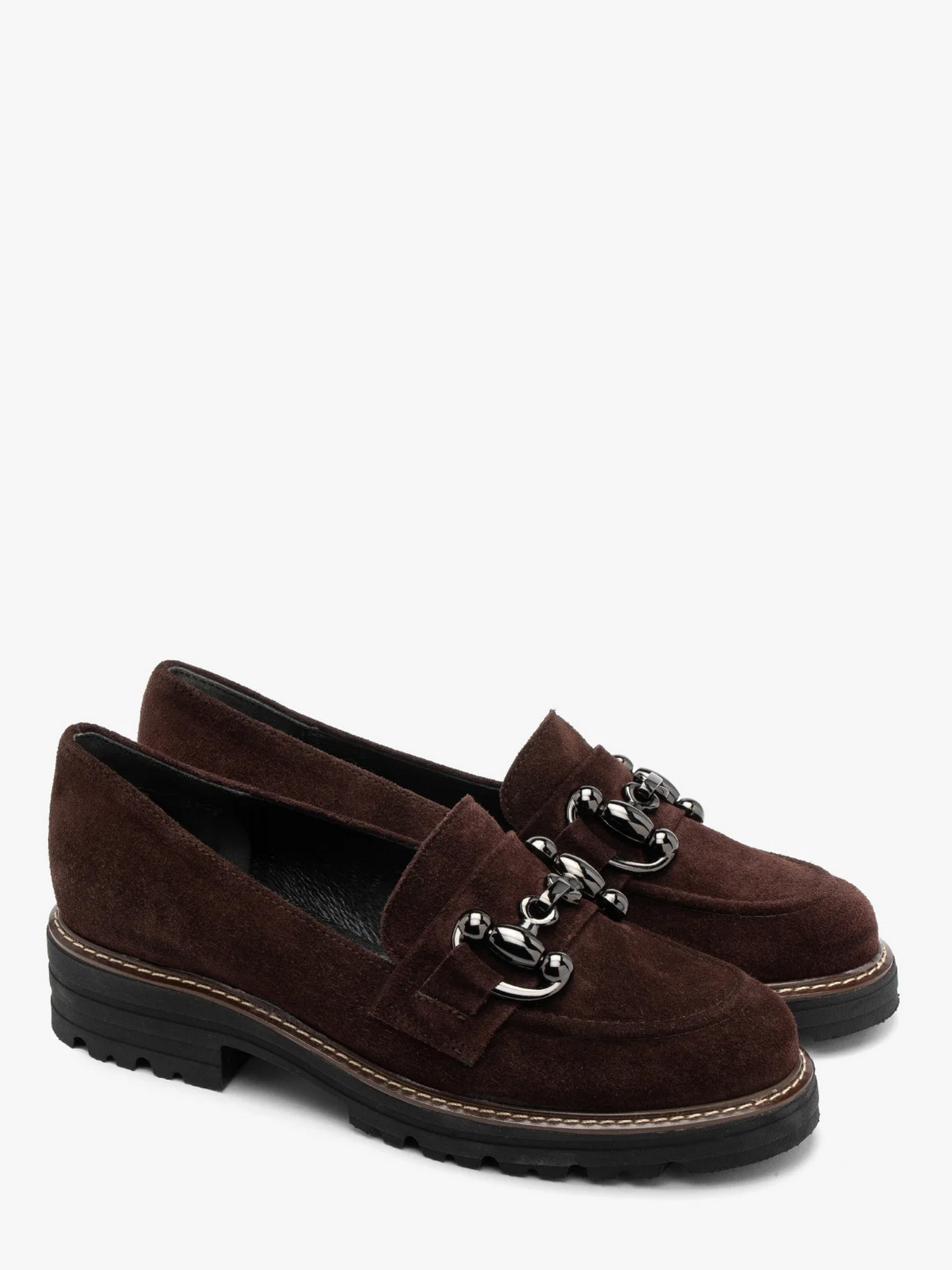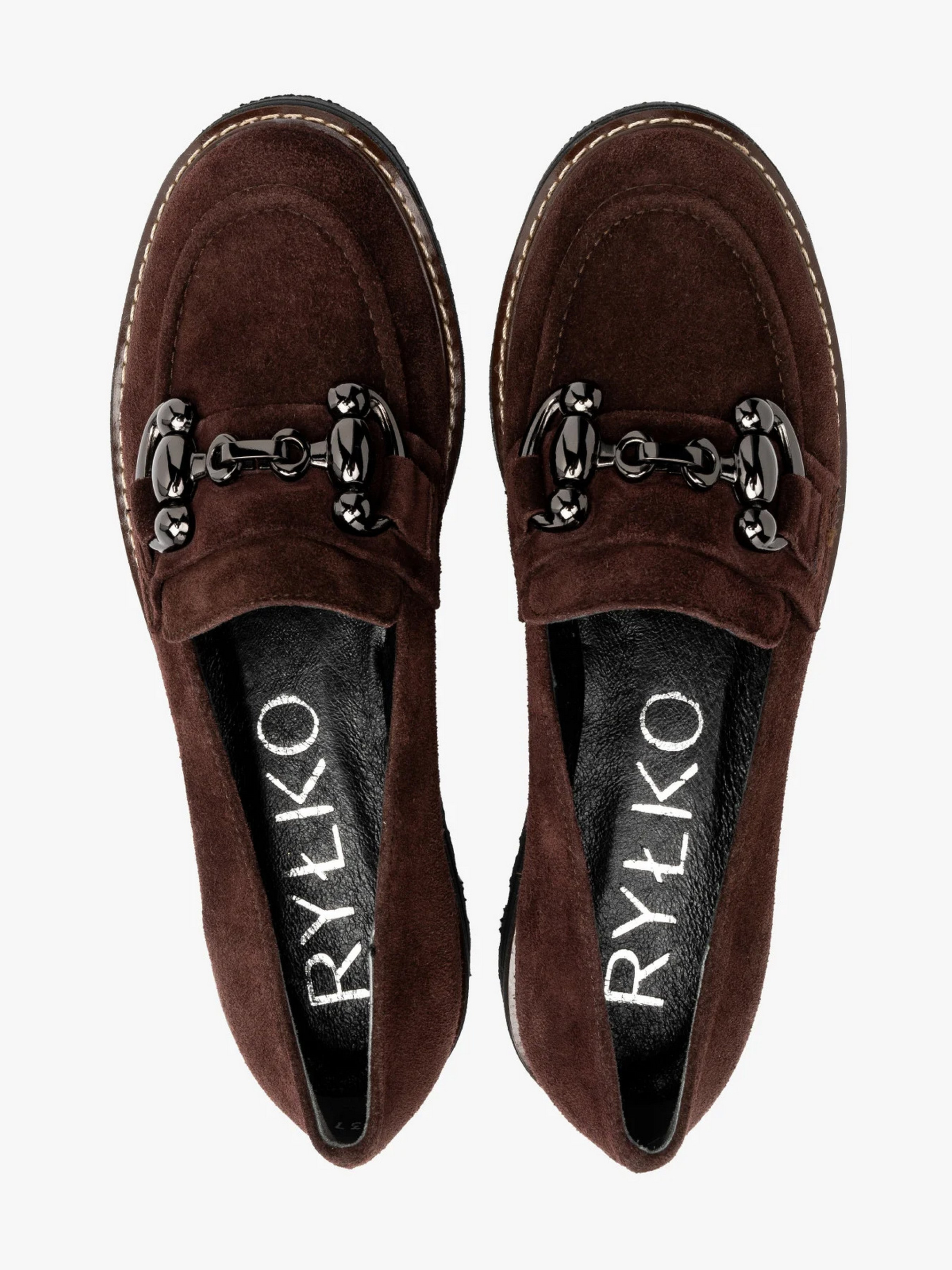 Замшеві туфлі - лофери польського виробника RYŁKO темно-коричневого (шоколадного) кольору. Модель виготовлена з натуральної замші високої якості. Всередині шкіряна підкладка та устілка. Носок круглий, висота підборів 4 см. Модель прикрашена декоративною пряжкою. Підошва зроблена за технологією R.FLY - це надзвичайно легка і пружна підошва, виконана з пінки ЕВА. Забезпечує високий комфорт користування. Непориста, легко чиститься вологою ганчіркою. В цій моделі під устілкою є піна, що амортизує та містить активоване вугілля. Це надає їй сильні антибактеріальні та протигрибкові властивості. Піна забезпечує циркуляцію повітря та вбирає зайву вологу. М'яка піна – чудово амортизує і щільно прилягає до стопи, забезпечуючи їй додаткову підтримку. Ці властивості значно підвищують комфорт та зручність користування взуттям.