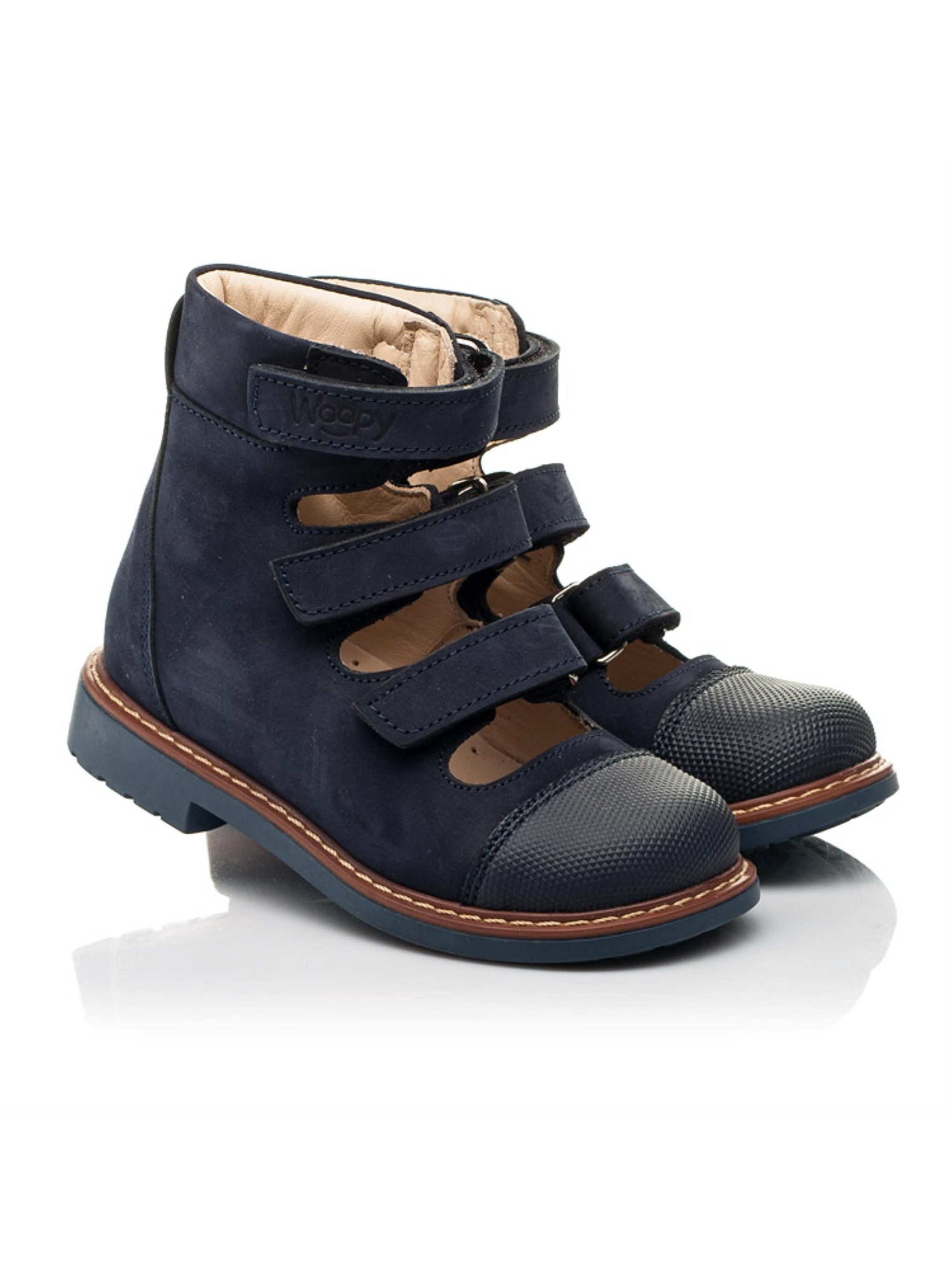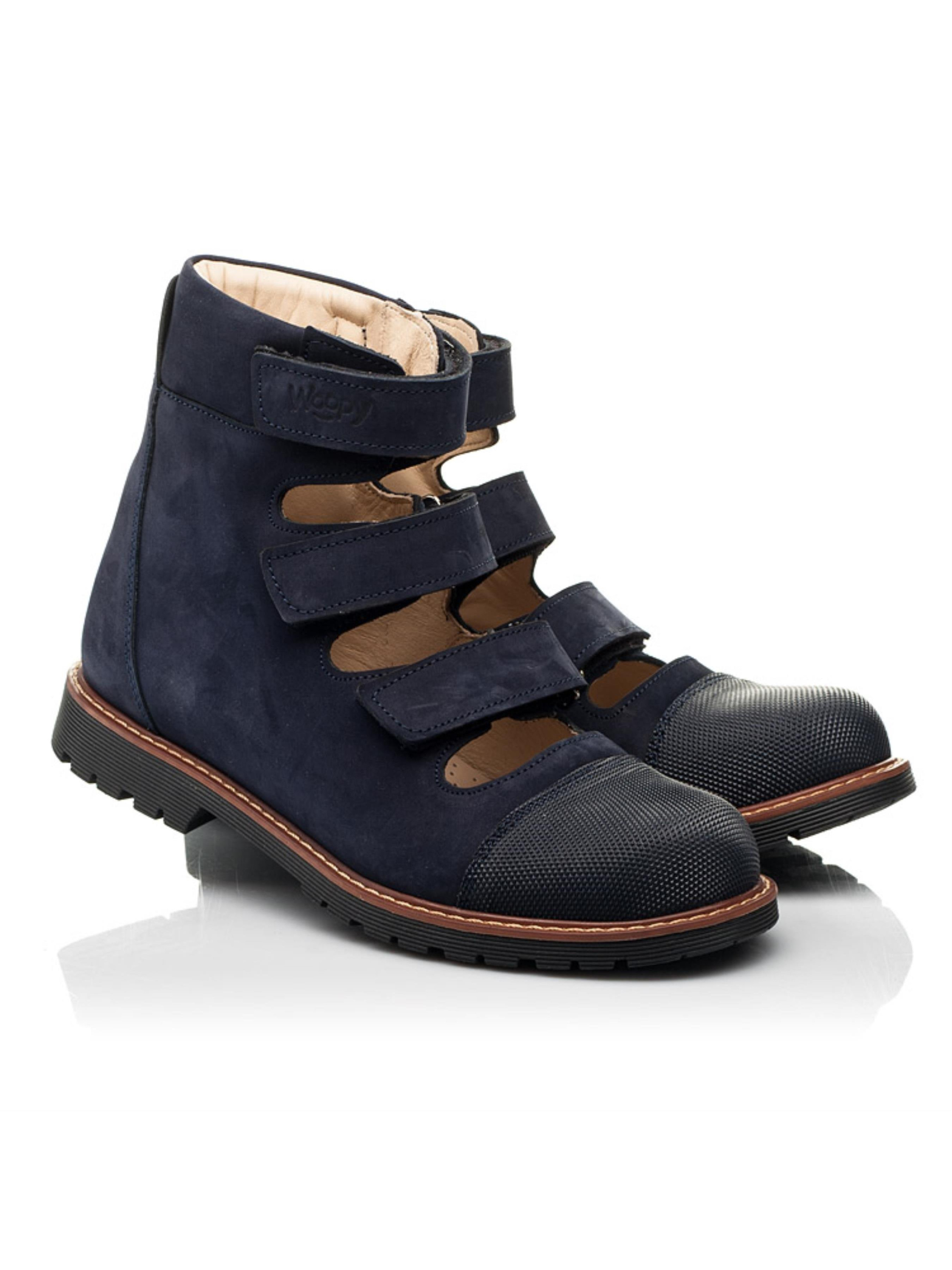 Woopy Orthopedic представлений колекцією босоніжок, туфель, ортопедичних босоніжок/туфель з високим берцем, демісезонних та зимових черевик, які забезпечують профілактику та лікування плосковальгусної деформації стопи і мають важливі ортопедичні елементи дитячого взуття: каблук Томаса, жорсткий задник, супінатор та анатомічно правильну устілку.