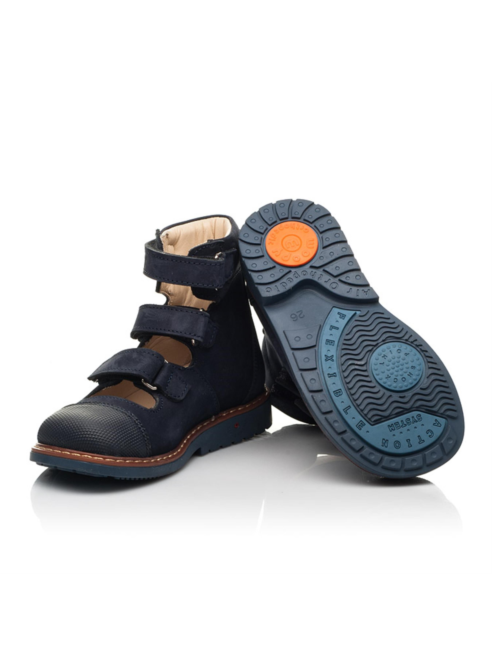 Дитячі ортопедичні туфлі для хлопчика створені з натурального нубука благородного синього кольору, матеріал підкладки та устілки - натуральна високоякісна шкіра. Для зручності взування в якості застібки використовуються три надійні липучки, які прискорять та спростять процес взування. Підліткові туфлі для хлопчика мають усі важливі ортопедичні складові дитячого взуття: каблук Томаса, жорсткий задник, супінатор та анатомічно правильну устілку. Ніжки від натирання вбережуть дві м'які подушечки. Носочок в туфлях захищений вставкою з сучасного штучного матеріалу "неубивайкою". По периметру підошва оздоблена декоративним кантом коричневого кольору.