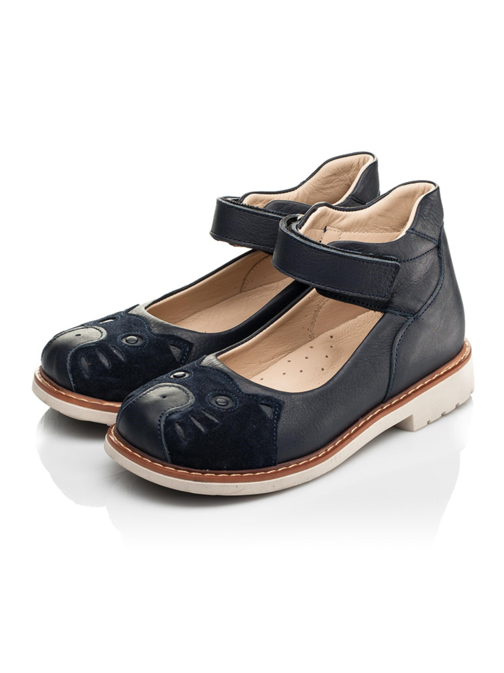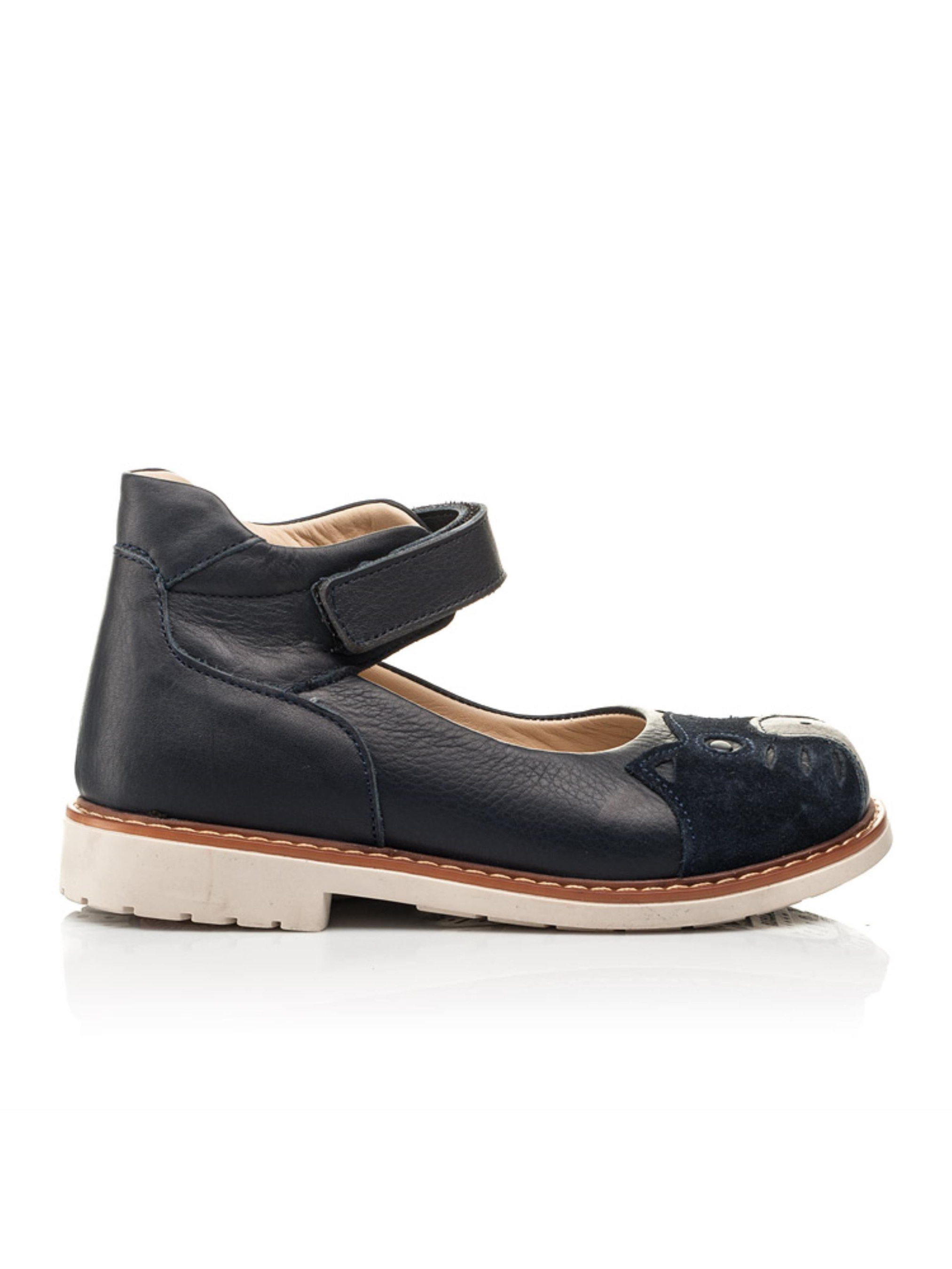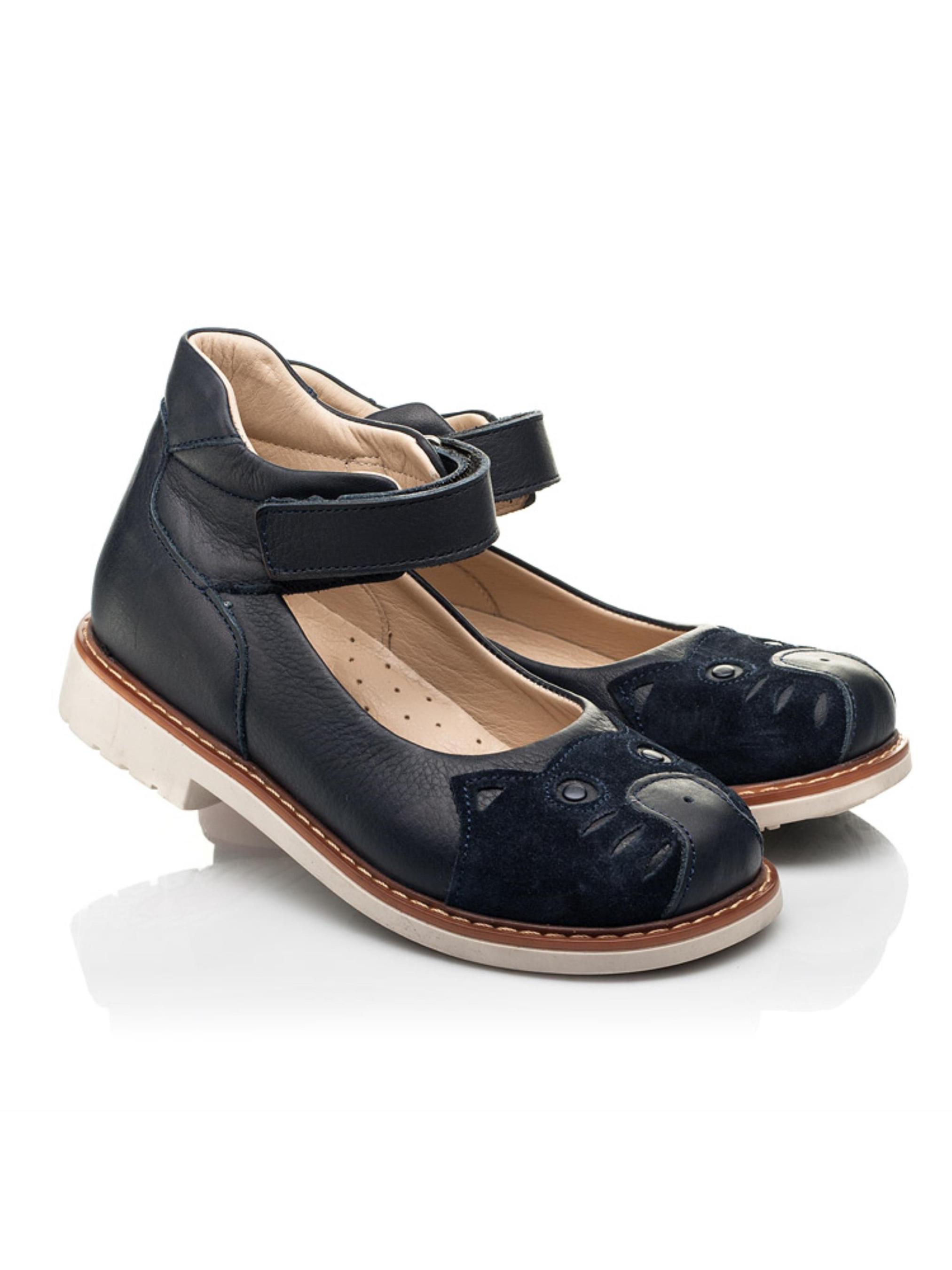 Ми не змогли не повторити таку модель туфель з улюбленим зображенням милої мордочки котика в дещо іншому виконанні. Дитячі туфлі для дівчинки пошиті з натуральної шкіри синього кольору, матеріал підкладки та устілки - натуральна шкіра. Беззаперечною особливістю моделі та 100% окрасою виступає зображення котика з натуральної замші для контрасту фактури матеріалів. Аби Вашій крихітці було максимально зручно взуватися в якоті застібки передбачена надійна липучка. А комфорт улюбленим дитячим стопам гарантують такі важливі складові дитячого взуття: каблук Томаса, жорсткий задник, анатомічно правильна устілка та супінатор. Контрастним акцентом моделі виступає бежева підошва, яка відлита з якісної термопластичної резини.