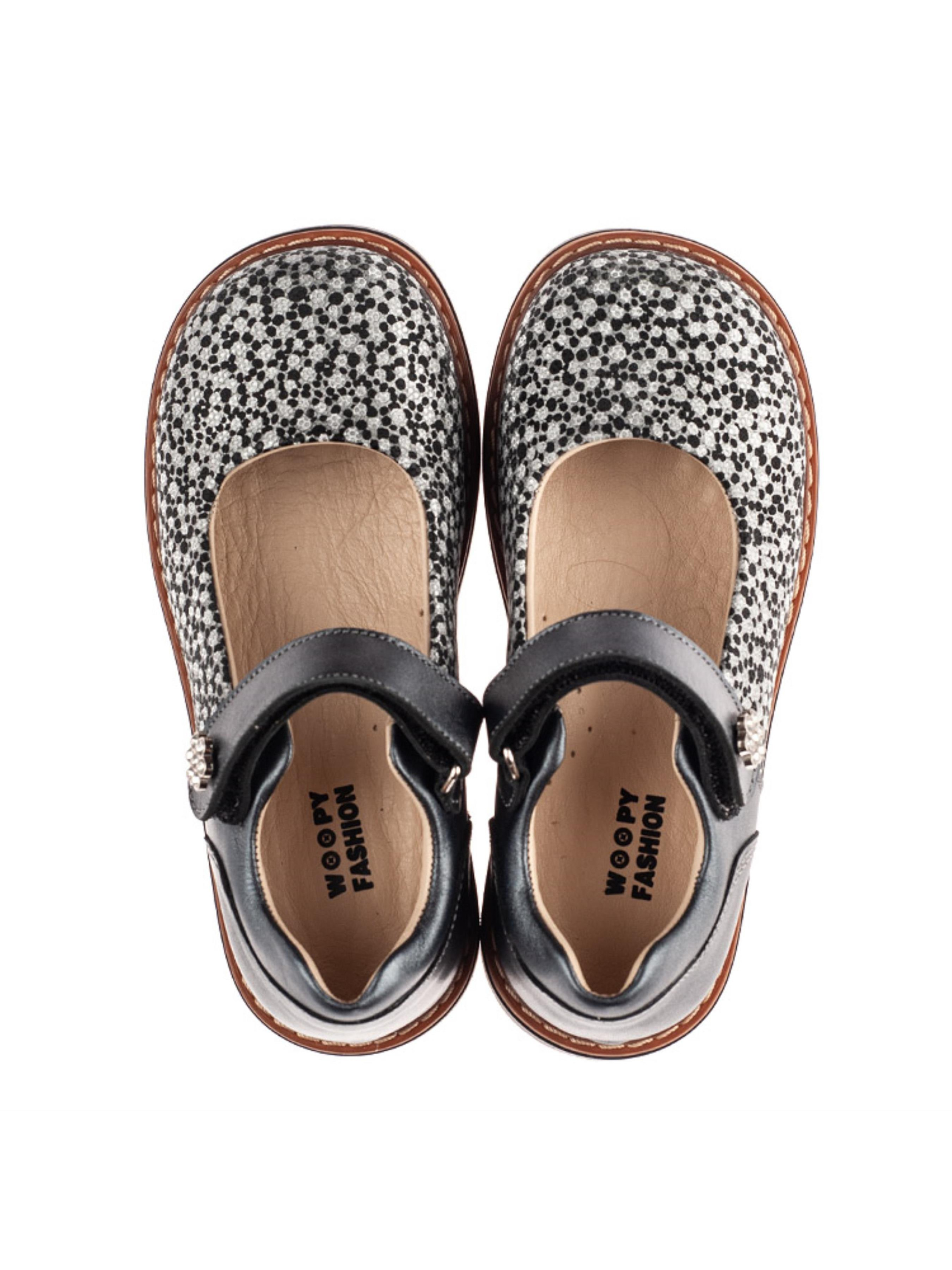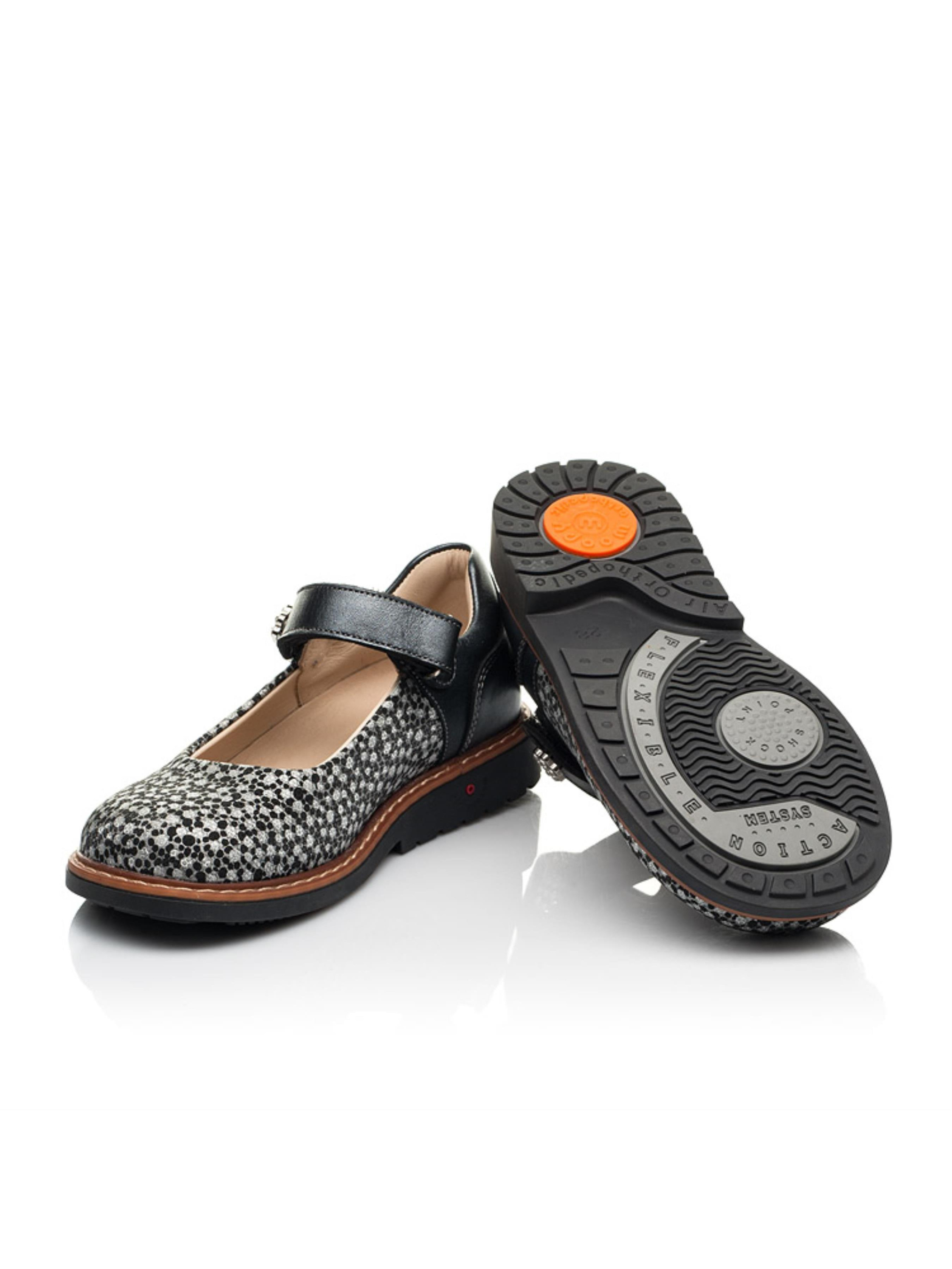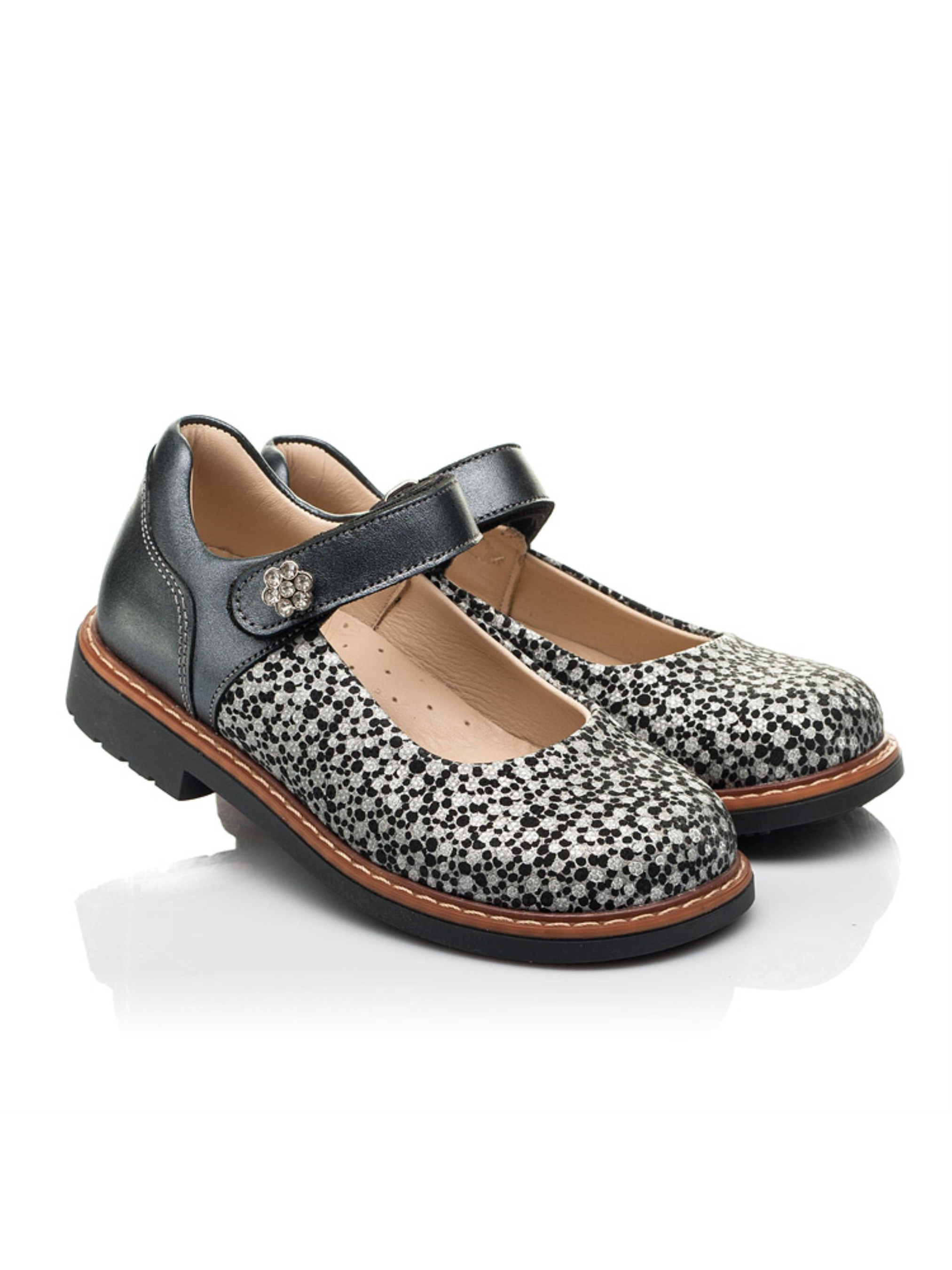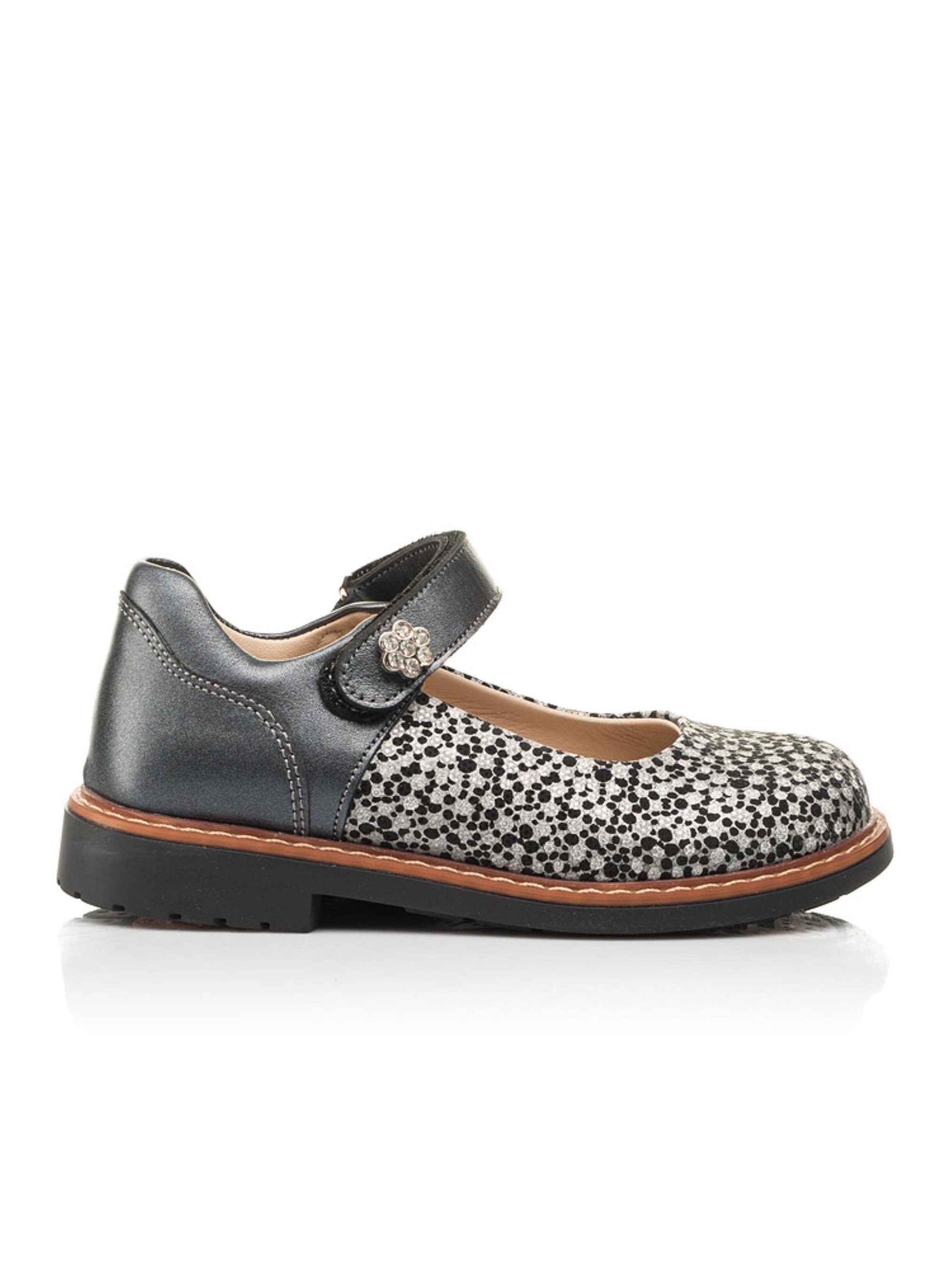 Такі оригінальні туфлі для дівчинки - ідеальний варіант для маленькоїї красуні, яка прагне створити унікальний образ. Дитячі туфлі для дівчинки пошиті з виключно натуральних матеріалів. Матеріал верху - натуральна гладка шкіра сірого кольору та натуральний нубук з напиленням срібно-чорного кольору. Матеріал підкладки та устілки - високоякісна натуральна шкіра. Фізіологічно правильне положення ніжки забезпечать такі елементи дитячого взуття: каблук Томаса, жорсткий задник, супінатор та анатомічно правильна устілка. Швидкість та зручність взування гарантує застібка-липучка. З такою парою туфель Ваша дівчинка буде зіркою в колі подруг.