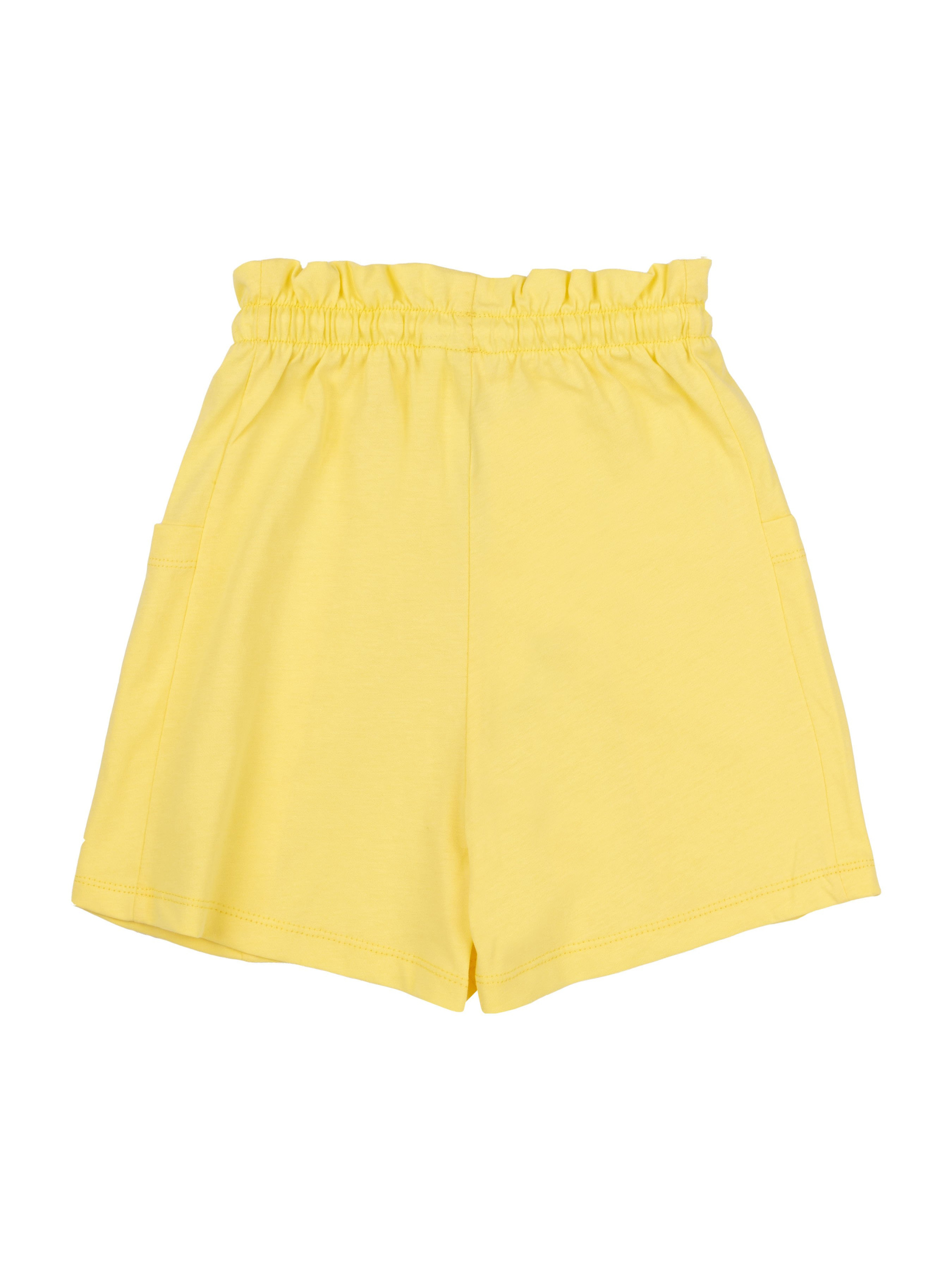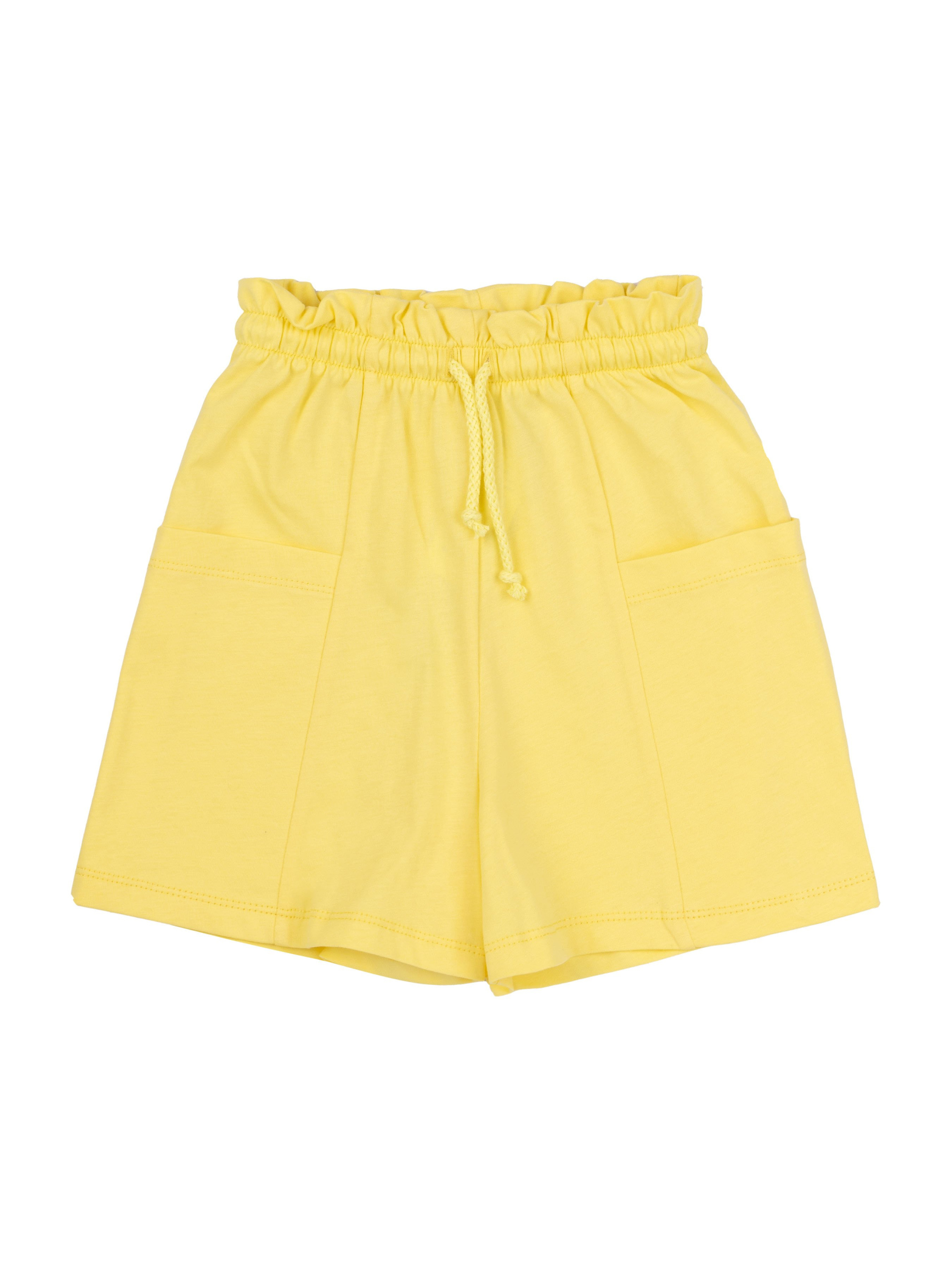 Шорти прямого силуету, короткі. На передніх та задніх половинка вертикальні членування. По бічних швах вшивні кишені. Пояс суцільнокроєний, з рюшею та всередині з резинкою і шнуром.