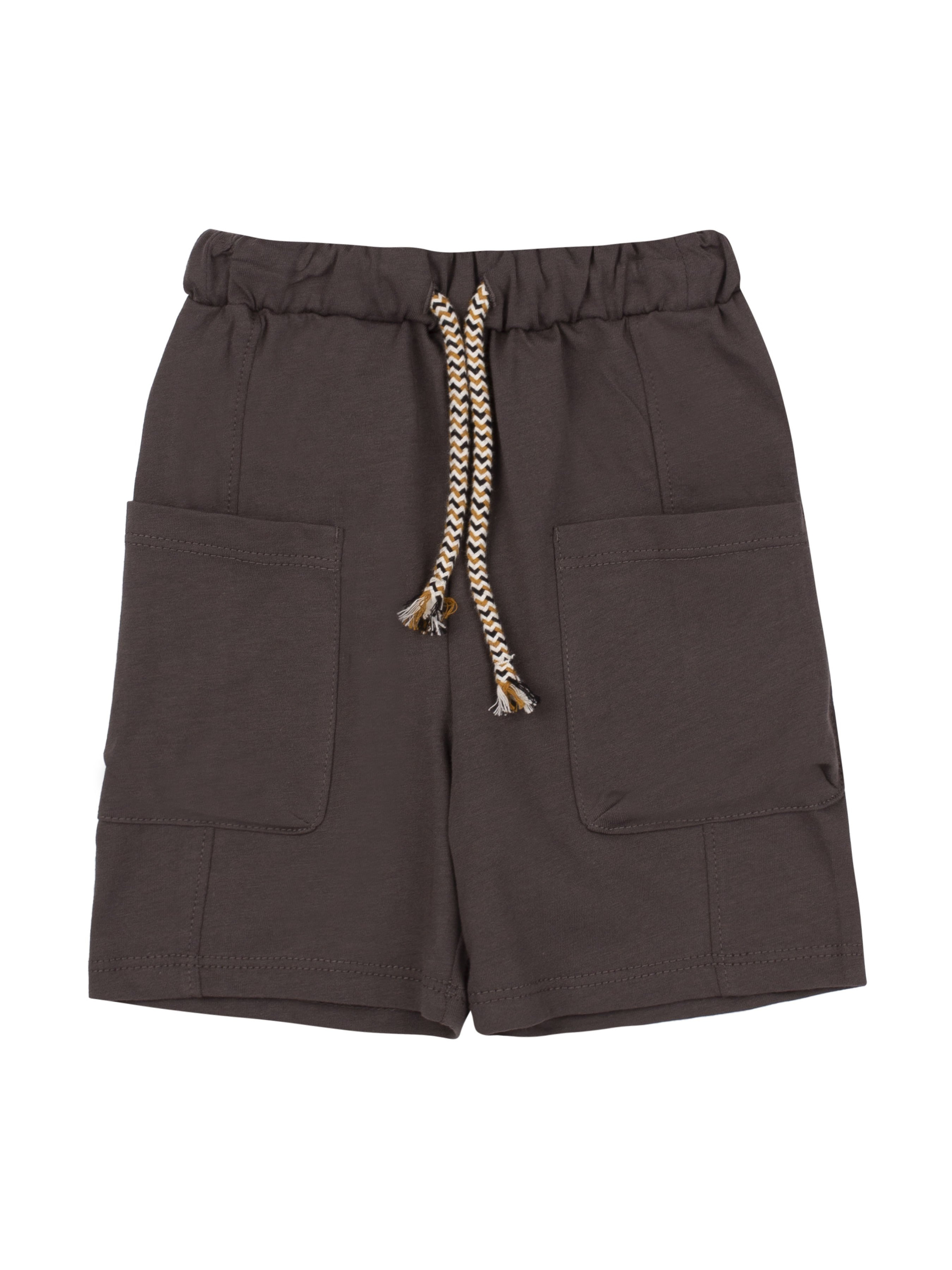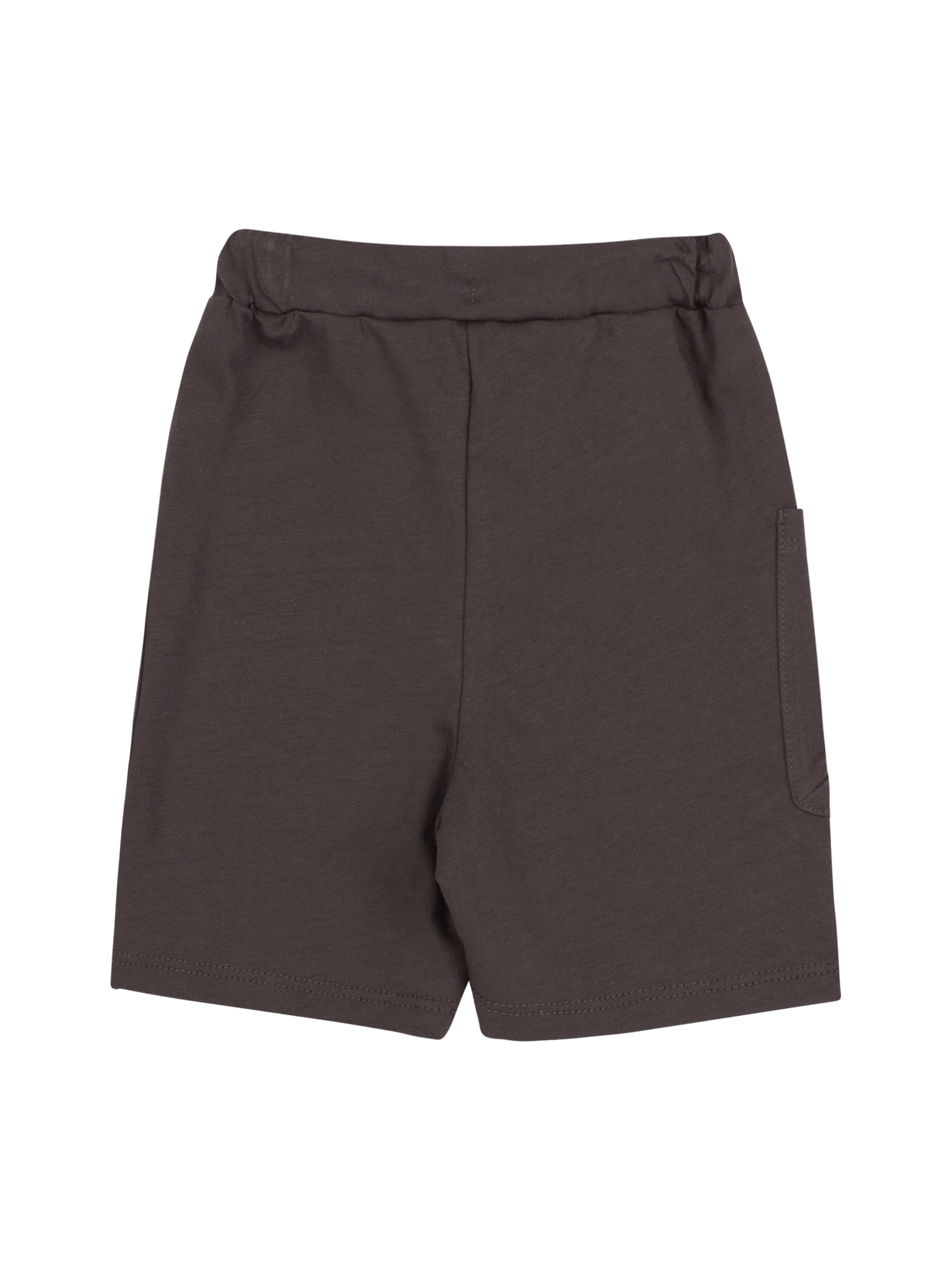 Шорти прямого силуету. Верхній зріз на пришивному поясі з резинкою та шнуром всередині. Передні половинки з накладними кишенями. Довжина шортів - до колін.