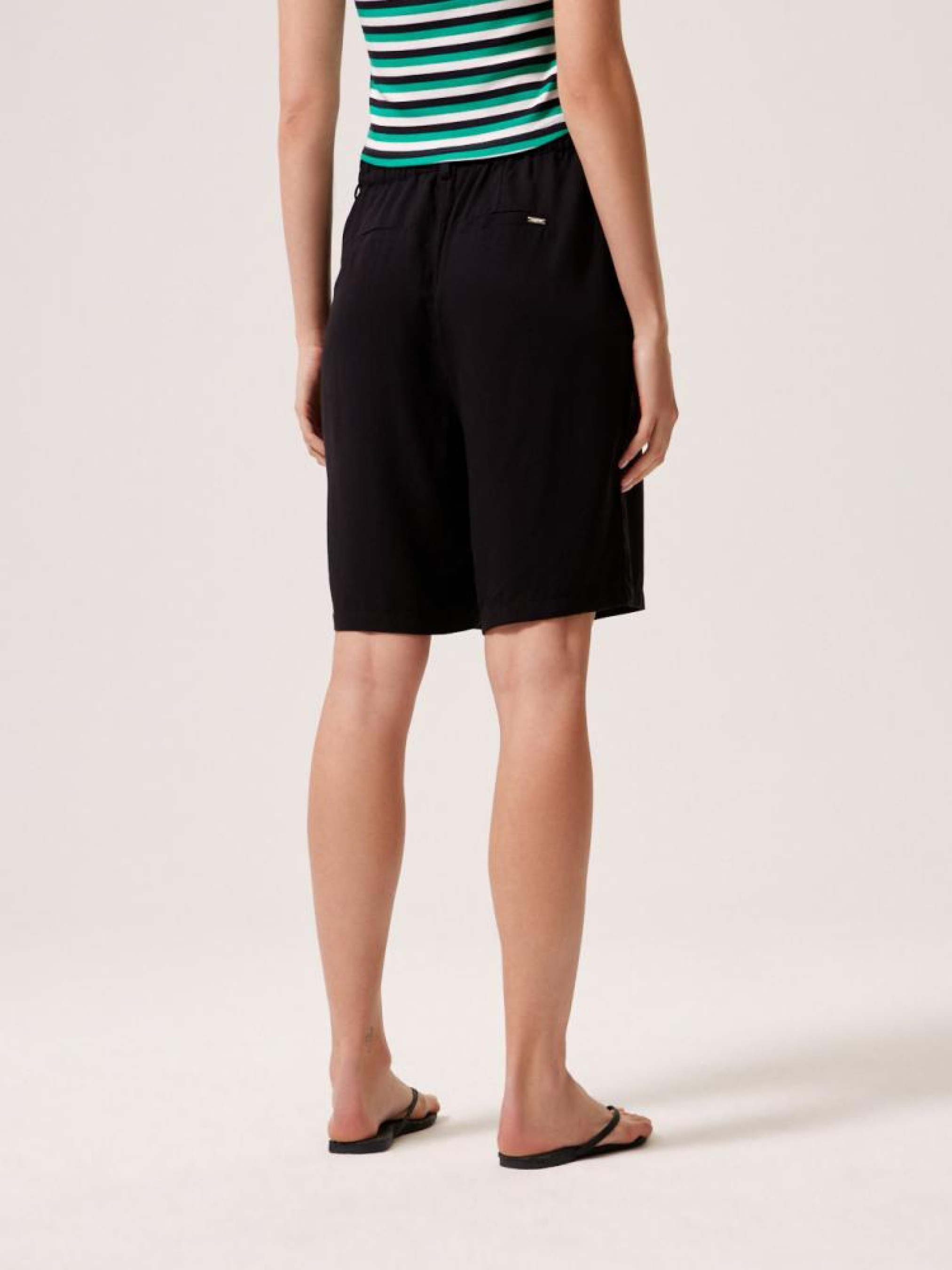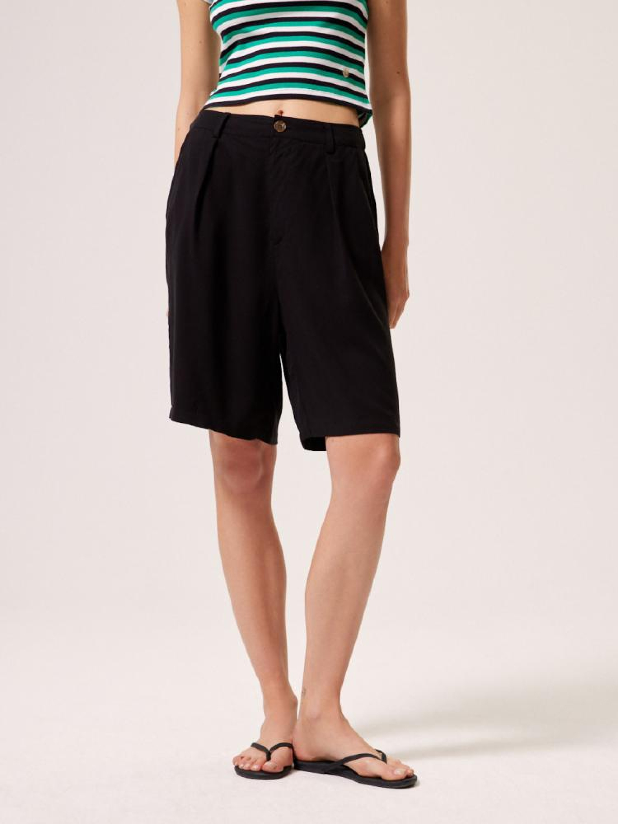 Шорти DUMAN 10044404 Тканинні шорти з широкими штанинами: - завищена талія, - гумка ззаду додана для комфорту та кращої посадки на талії, - декоративні складки спереду, - широкі штанини, довжина вище коліна, - доступні в чорному кольорі. Сезон: Весна/Літо 2024 Склад: 80% віскоза, 20% ліоцелл Догляд: - прання при максимум 30 °С - не відбілювати - не сушити в сушильній машині - прасувати максимум при темп. 110 °С - не хімчистка Розмір на моделі - S Зріст моделі - 180 см РОЗМІР: XS*, S, М, L. XL, Ширина пояса: 34,50 см, 36,50 см, 38,50 см, 40,50 см, 42,50 см, Внутрішня довжина ноги: 22,00 см, 22,00 см, 22,00 см, 22,00 см, 22,00 см, Ширина стегна: 34,70 см, 35,70 см, 36,70 см, 37,70 см, 38,70 см, ШИРИНА НОГИ ЗНИЗУ: 31,00 см, 32,00 см, 33,00 см, 34,00 см, 35,00 см, Ширина стегон: 55,00 см, 57,00 см, 59,00 см, 61,00 см, 63,00 см,