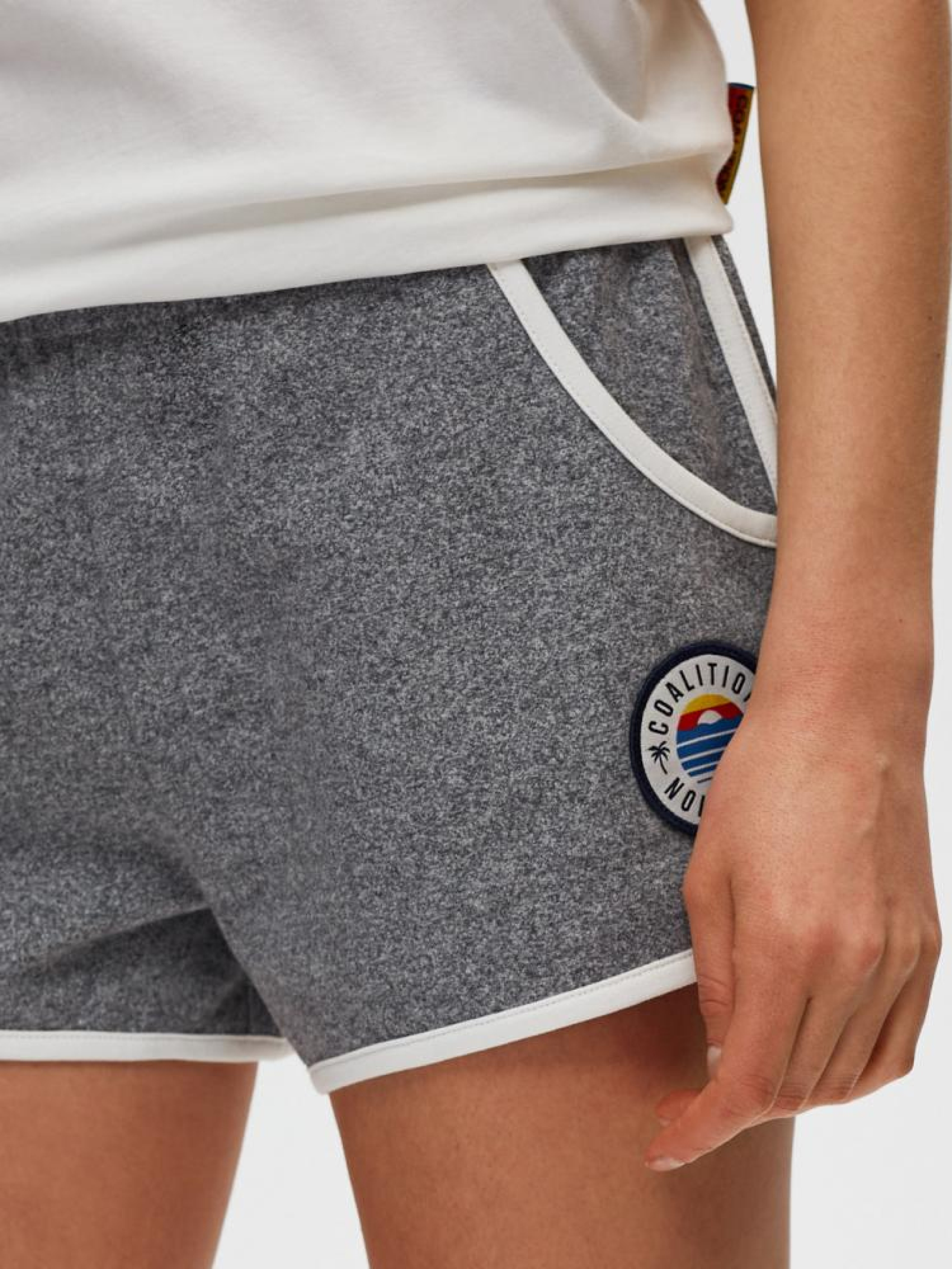 Шорти бавовняні короткі: - гумка на талії, - з вишитим значком спереду, - лінія штанини та кишені з контрастним оздобленням, - спортивний фасон, - з кишенями спереду, - незамінні для їзди на велосипеді та бігу, - у наявності у сірому. Сезон: Весна/Літо. Склад: 100% бавовна.