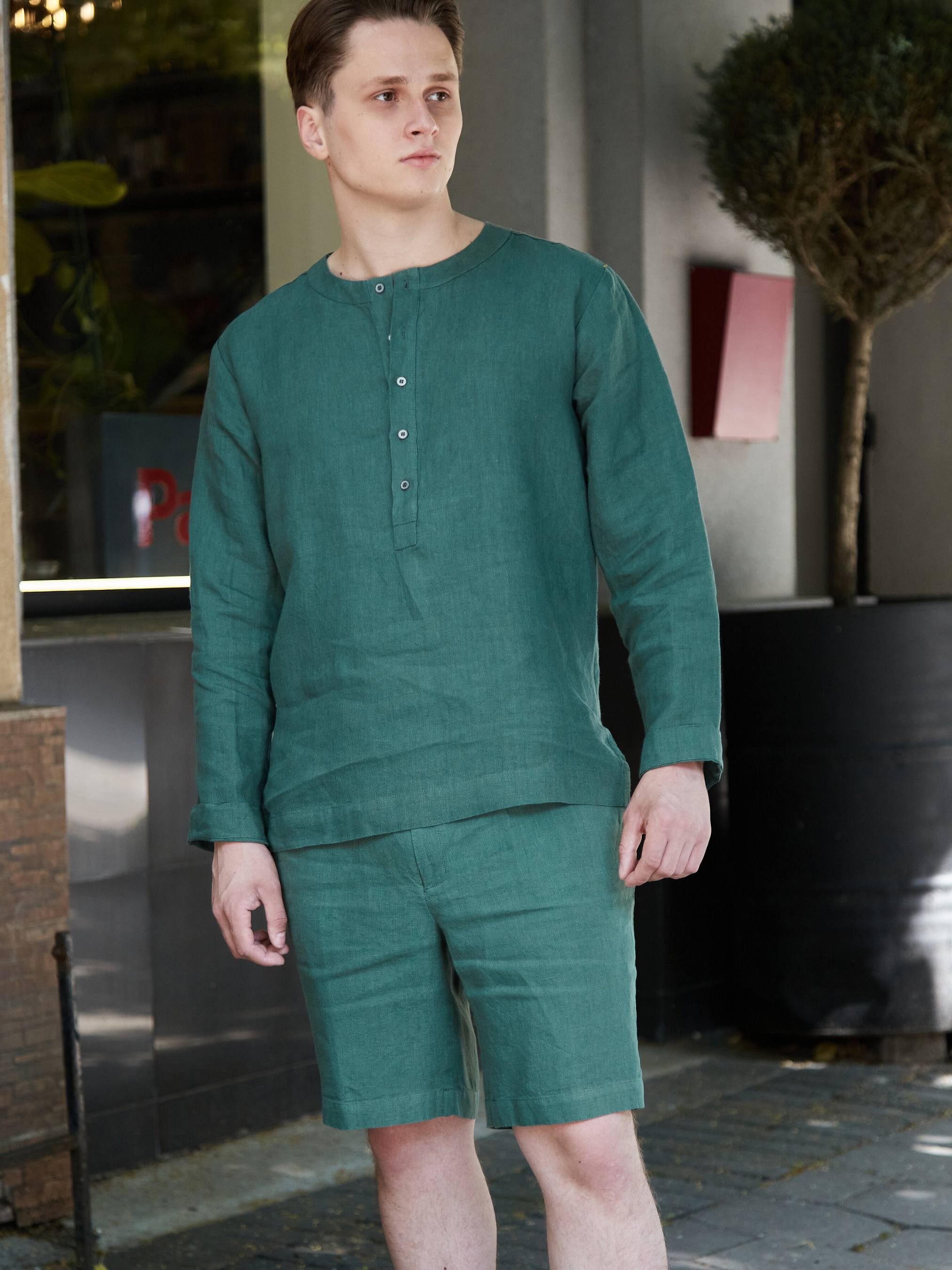 Зручні шорти – це must have в літню пору, а коли вони виконані зі 100% льону, то автоматично стають незамінним елементом гардеробу. Лляні шорти зеленого кольору довжиною до колін, мають застібку у вигляді блискавки та ґудзика, а також дві кишені по боках та імітовану кишеню на задній частині виробу. Вони легкі, майже невідчутні на тілі, в своєму складі містять 100% льон. Такі шорти можна комбінувати із стильними сорочками з цієї ж колекції, таким чином ви отримаєте повноцінний образ. Потурбуйтесь про свій комфорт із стильними лляними образами від «Едельвіка».