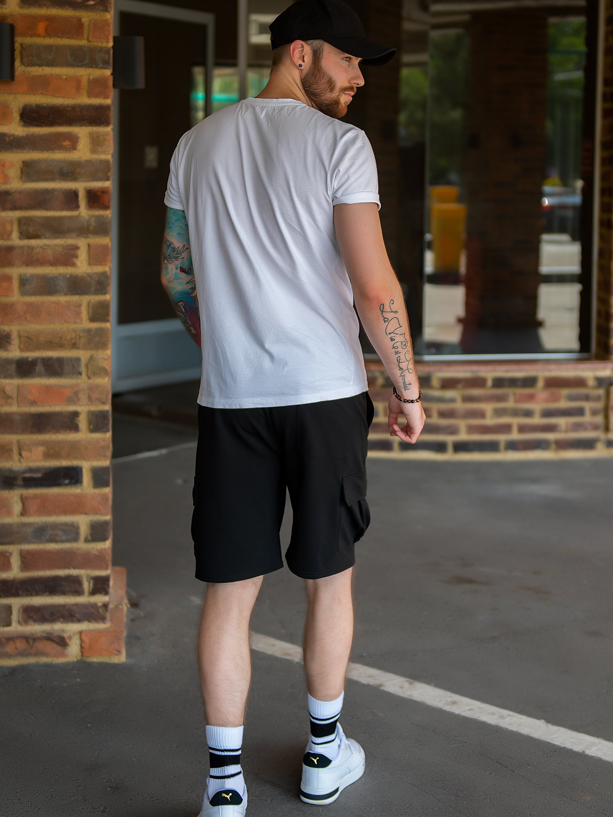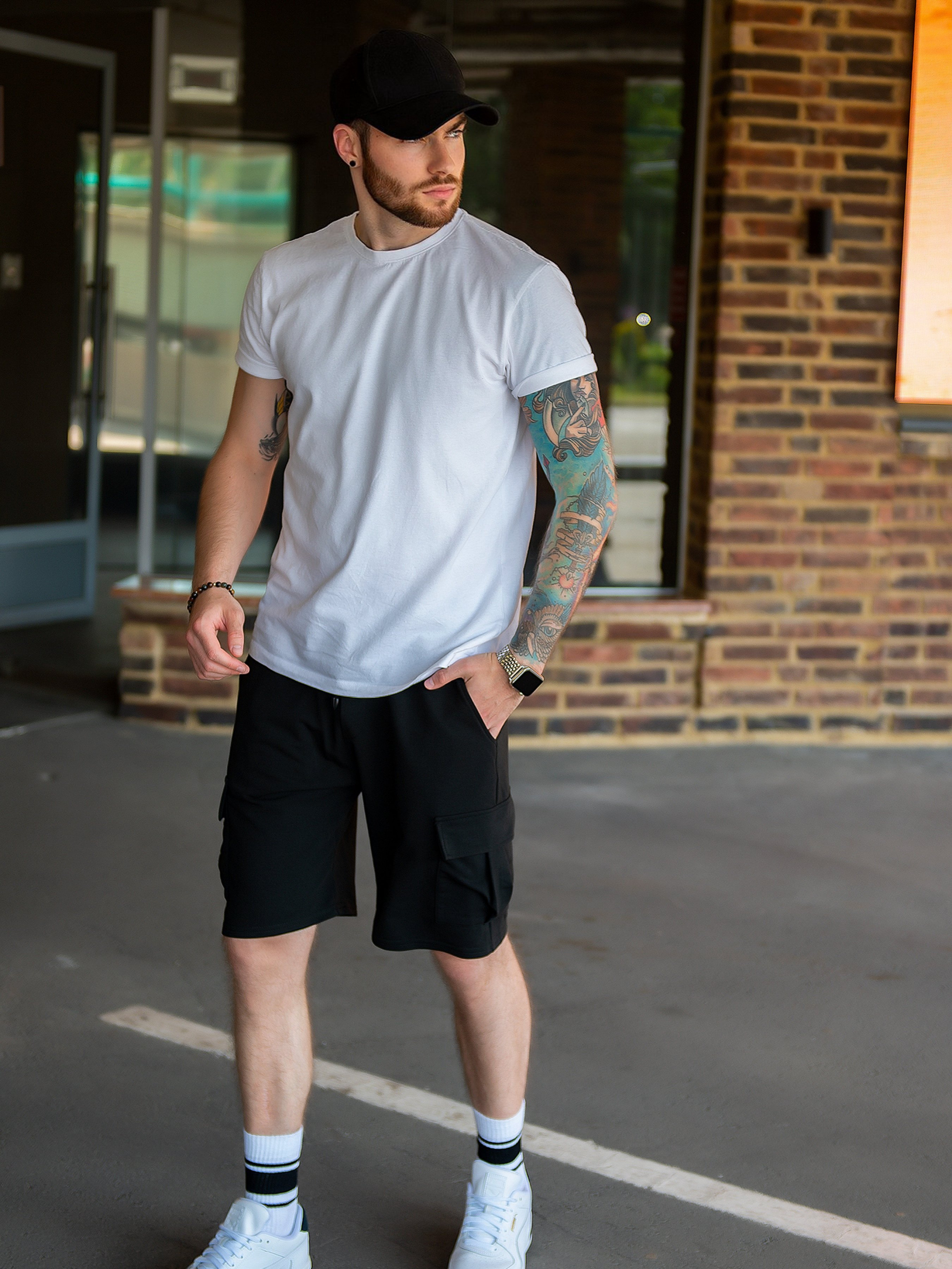 Свободні шорти моделі карго оснащені бічними та накладними кишенями на клапанах. Шорти з довжиною до колін виконані із двонитного трикотажу чорного кольору. Модель прямого крою з поясною гумкою і тасьмою, що фіксує. Склад: 50% бавовна, 50% поліестер. Напівобхват: Талія: S (32-40), M (34-42), L (36-44), XL (38-46), Стегна: S (58), M (60), L (62), XL (64), Довжина виробу – 47, Довжина внутрішнього шва – 21, Тканина: Середньої еластичності.