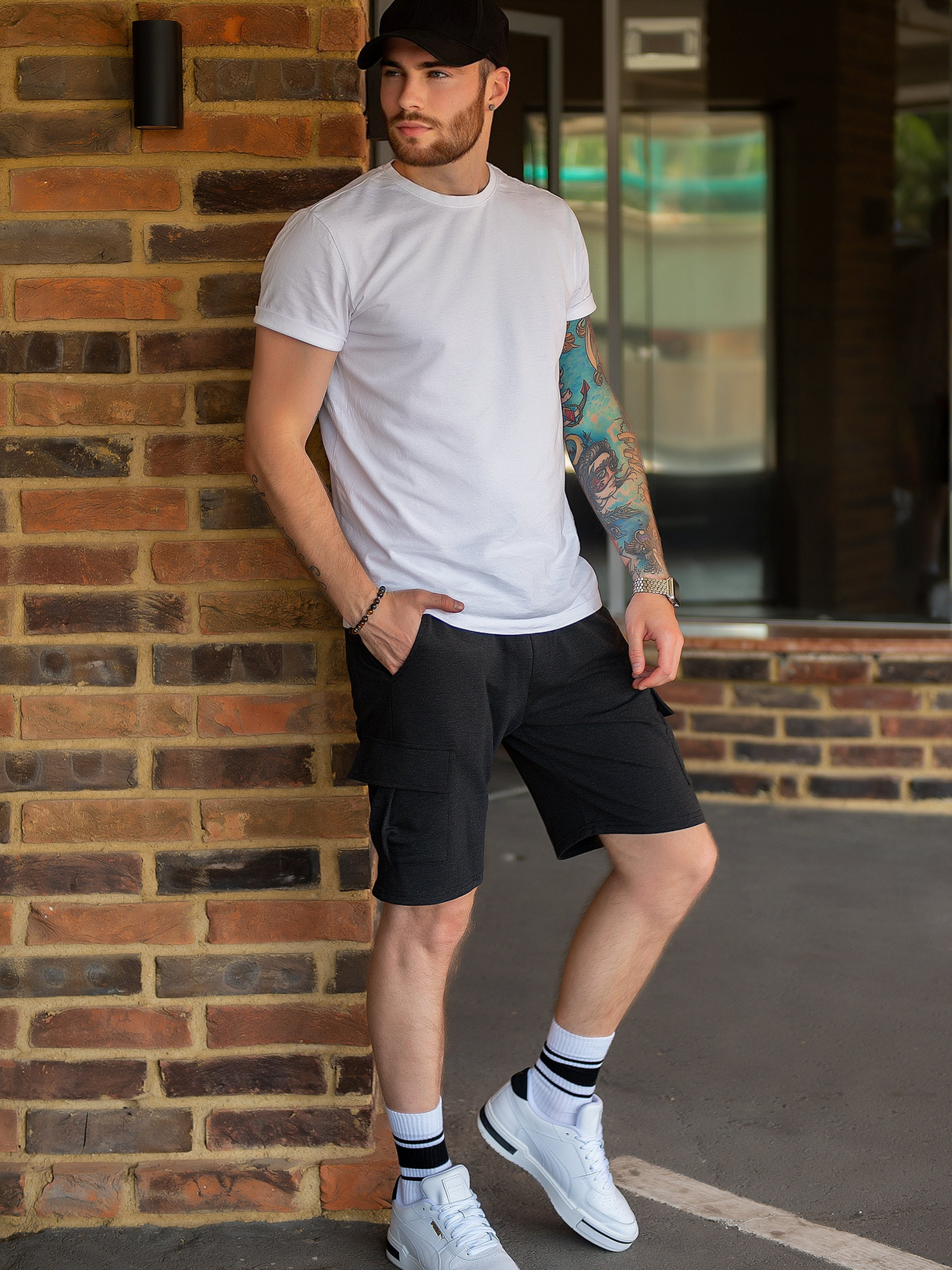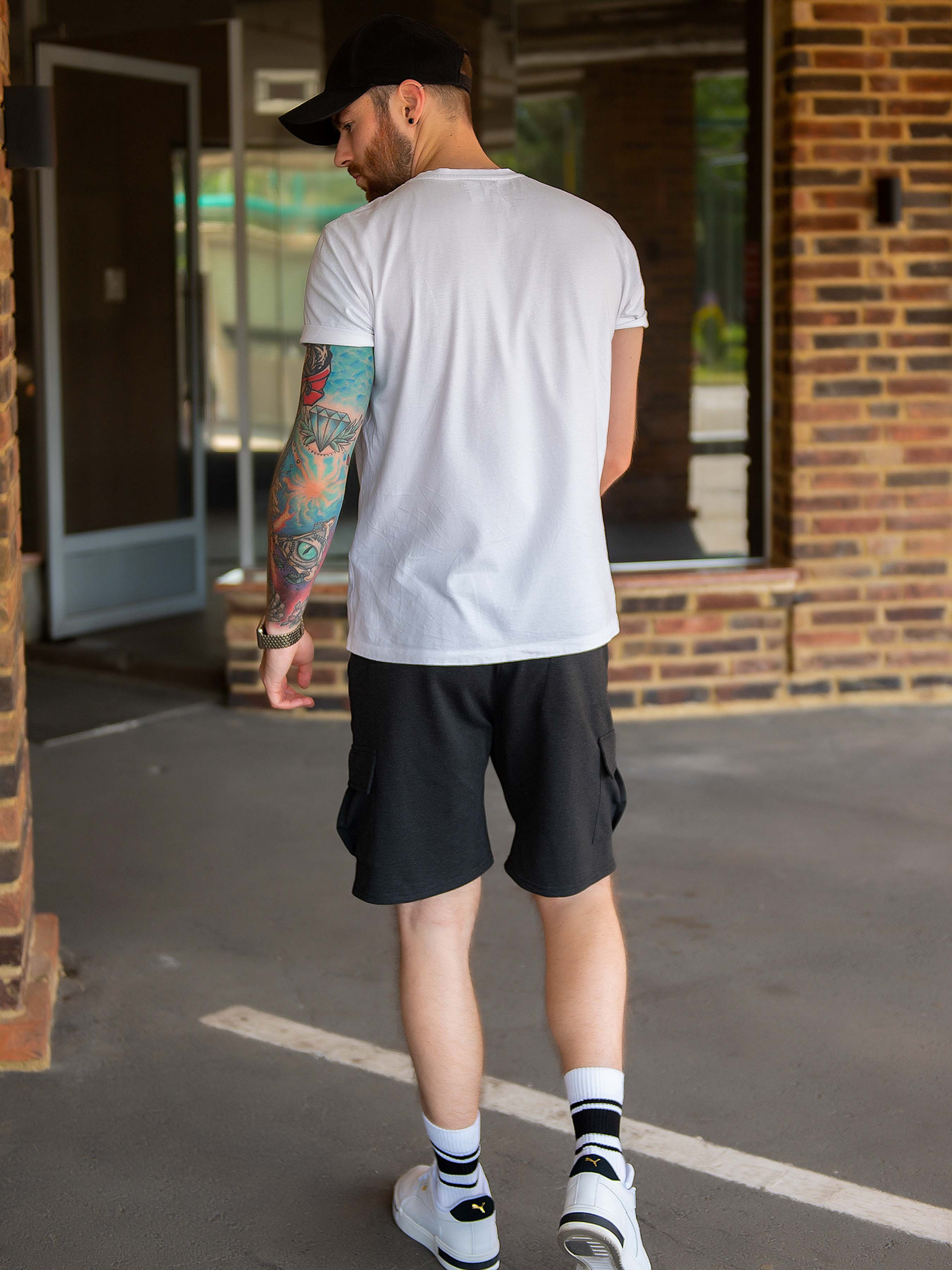 Темно-сірі шорти карго з бічними та накладними кишенями. Модель вільного крою з поясною гумкою та тасьмою. Модель довжиною до колін виконана з однотонного двонитного трикотажу. Склад: 50% бавовна, 50% поліестер. Напівобхват: Талія: S (32-40), M (34-42), L (36-44), XL (38-46), Стегна: S (58), M (60), L (62), XL (64), Довжина виробу – 47, Довжина внутрішнього шва – 21, Тканина: Середньої еластичності.