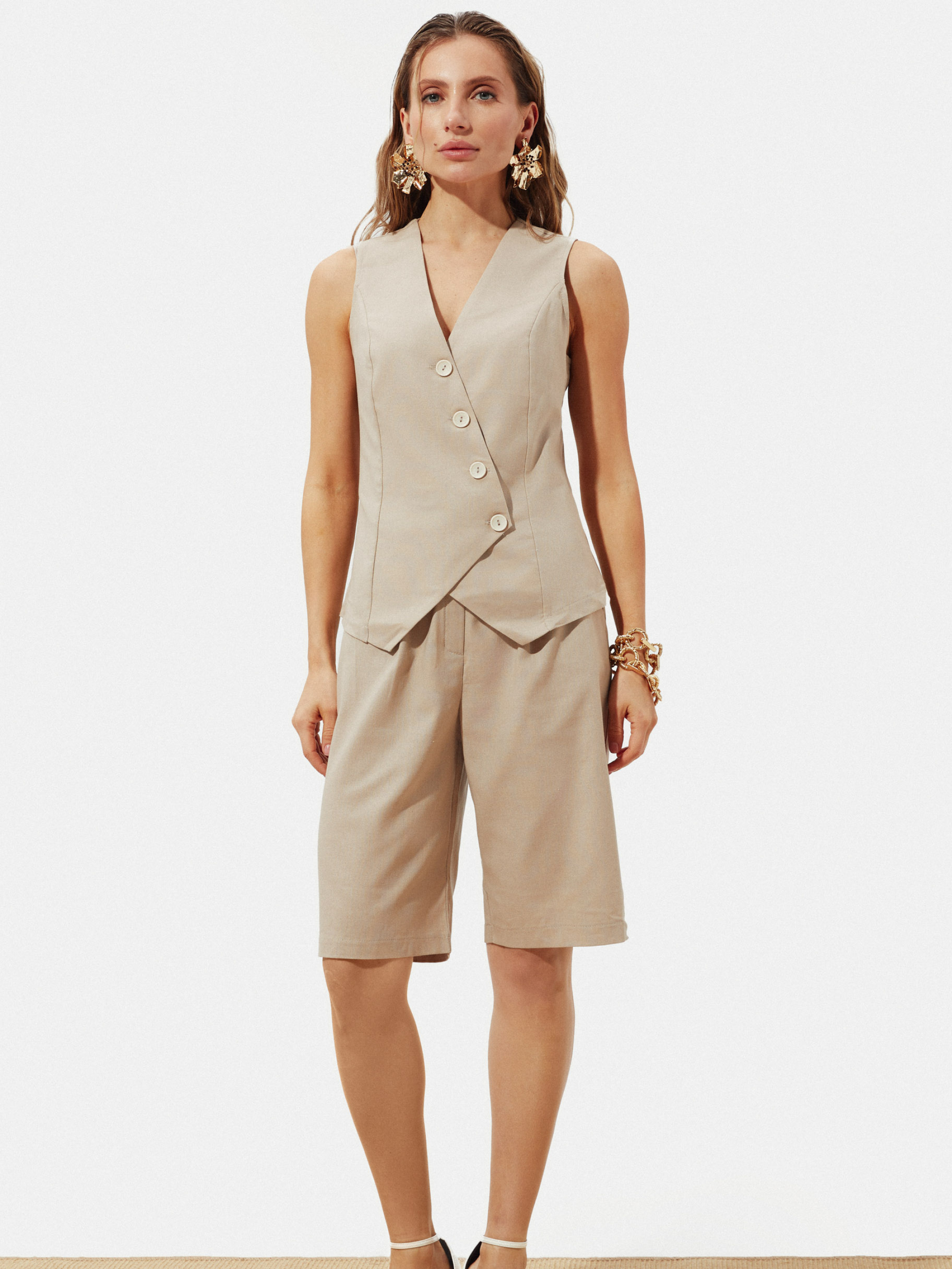 Шорти-бермуди Легкі та зручні шорти-бермуди з високою талією, які ідеально підкреслять вашу фігуру, створюючи витончений і сучасний образ. Вільний крій забезпечує свободу рухів, а практичні кишені додають зручності для повсякденного носіння. Еластичний пояс надає можливість комфортної посадки без зайвого тиску. Матеріал: виготовлені з натурального льону з домішком віскози, ці шорти поєднують у собі найкращі властивості обох тканин. Льон відомий своєю здатністю підтримувати оптимальний мікроклімат тіла — він чудово пропускає повітря, швидко вбирає і випаровує вологу, забезпечуючи відчуття свіжості навіть у найспекотніші дні. Віскоза надає тканині приємної м’якості та гладкості, роблячи шорти ніжними на дотик і комфортними для тривалого носіння. Разом вони утворюють легкий, дихаючий матеріал, який не мнеться і зберігає свій первісний вигляд. Догляд: ручне прання при температурі до 30 °C. Рекомендується уникати агресивних миючих засобів та машинного сушіння, щоб зберегти м'якість та форму виробу. Розмірна сітка: Розмір S-M: обхват талії 68–72 см, обхват стегон 92–96 см, довжина виробу 56 см. Розмір L-XL: обхват талії 76–81 см, обхват стегон 100–105 см, довжина виробу 56 см. Розмір XXL-3XL: обхват талії 86–91 см, обхват стегон 110–115 см, довжина виробу 57 см.